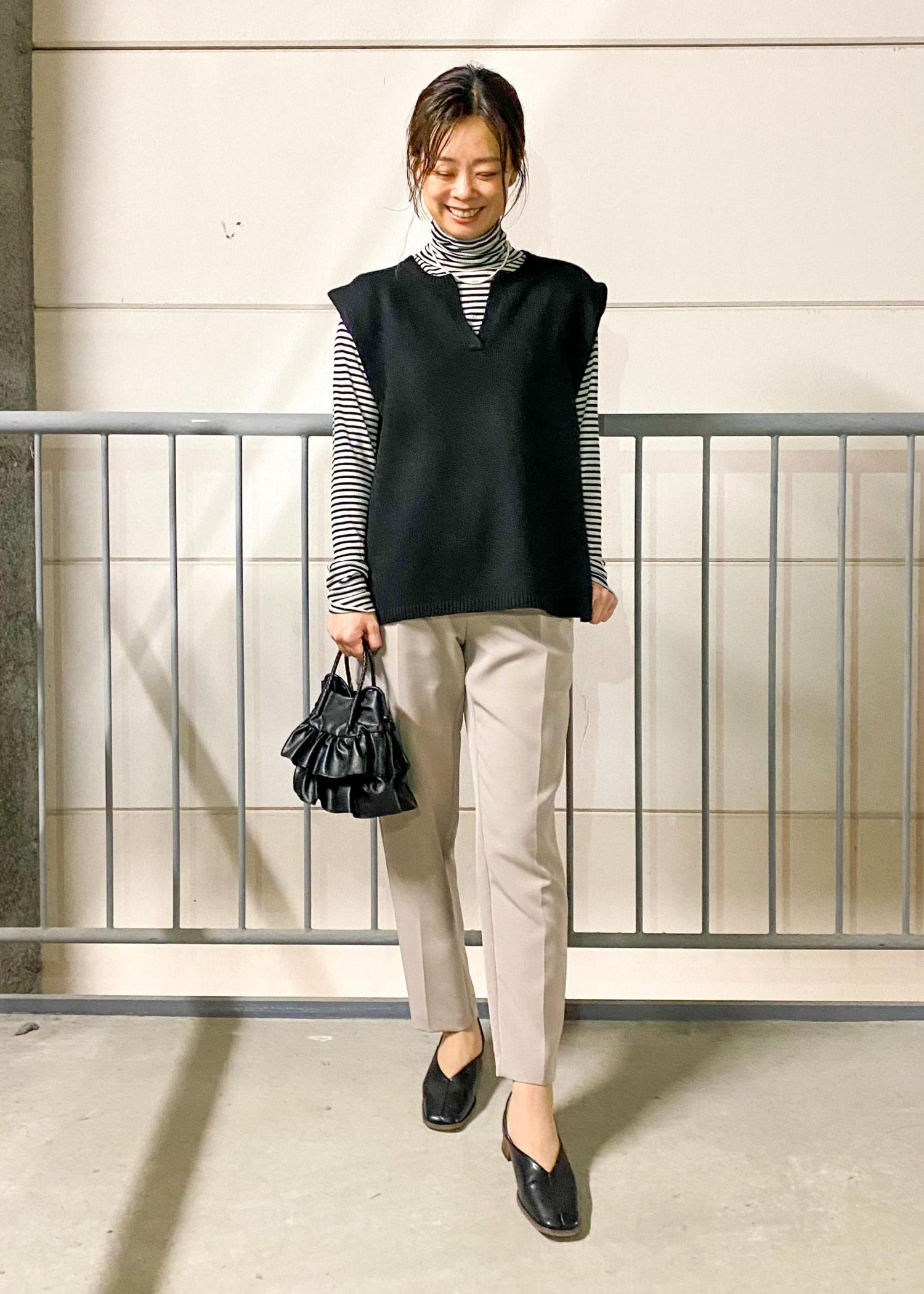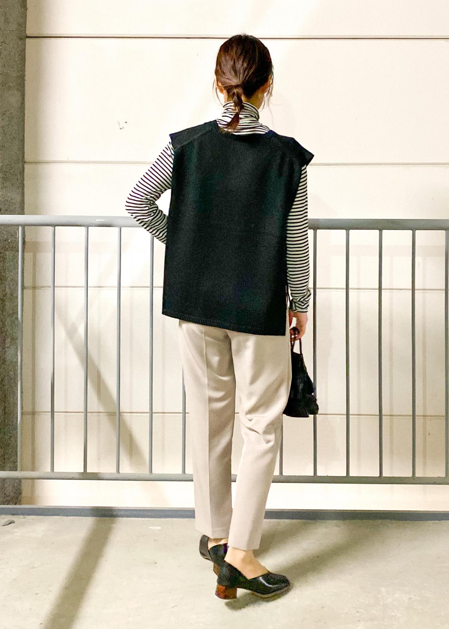 キレイめにももちろん使えますが、ボーダーやベストなど組み合わせ次第でカジュアルな印象にも使える万能パンツです!