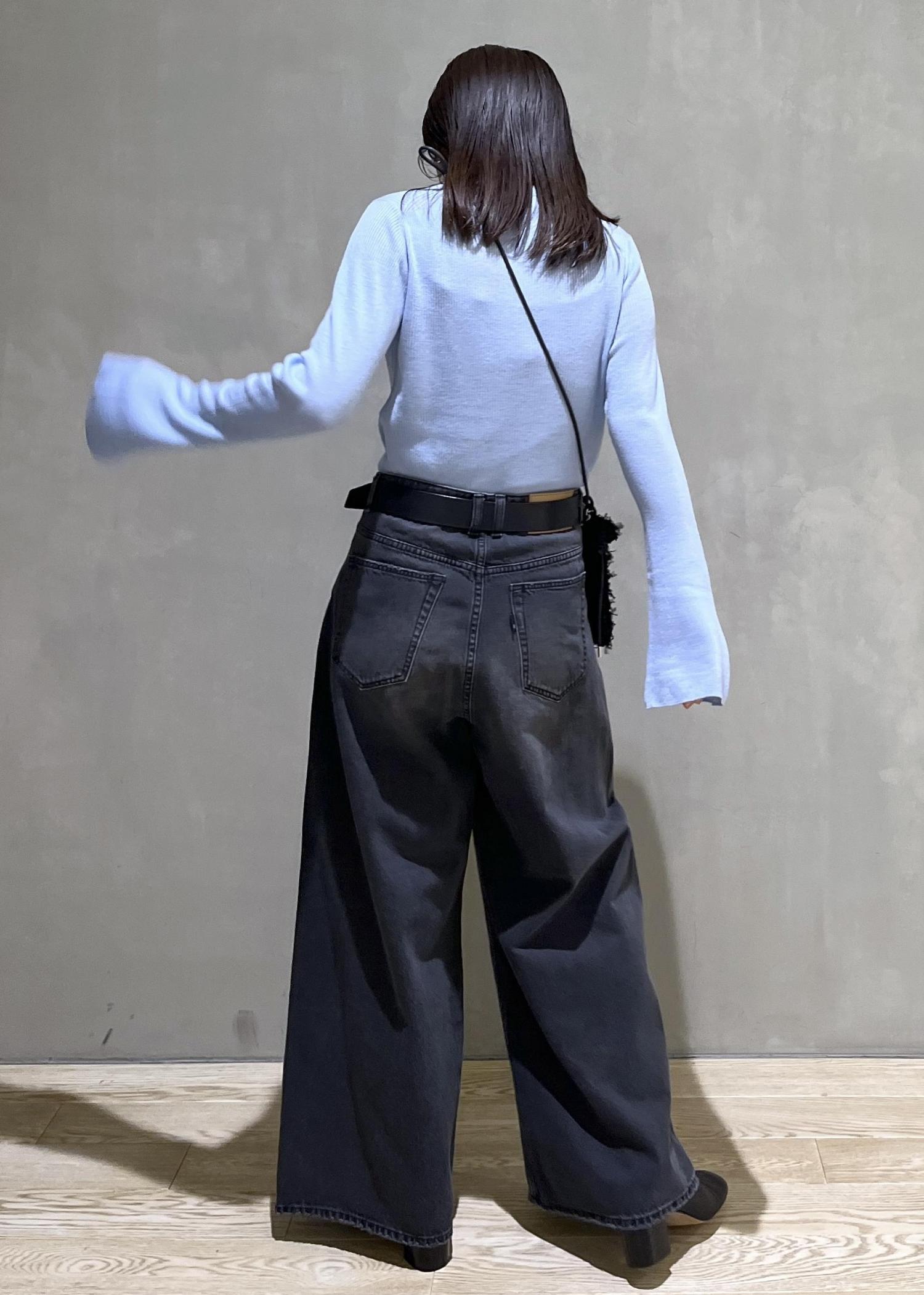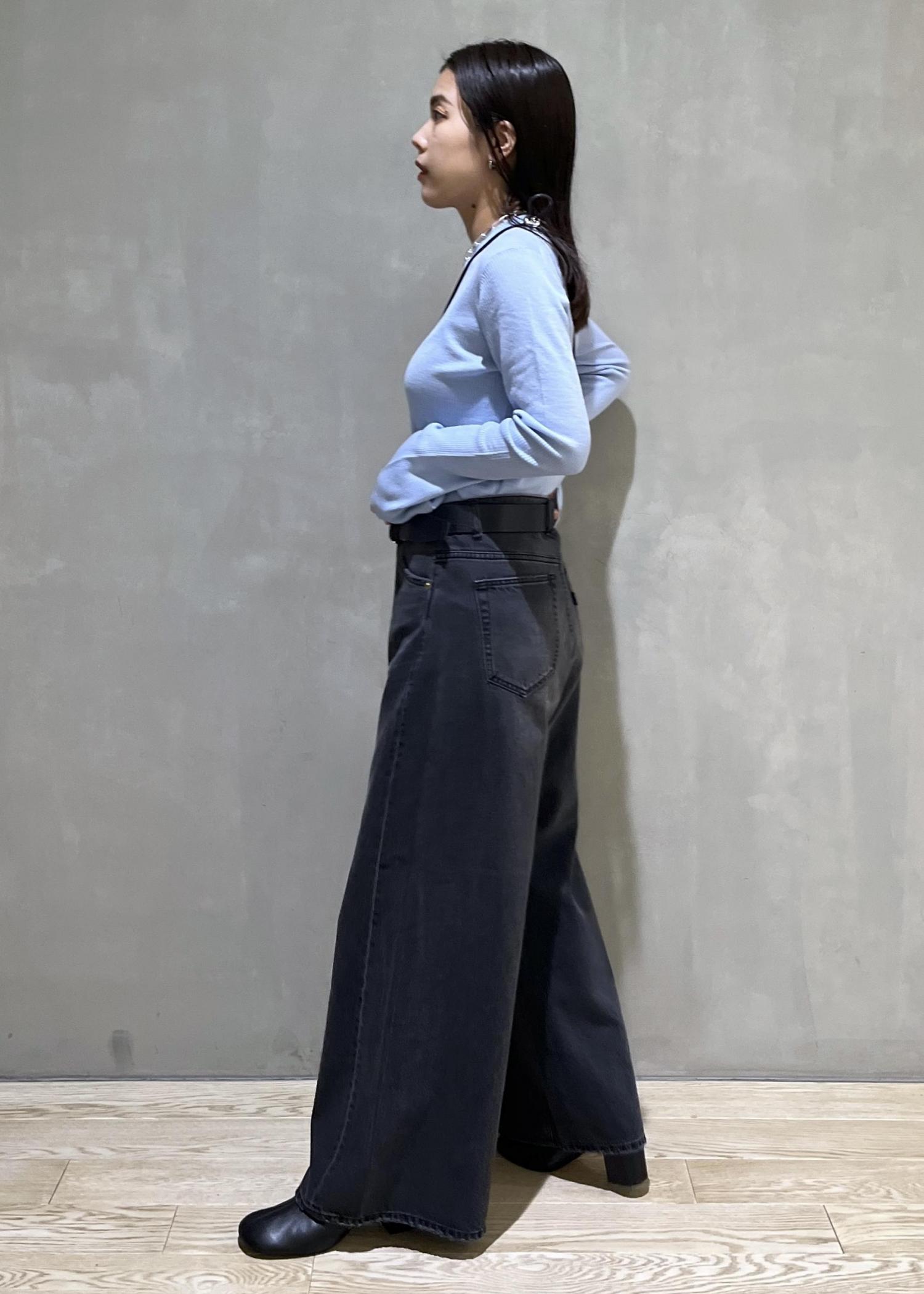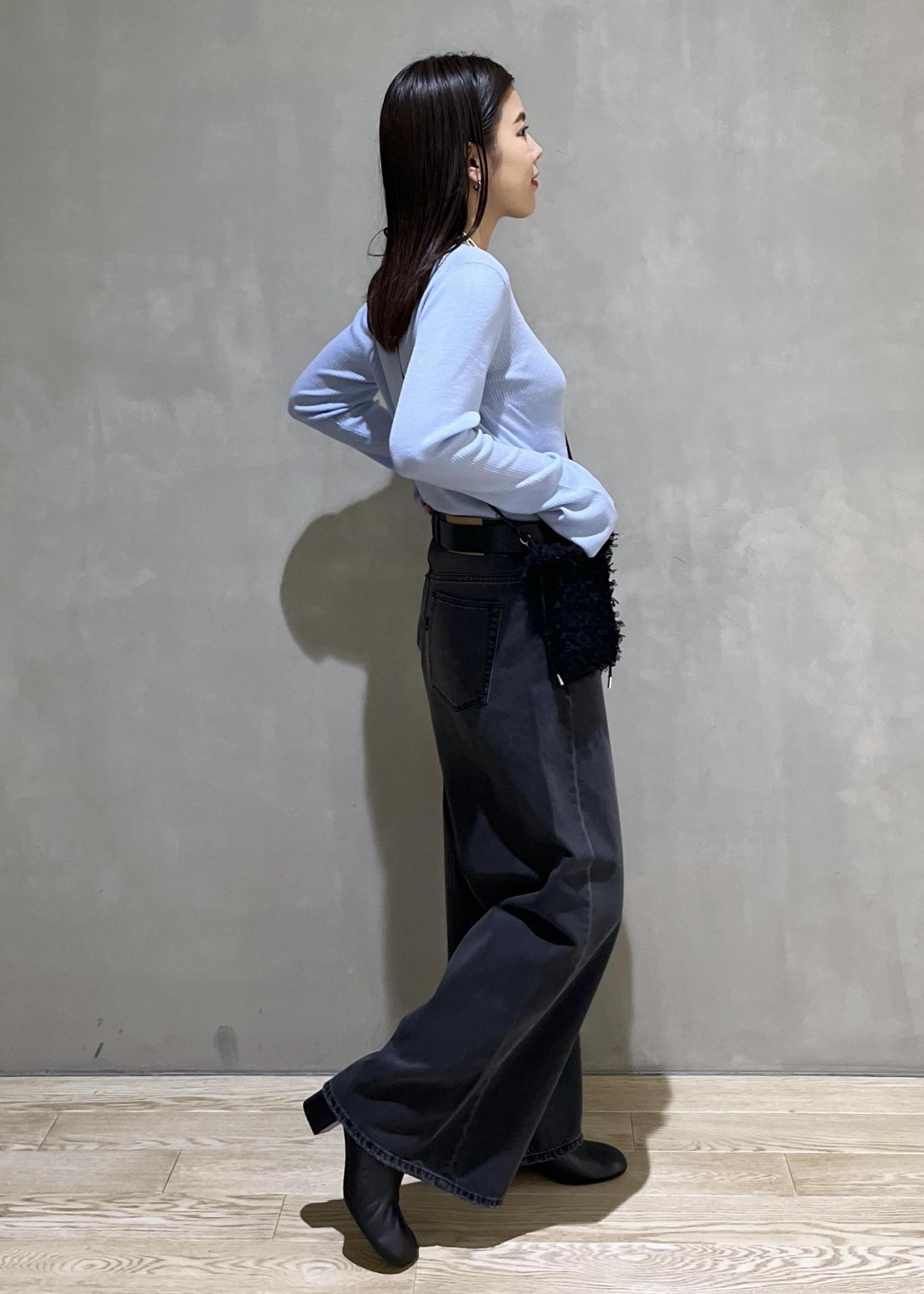 すっきりしたシルエットのニットなので、今回は新作のセミワイドストレートデニムパンツと合わせました◎