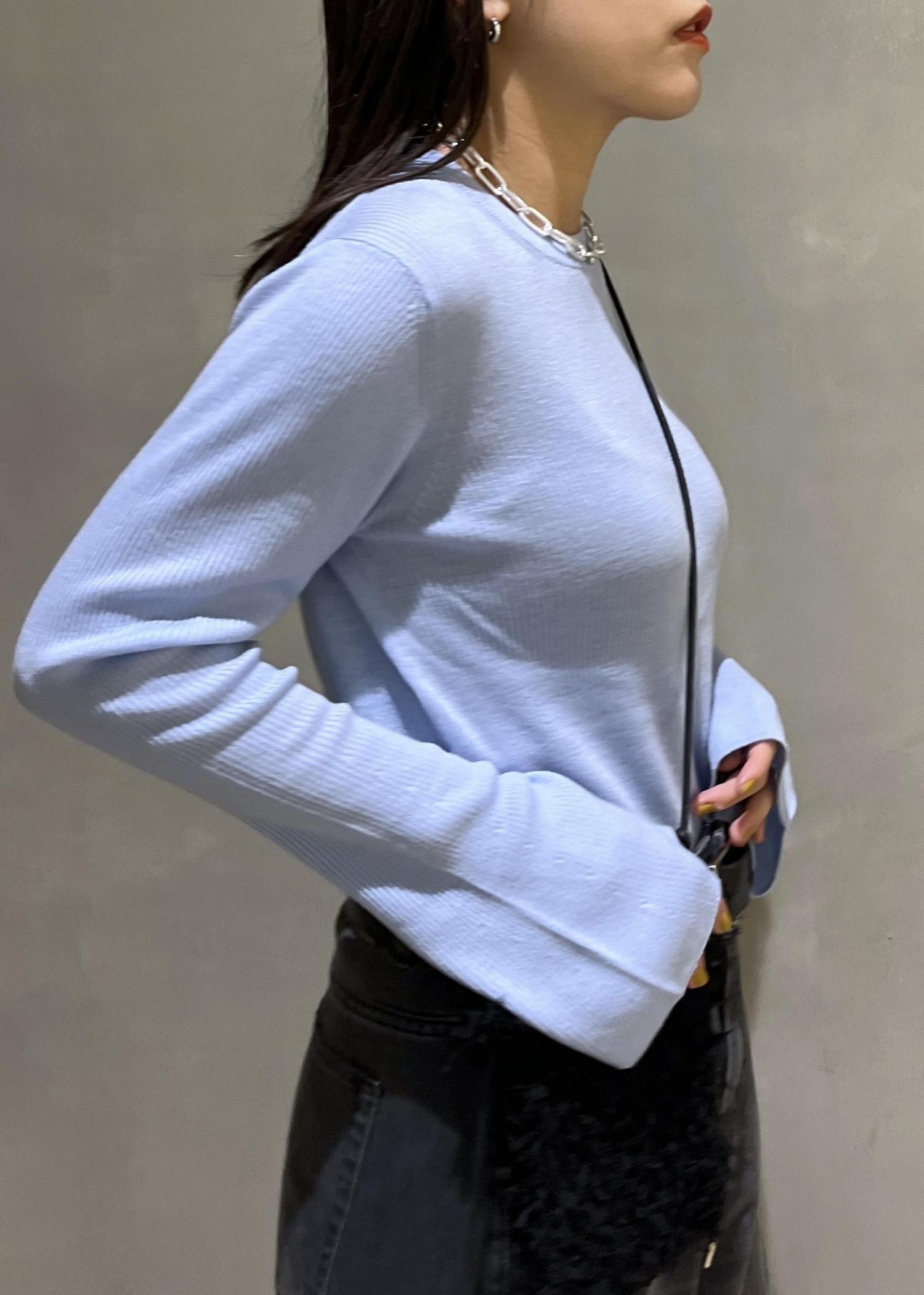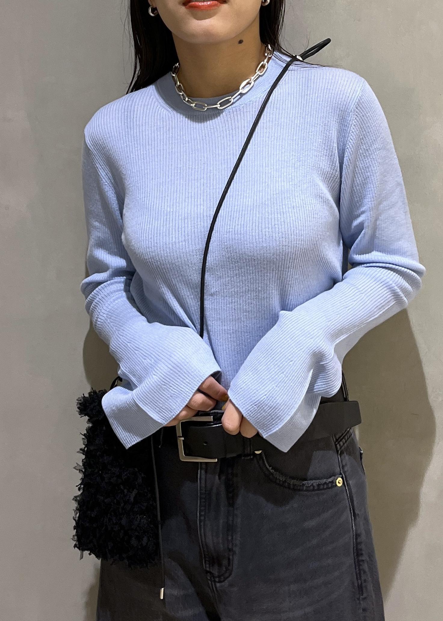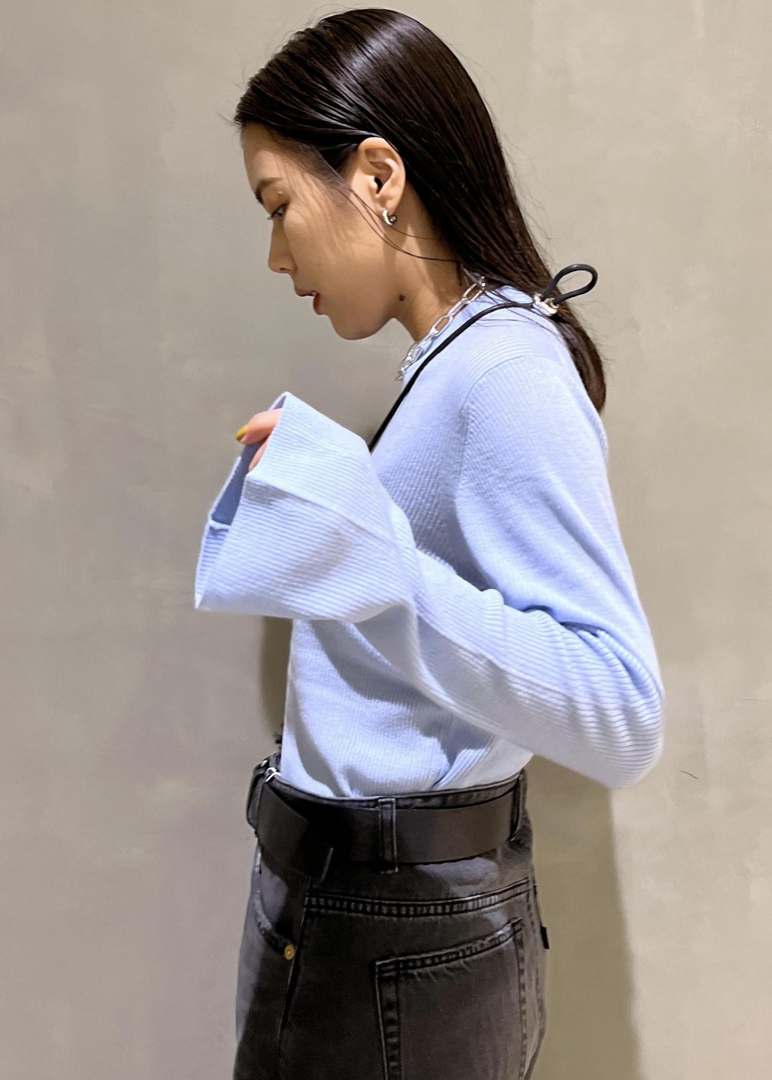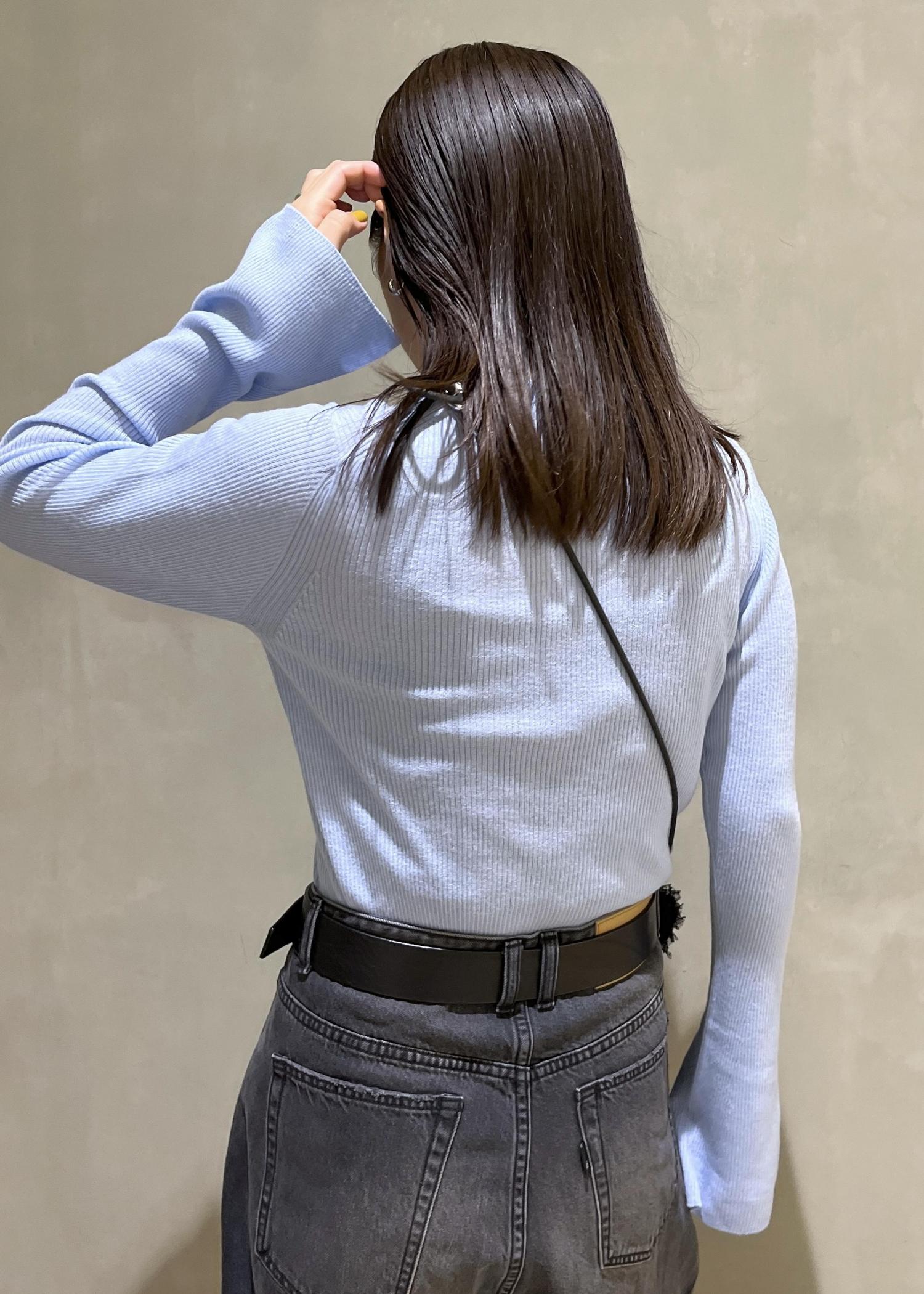 すっきりしたシルエットのニットなので、今回は新作のセミワイドストレートデニムパンツと合わせました◎