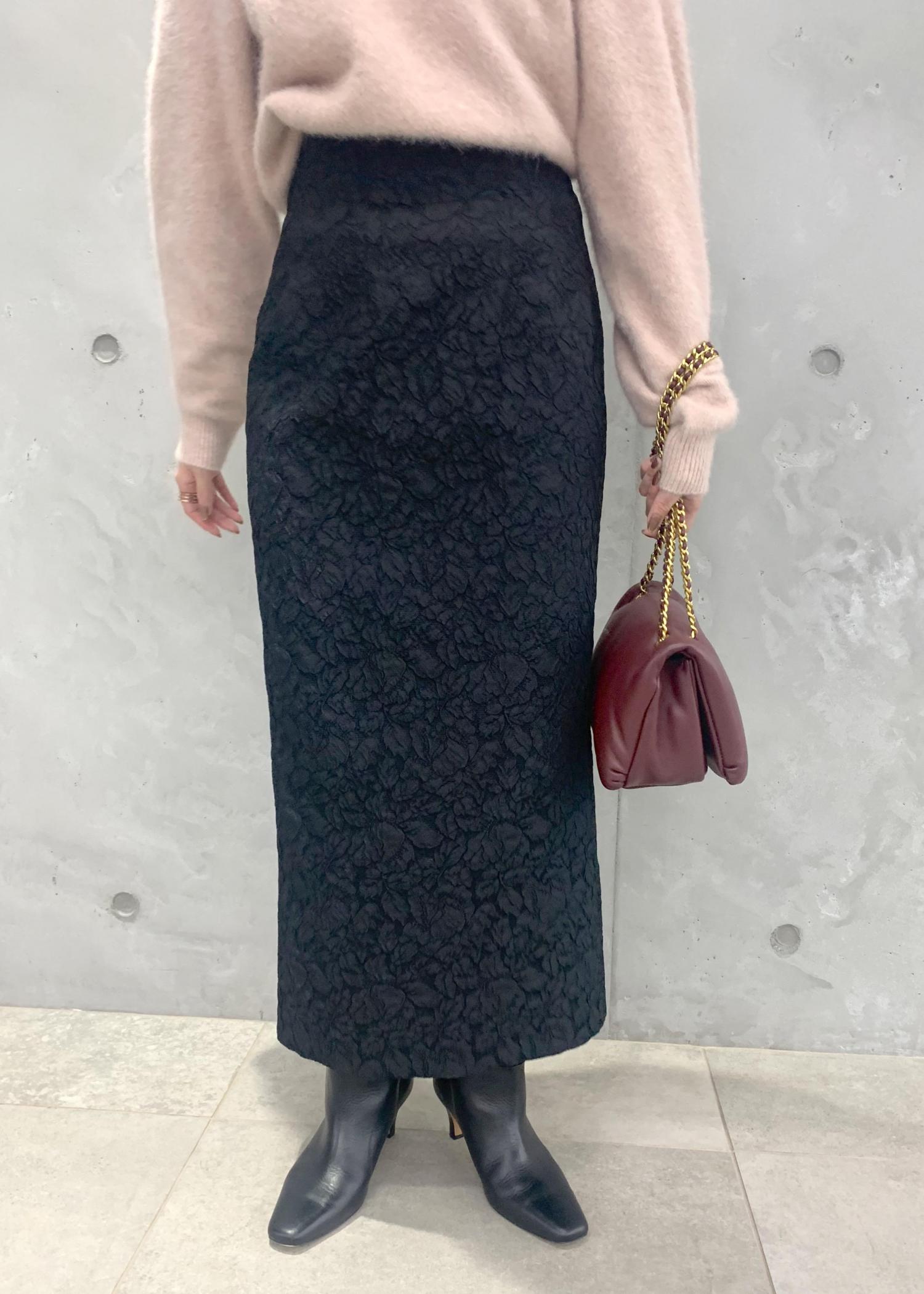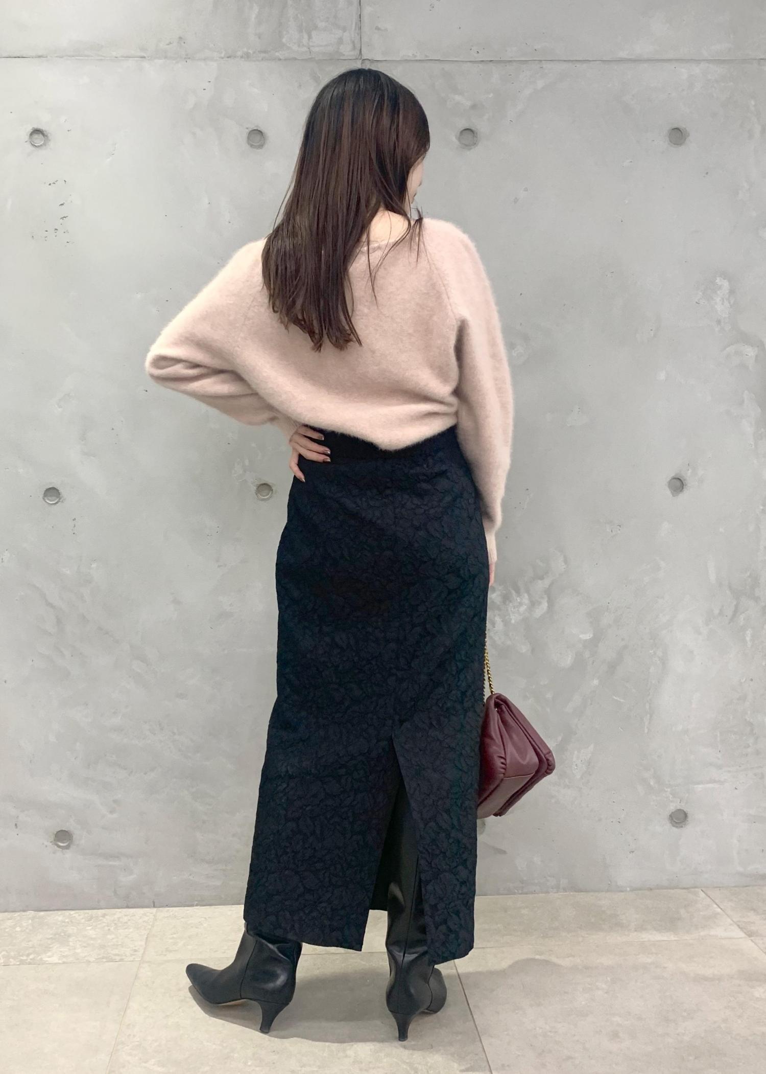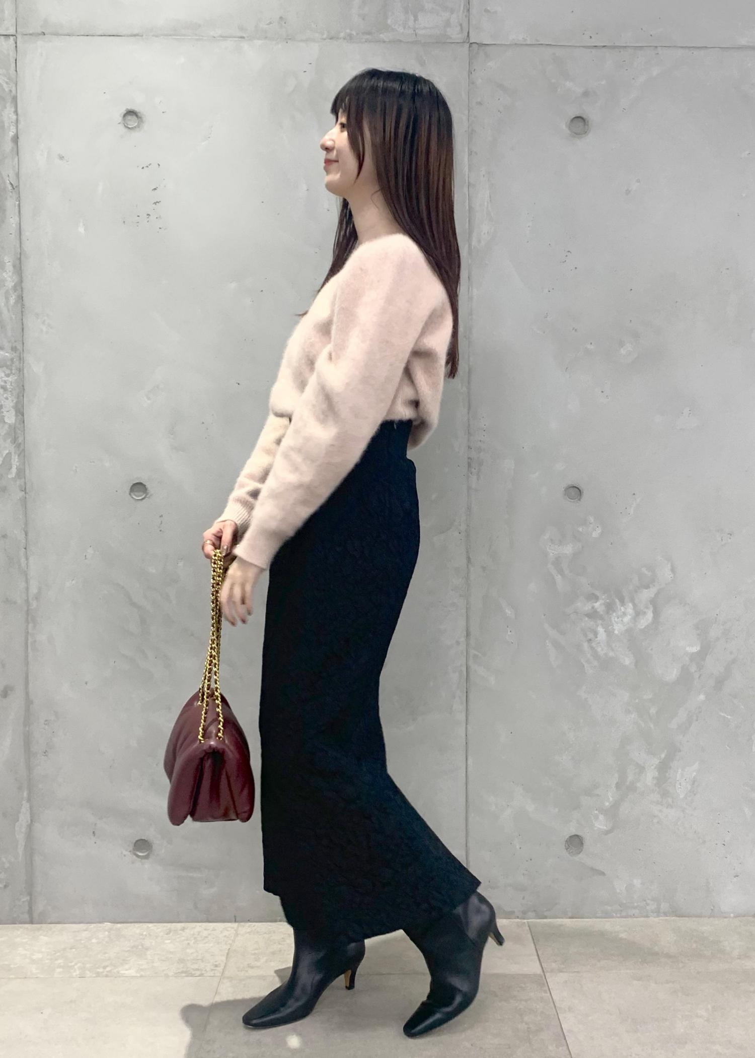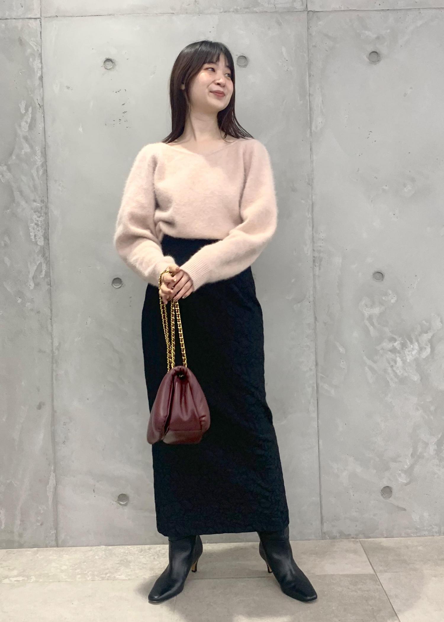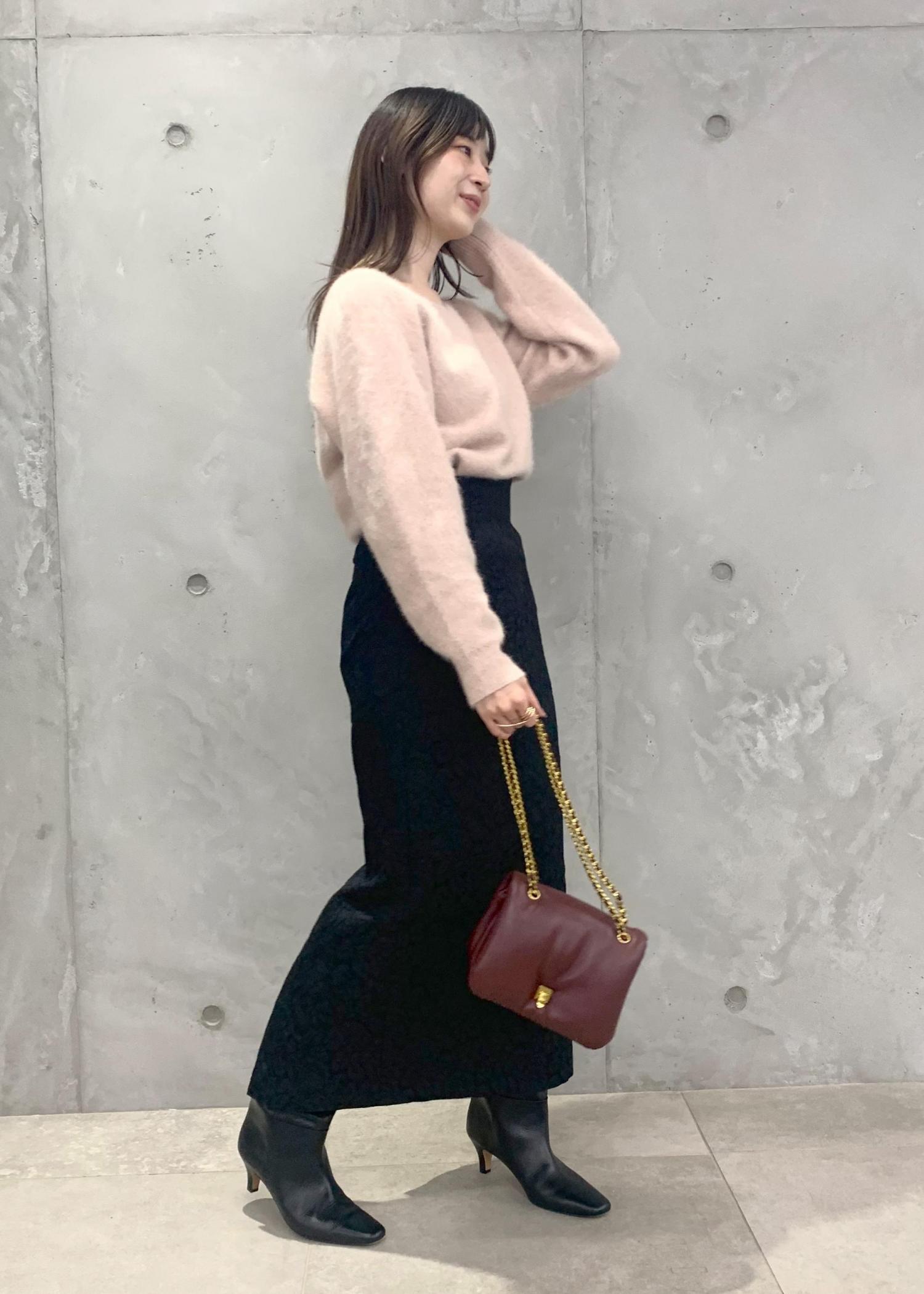 ややハリ感があるスカートに柔らかいニットを合わせる事で、メリハリがきいて両方のアイテムが引き立ちます◎