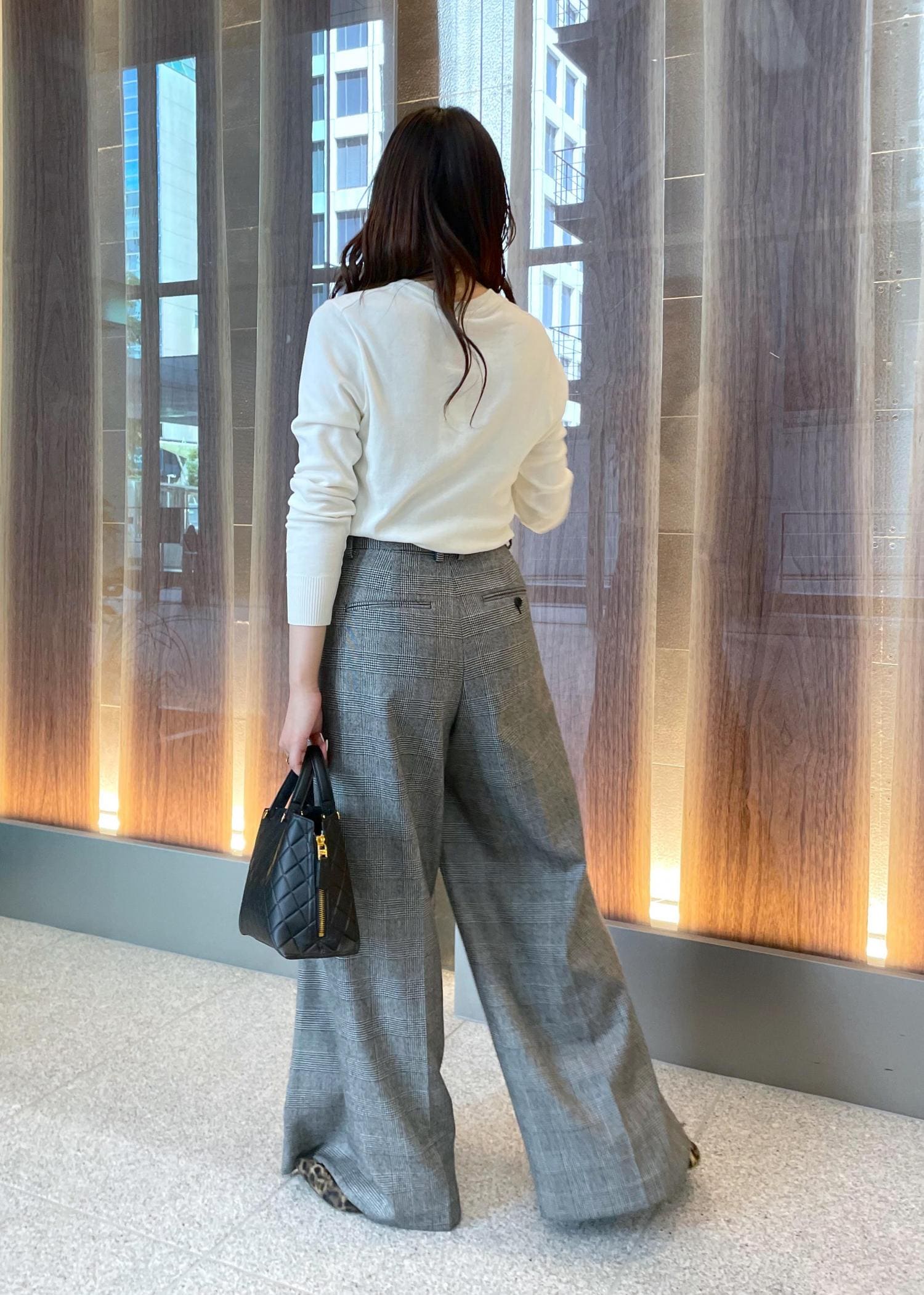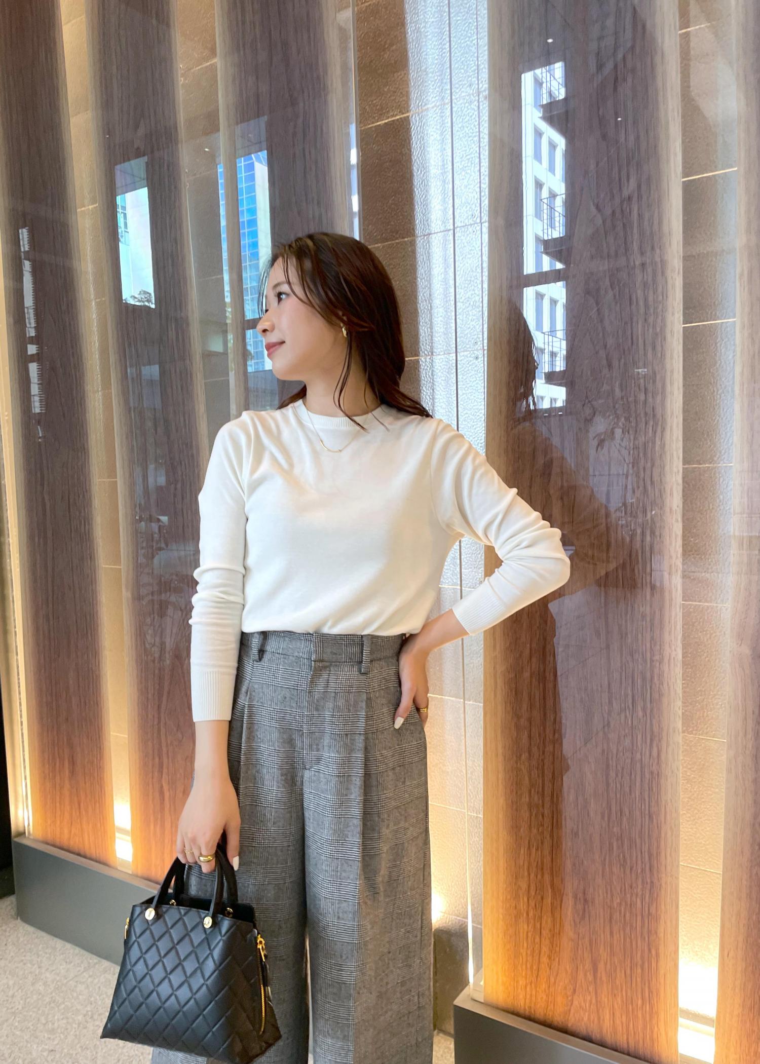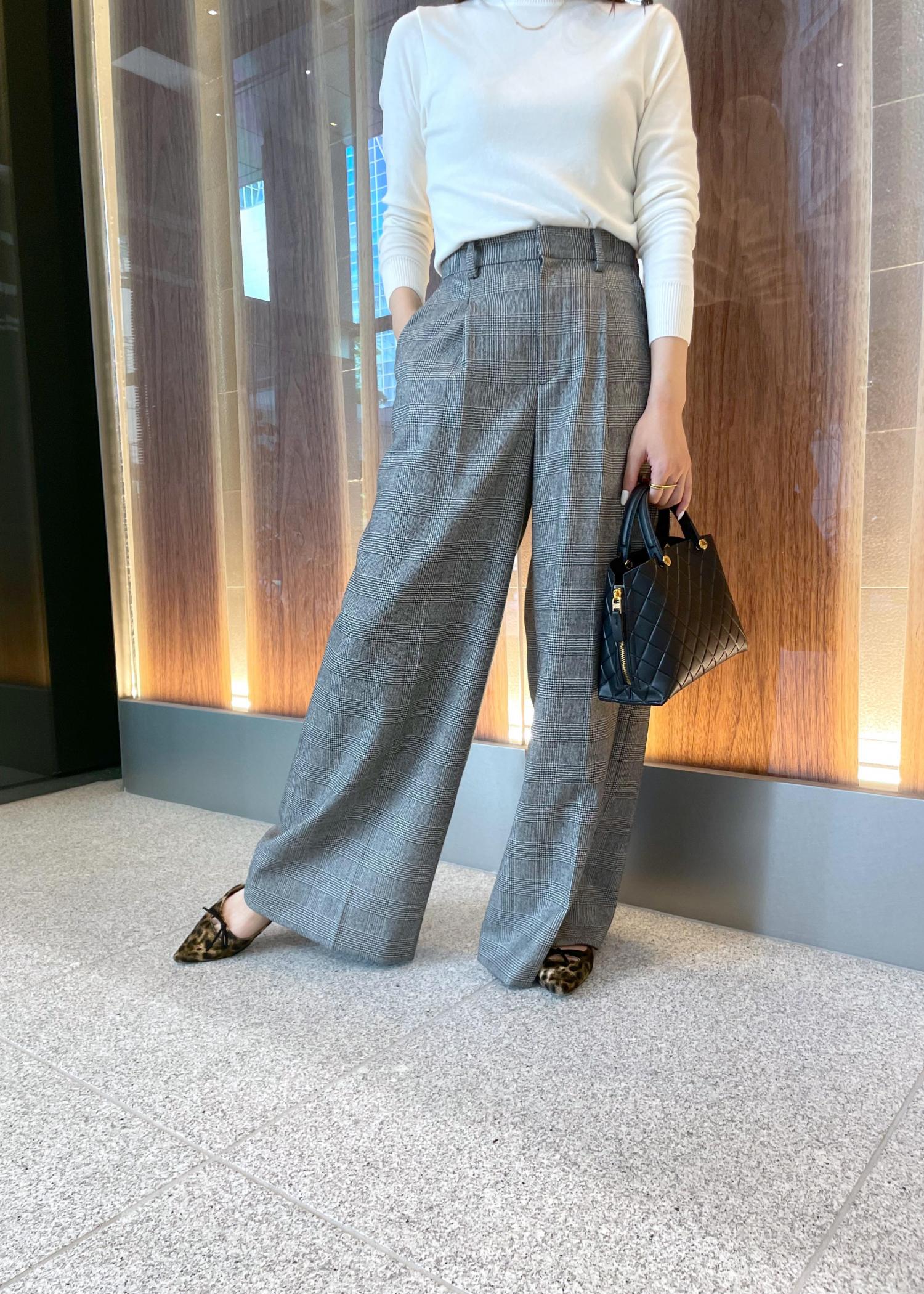 パンツはウールなので暖かさがあり腰回りがスッキリと見えるワイドパンツ。1本持っていると重宝する着回し力抜群パンツです!