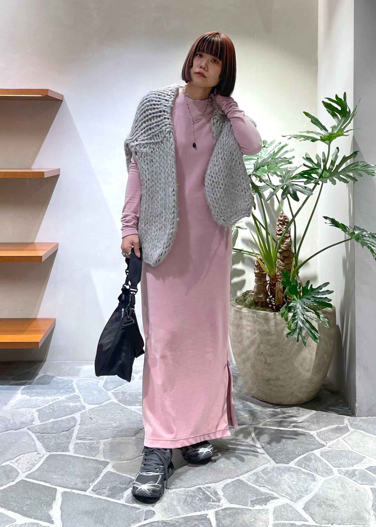 中に着ているキャミワンピースは秋冬感のあるフリンジ素材。