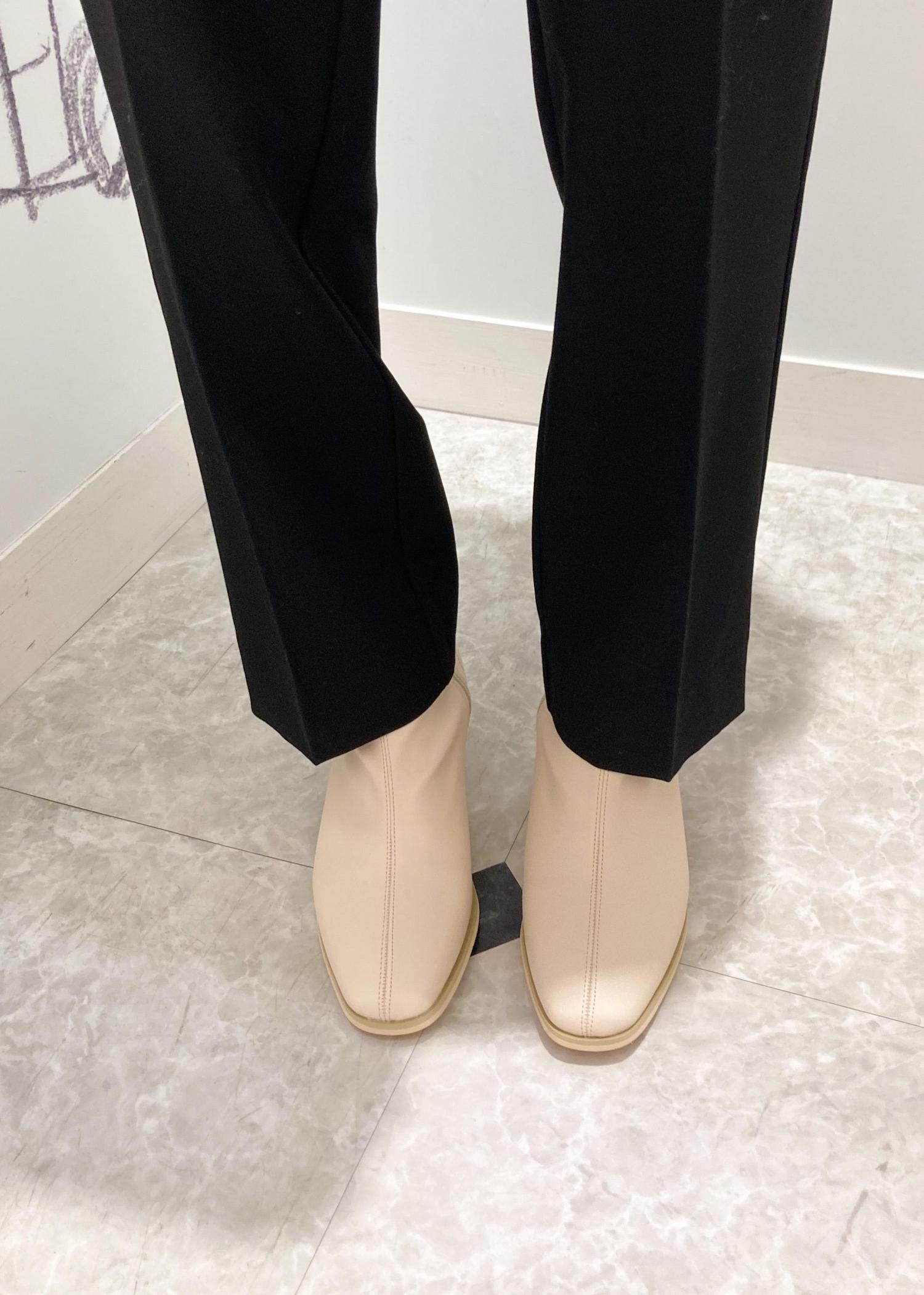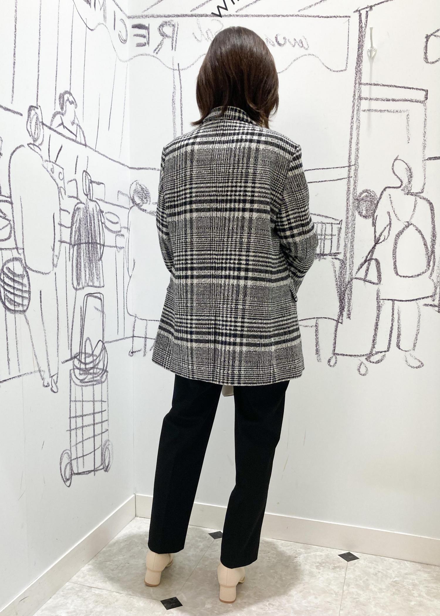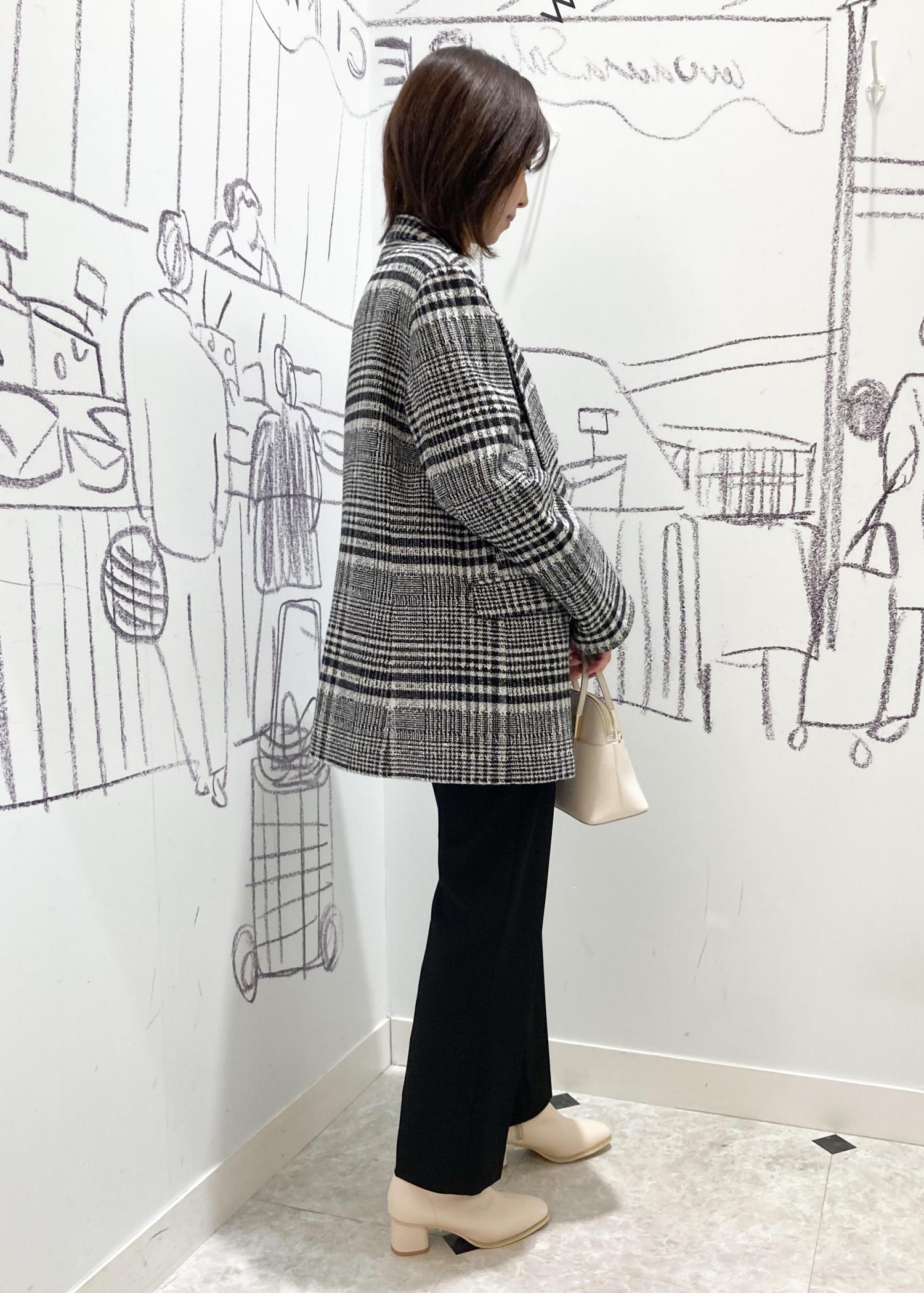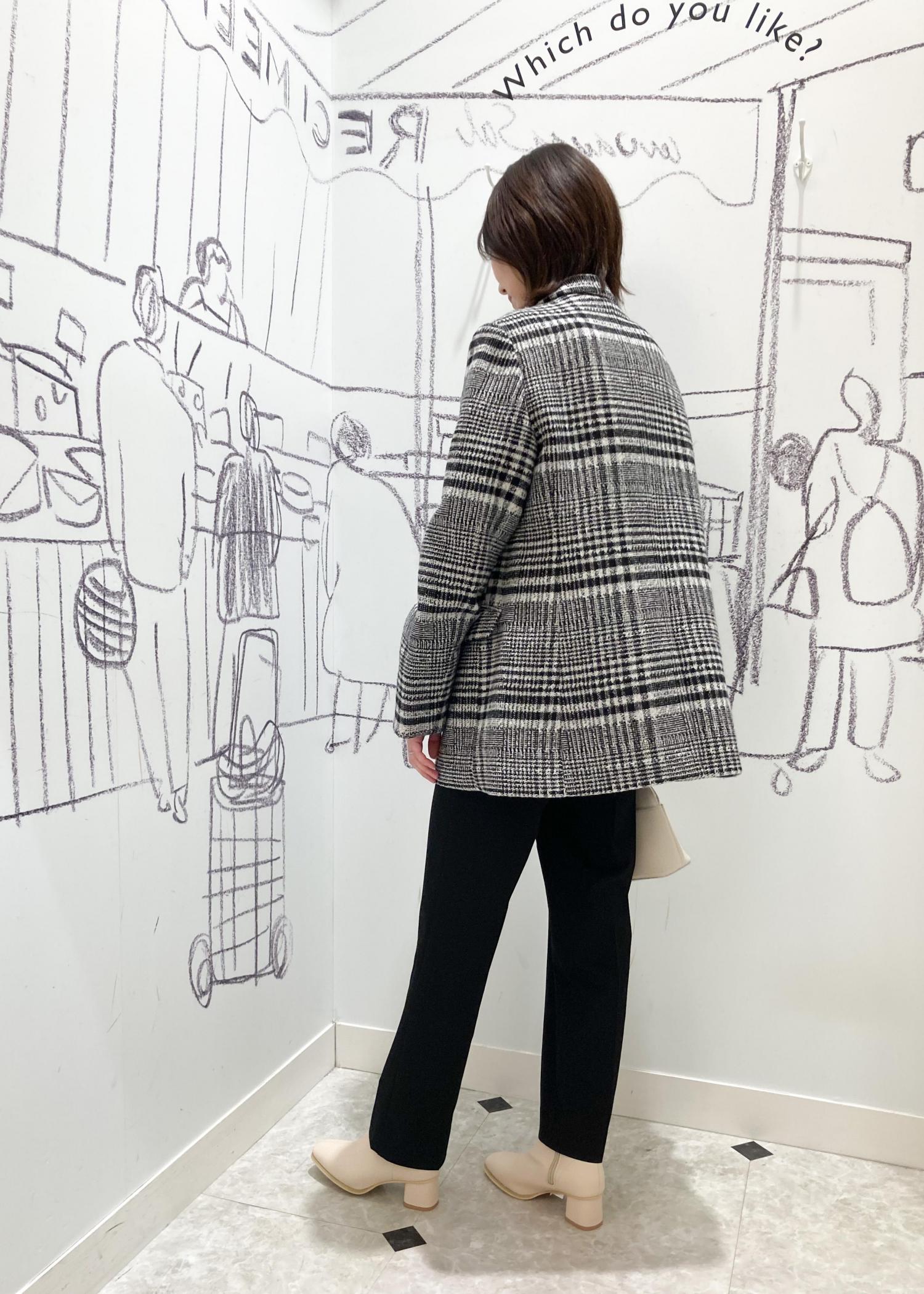 チェックコートが映えるようにシンプルなニットとパンツでスッキリ見えるようなコーディネートにしました。