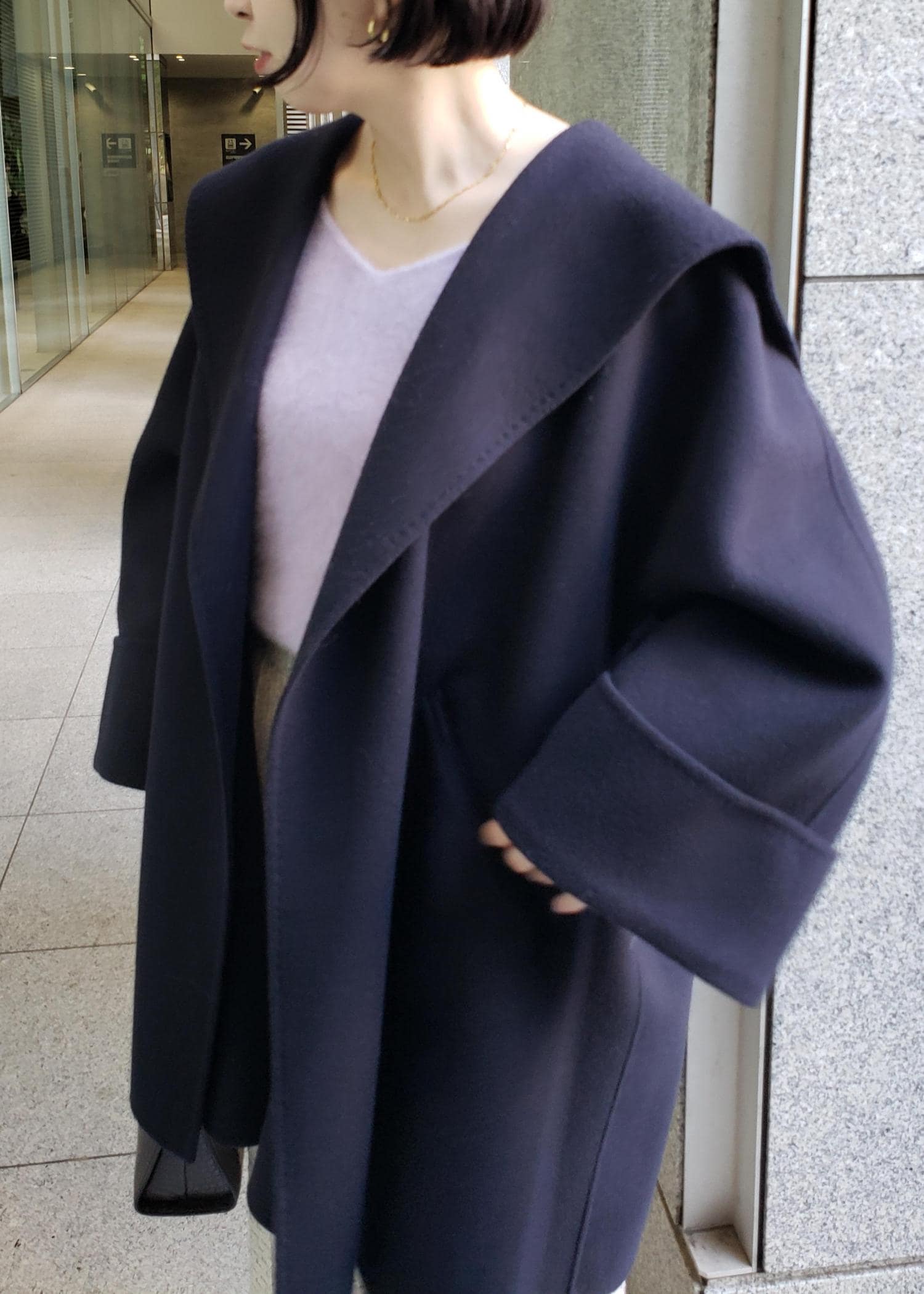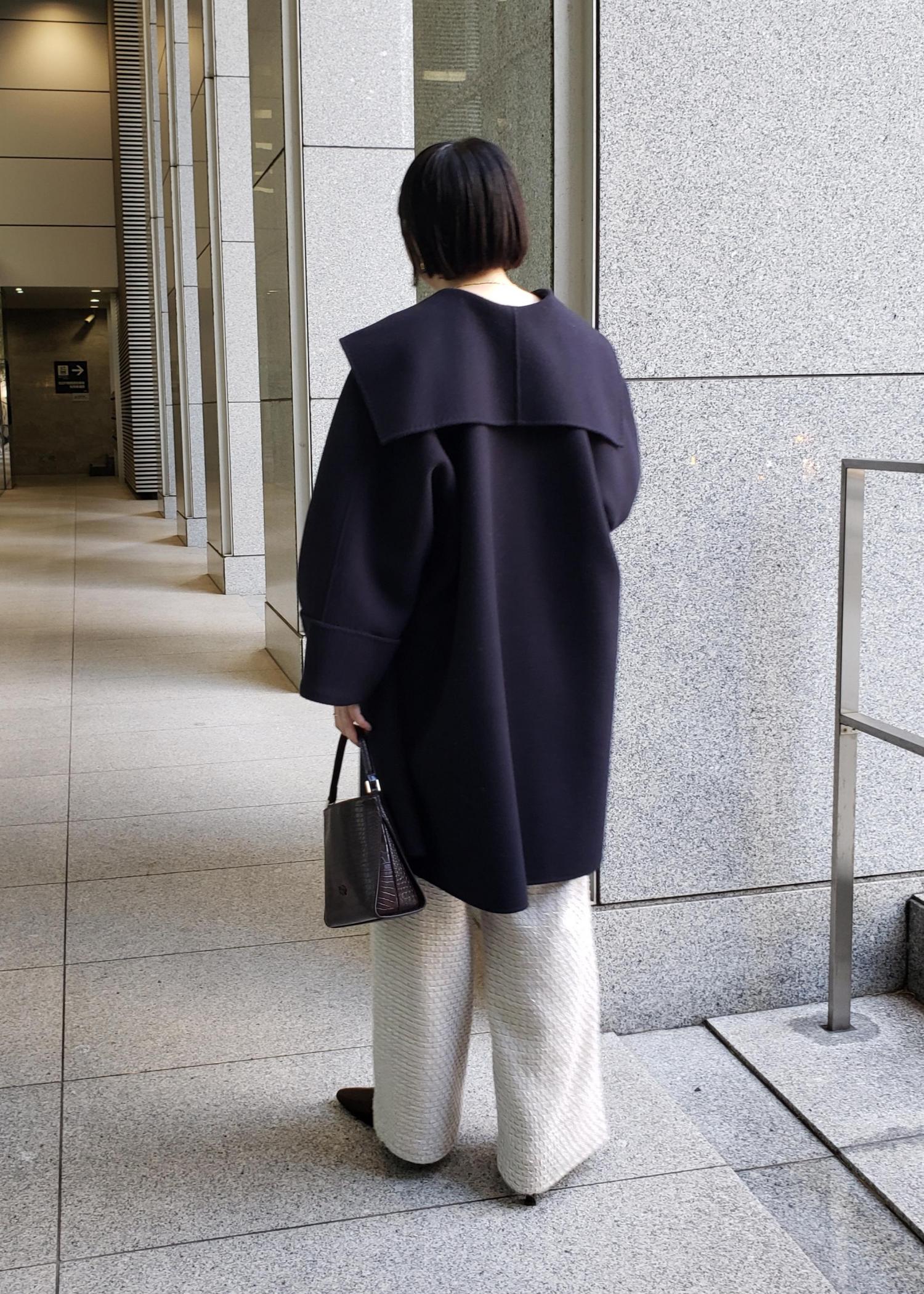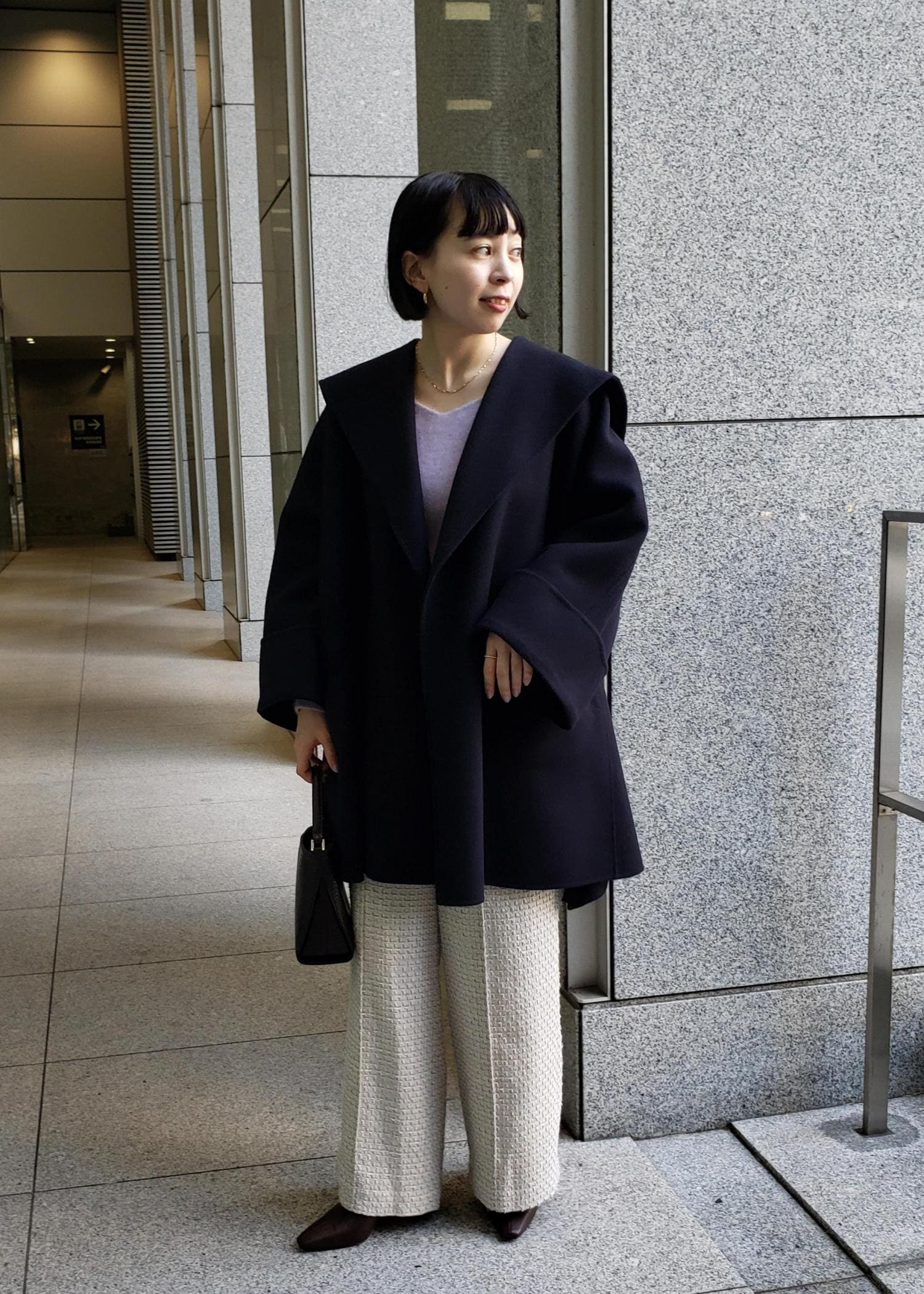 柔らかく、程よい厚さのショート丈コートに、ワイドパンツとニットを合わせて冬に向けたコーディネートにしました。