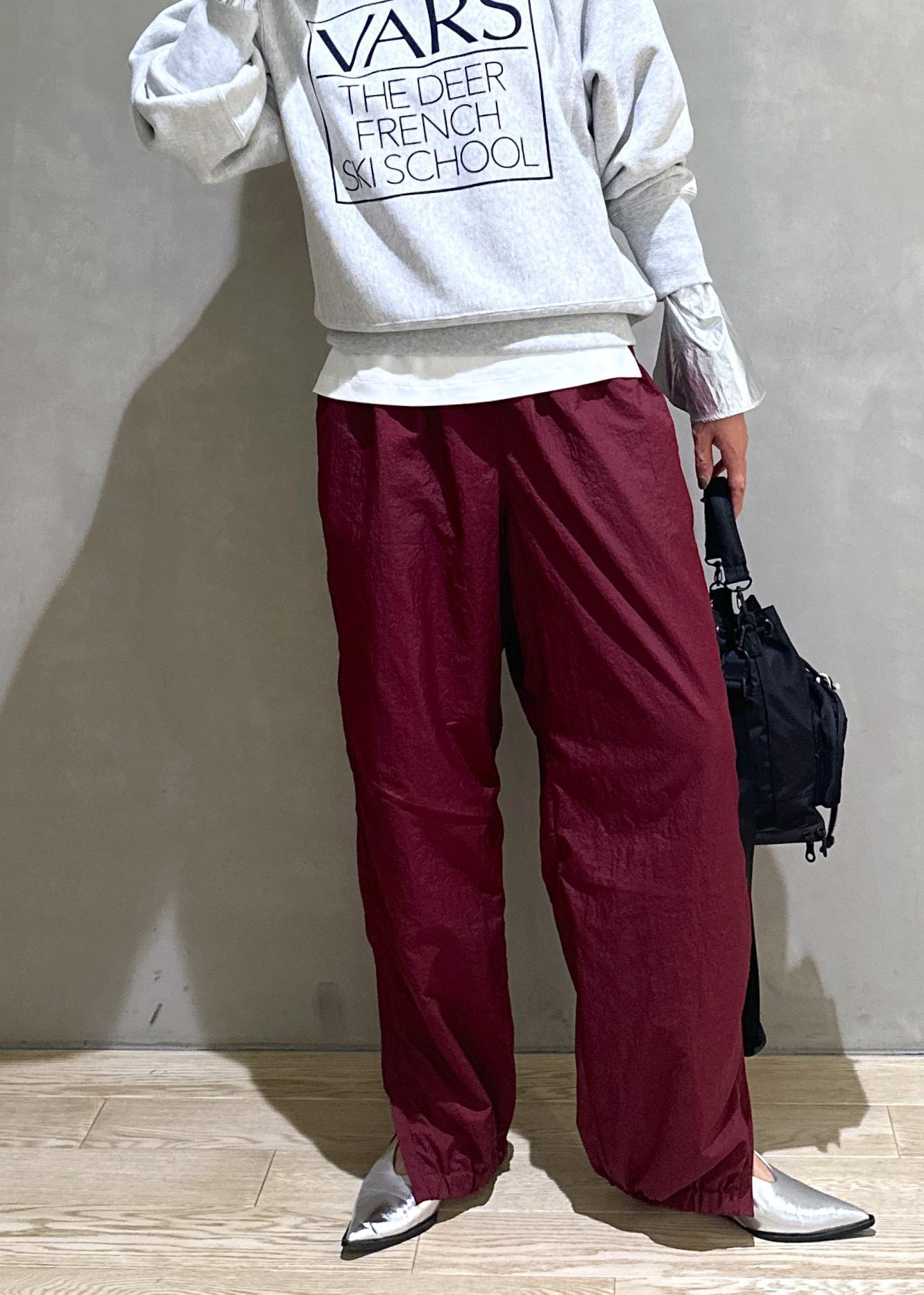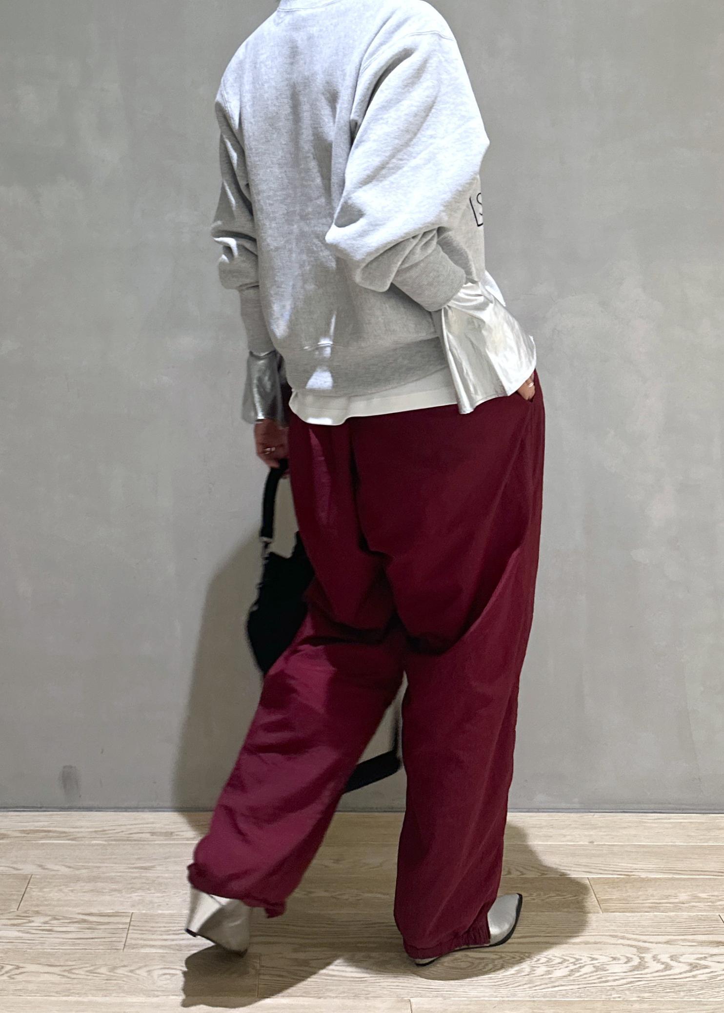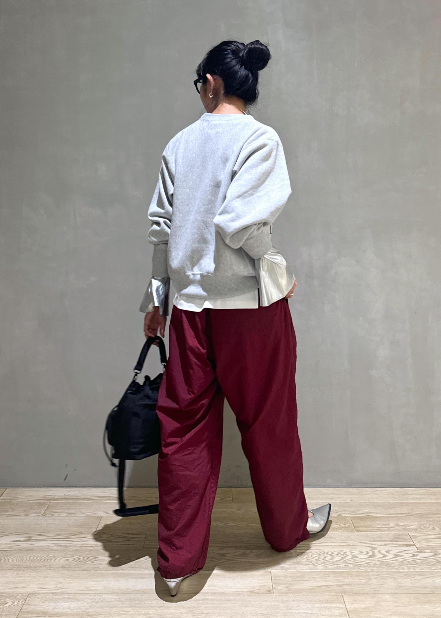 大体スエットのボトムはスカートを合わせてカジュアルすぎないスタイリングにするんですが、今回はナイロンパンツと合わせて結構カジュアルにスタイリングしました!!^_^
