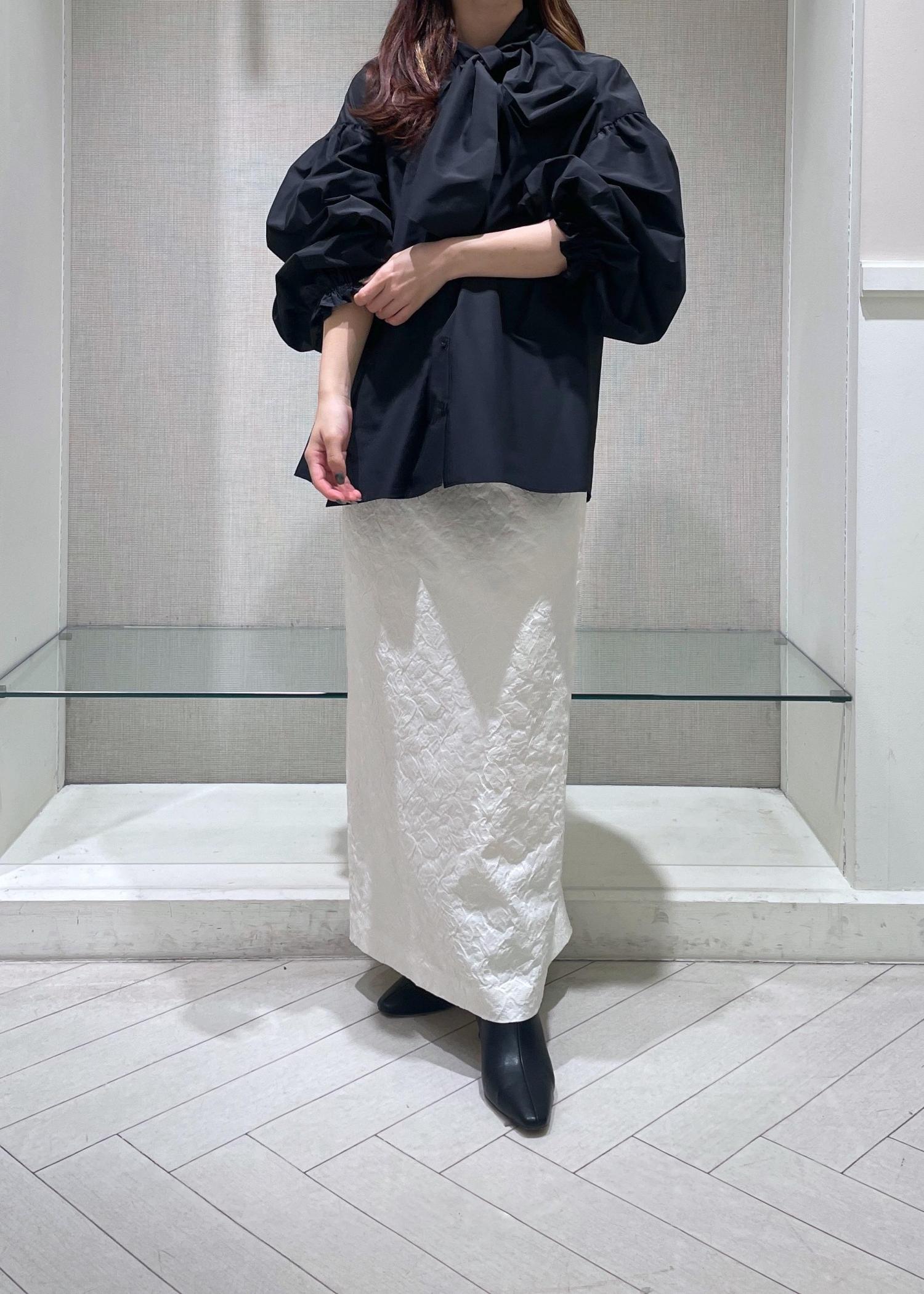神崎恵さんコラボ、ボウタイブラウスとジャカードストレッチタイトスカートを着用しました。
