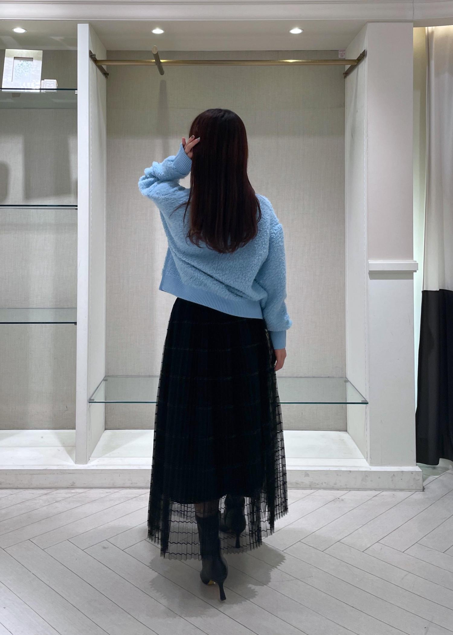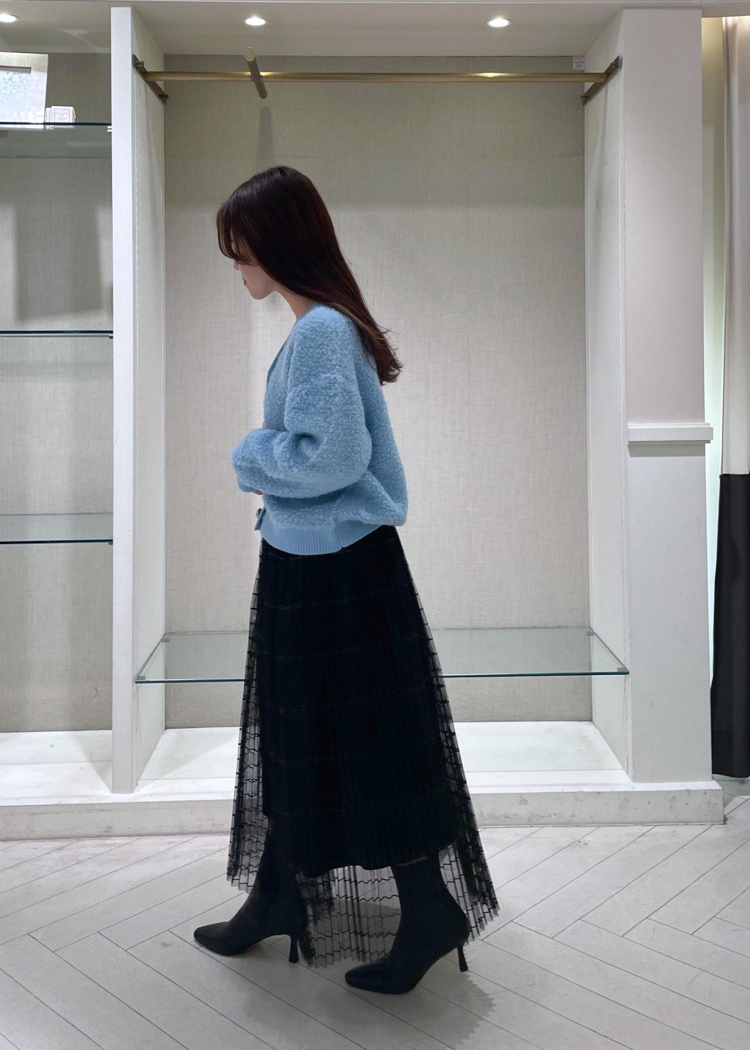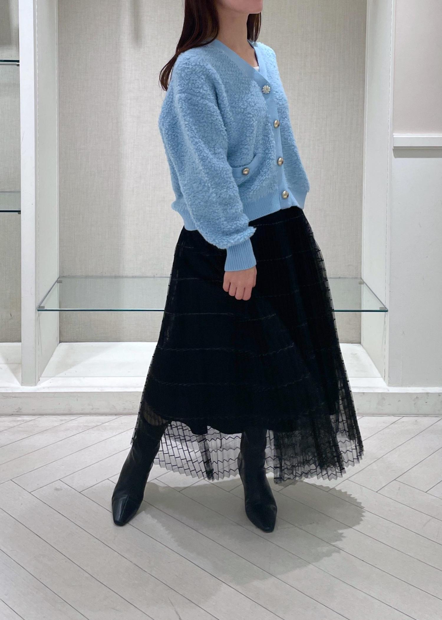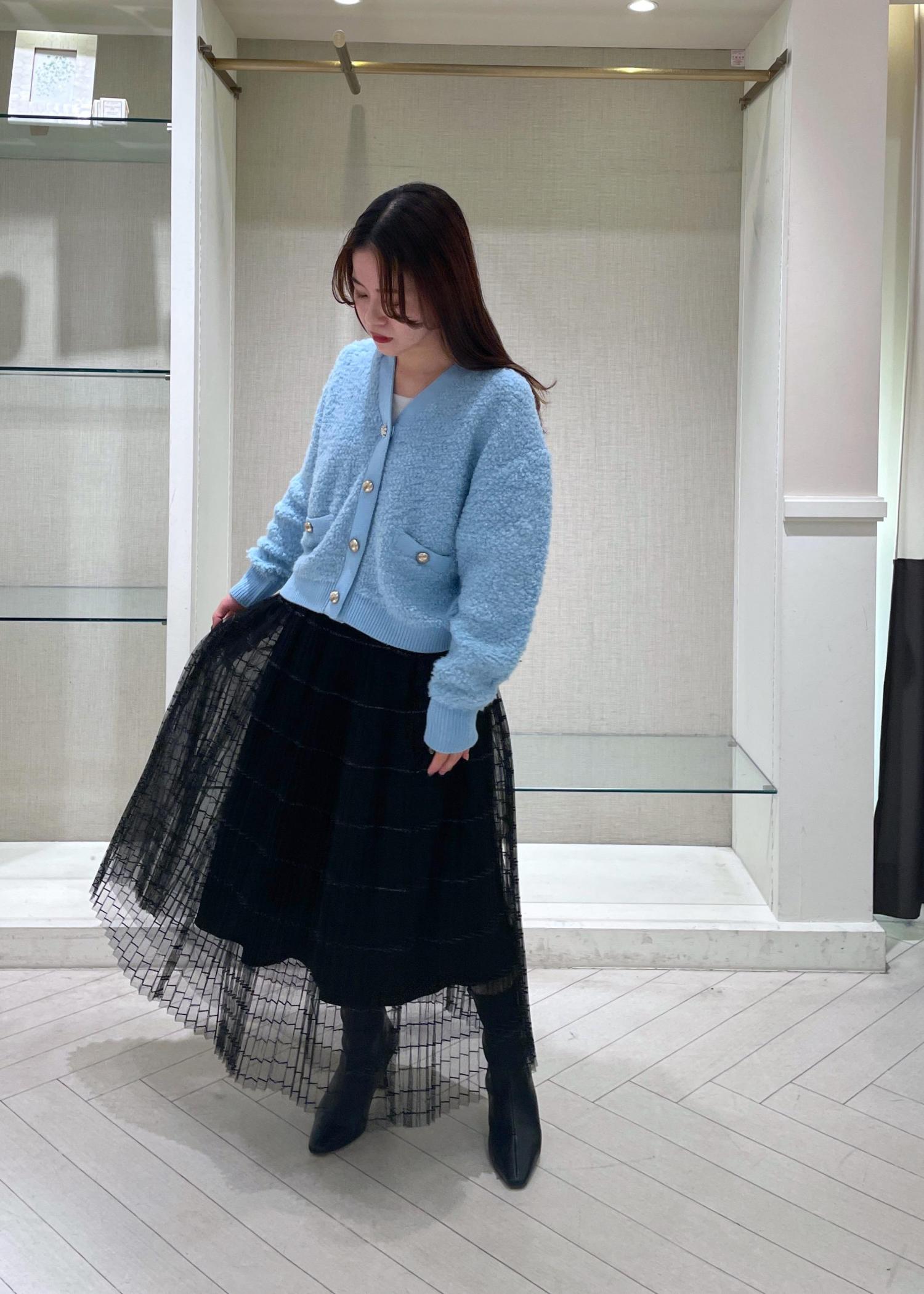 ビジューボタンの存在感があり、1枚で華やかさのあるカーディガンです。今回は1枚着として着用しました。