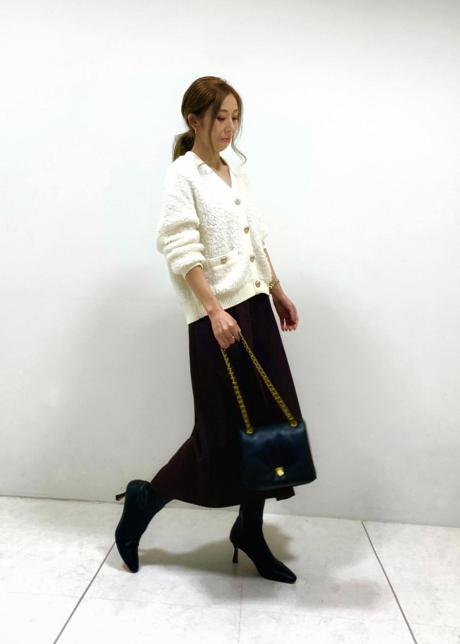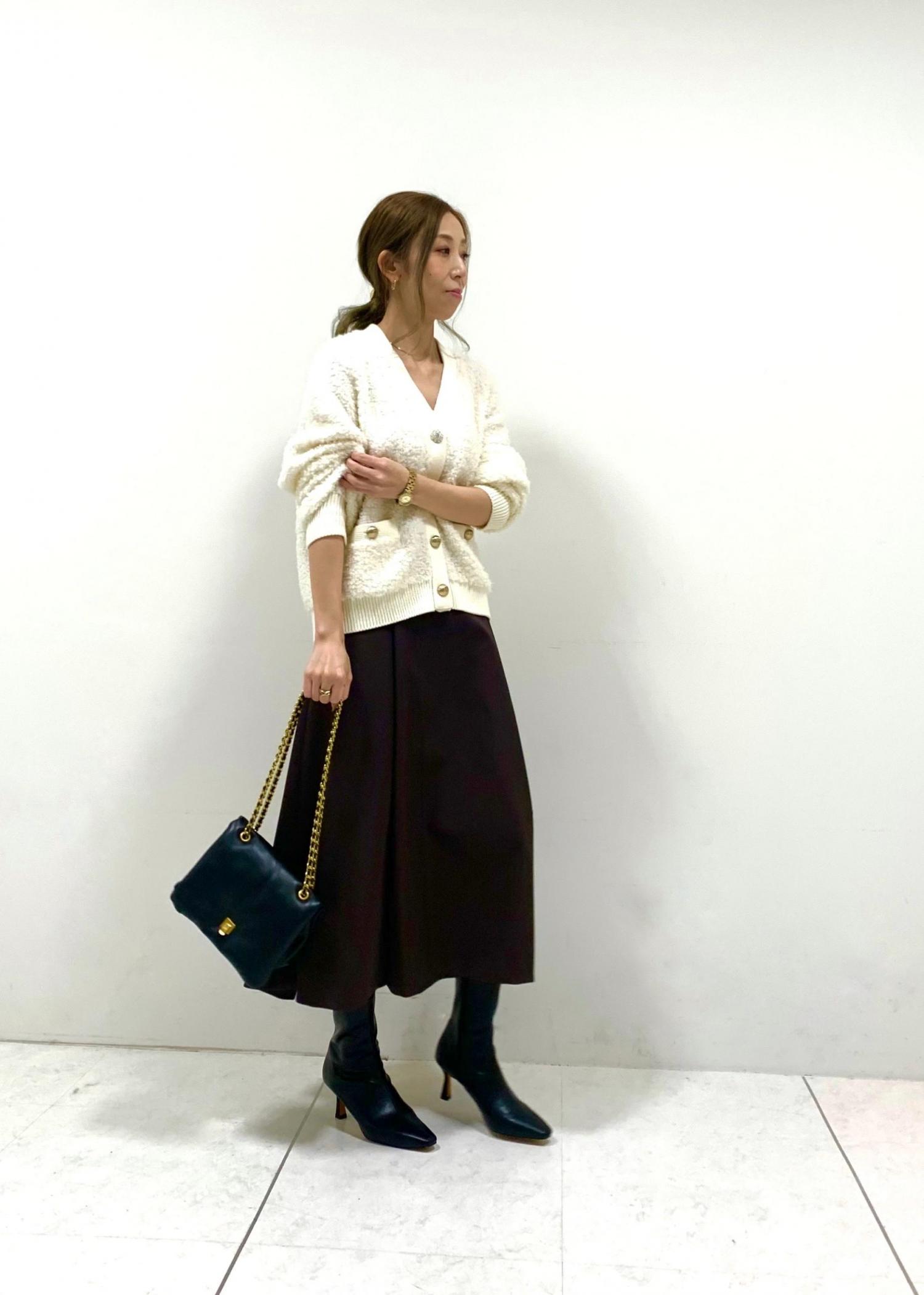 着丈は152cmでくるぶしが見えるくらいの丈になりました。上手なシルエットでお仕事にも、普段にも合わせやすいデザインです。 -