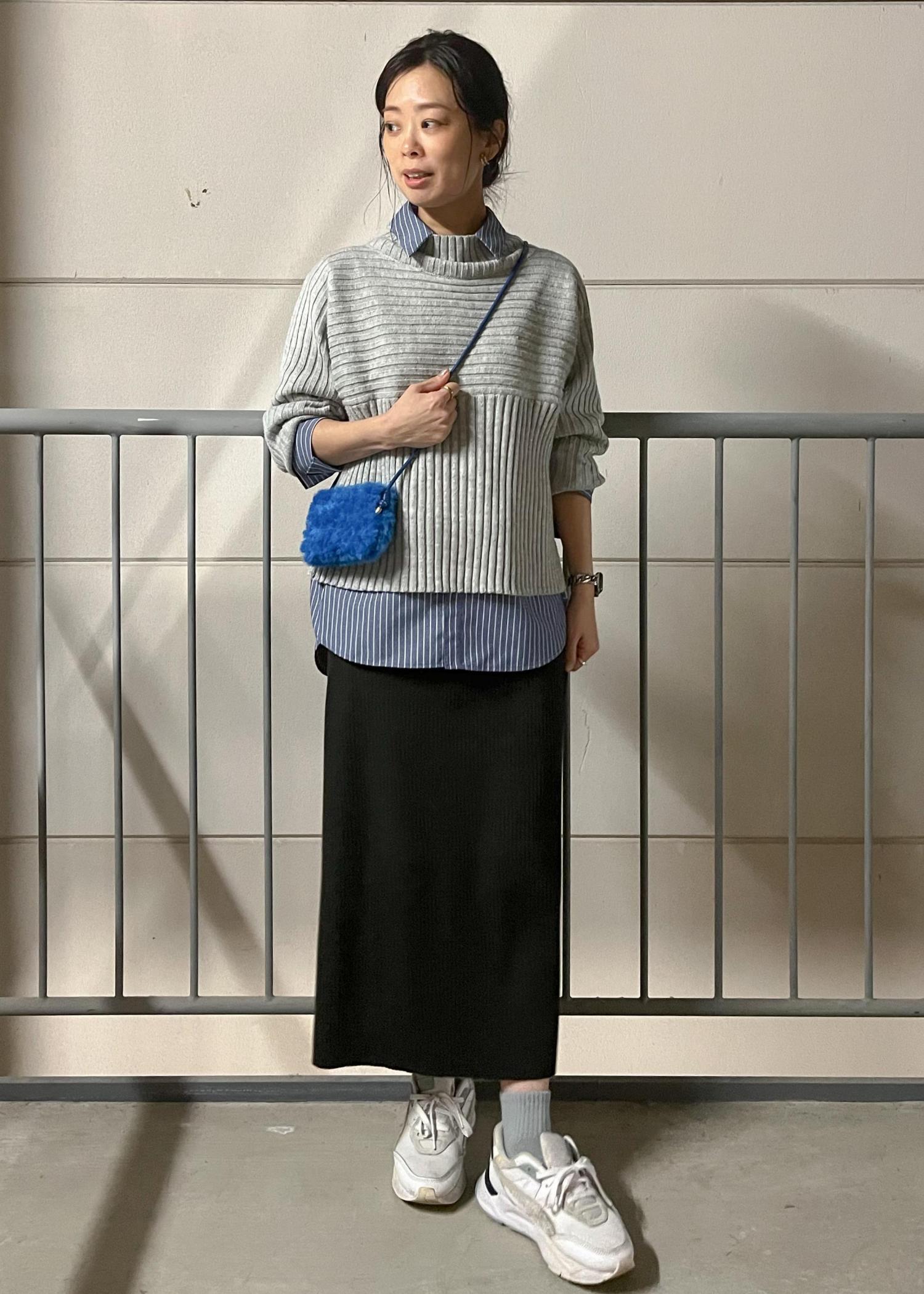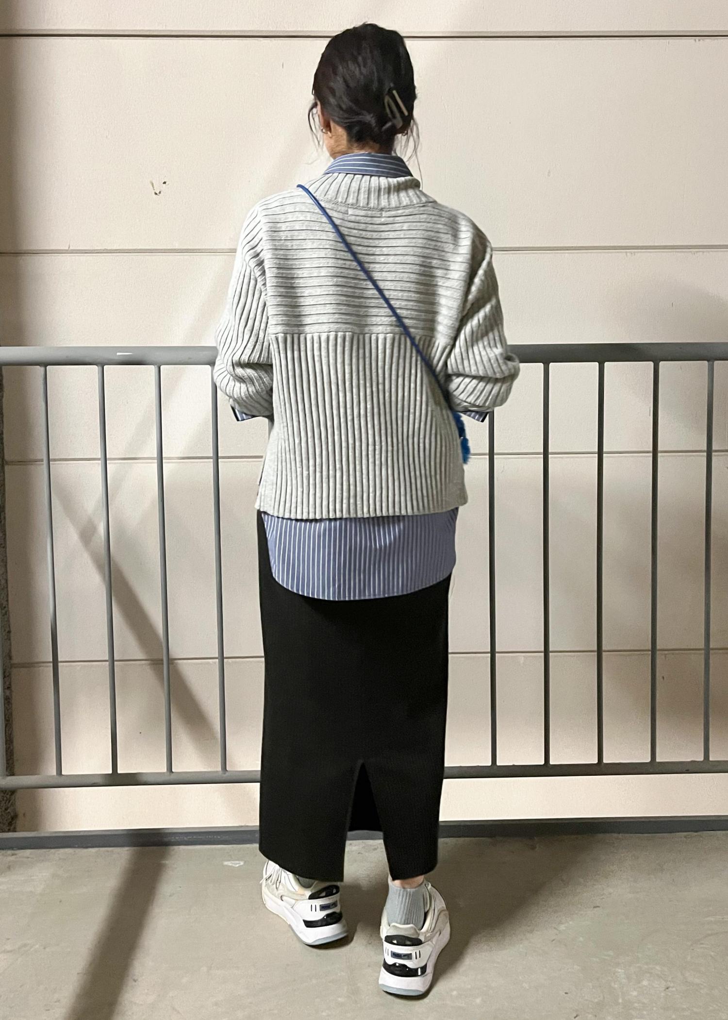 シャツがあることできちんと見えが叶い、お尻周りもカバーされるのでニットの雰囲気を変えたときにおすすめです!