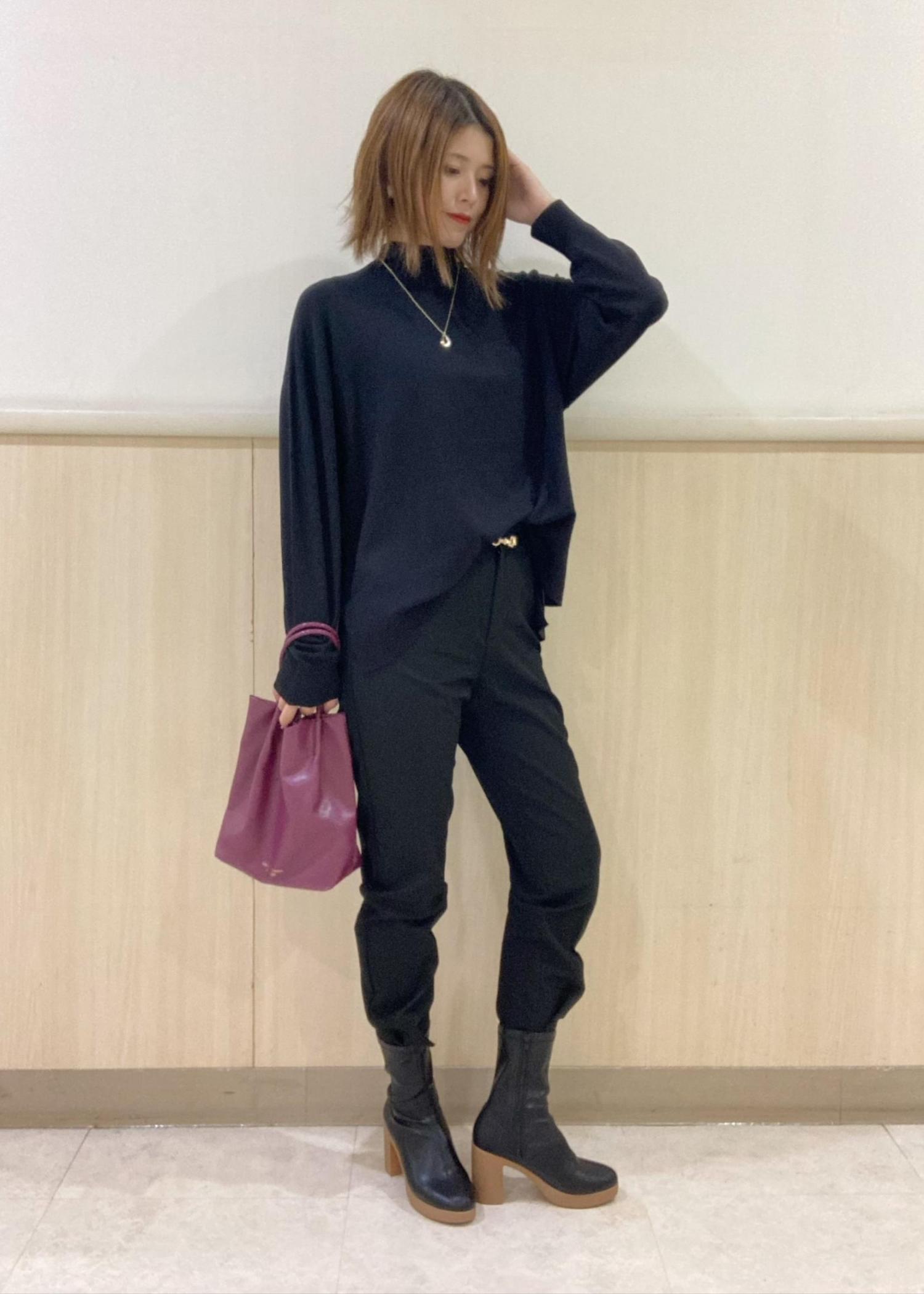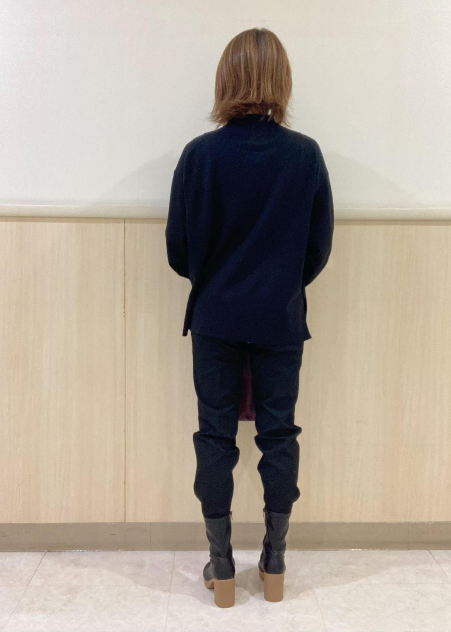 トップスは前だけインして縦長のシルエットを作り、パンツはあえてブーツインする事で脚長効果も期待できます◎