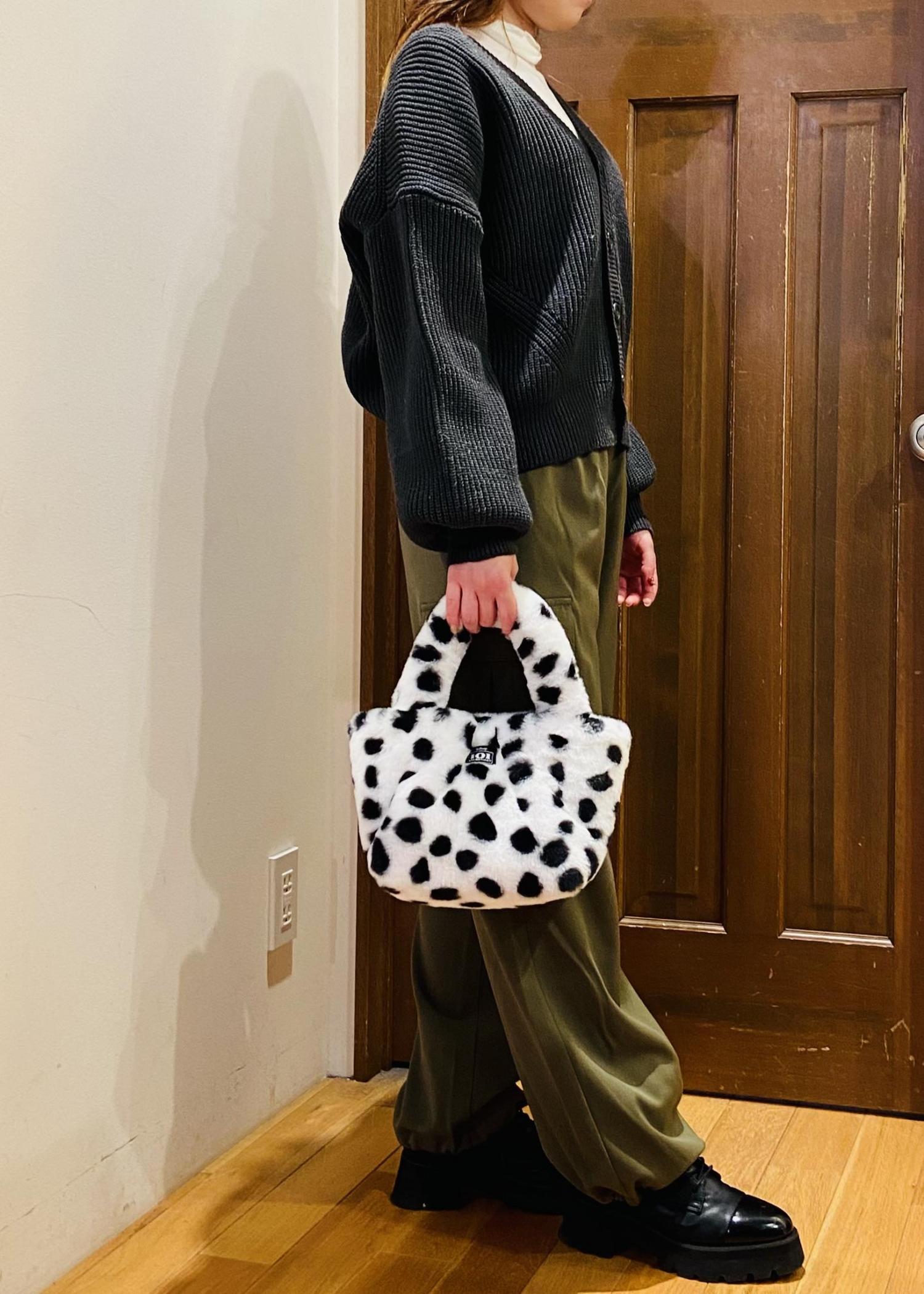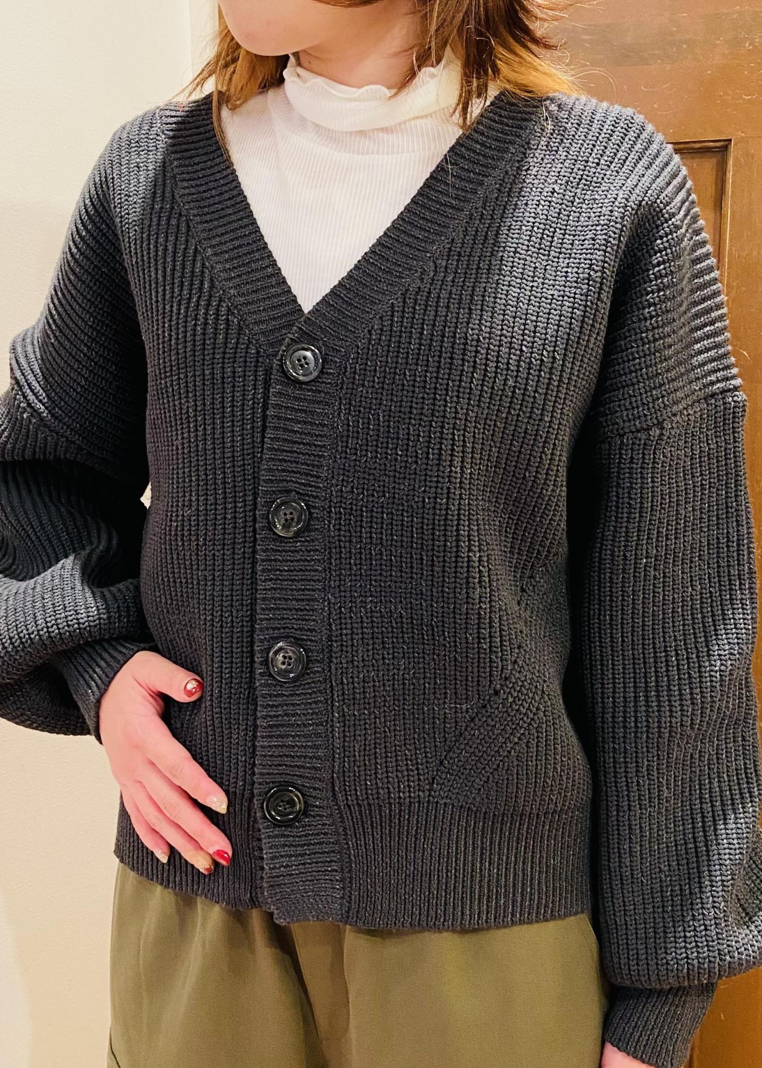 チャコールのカーディガンにカーキのパンツを合わせたカジュアルで秋らしいカラーのコーデにしました。