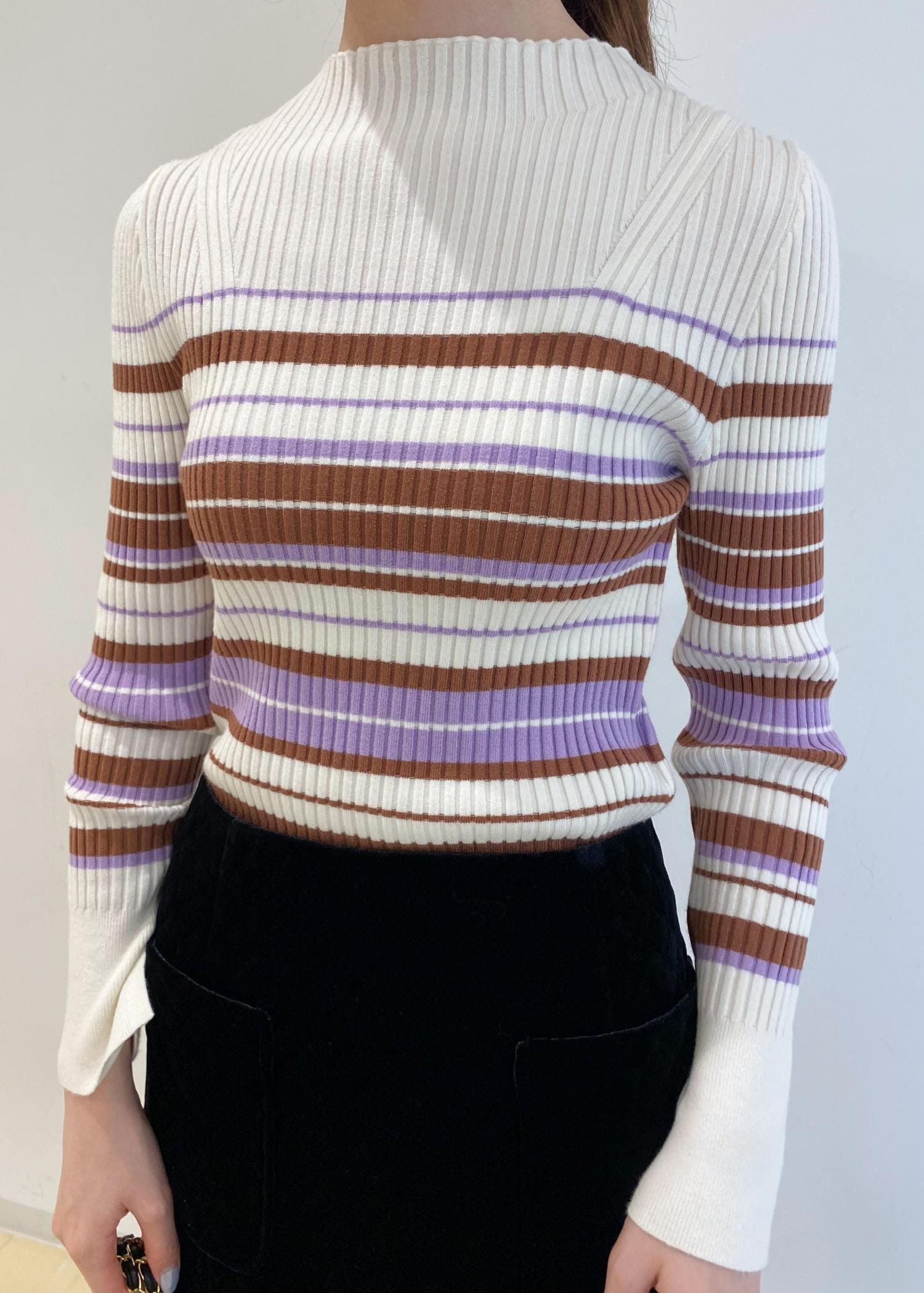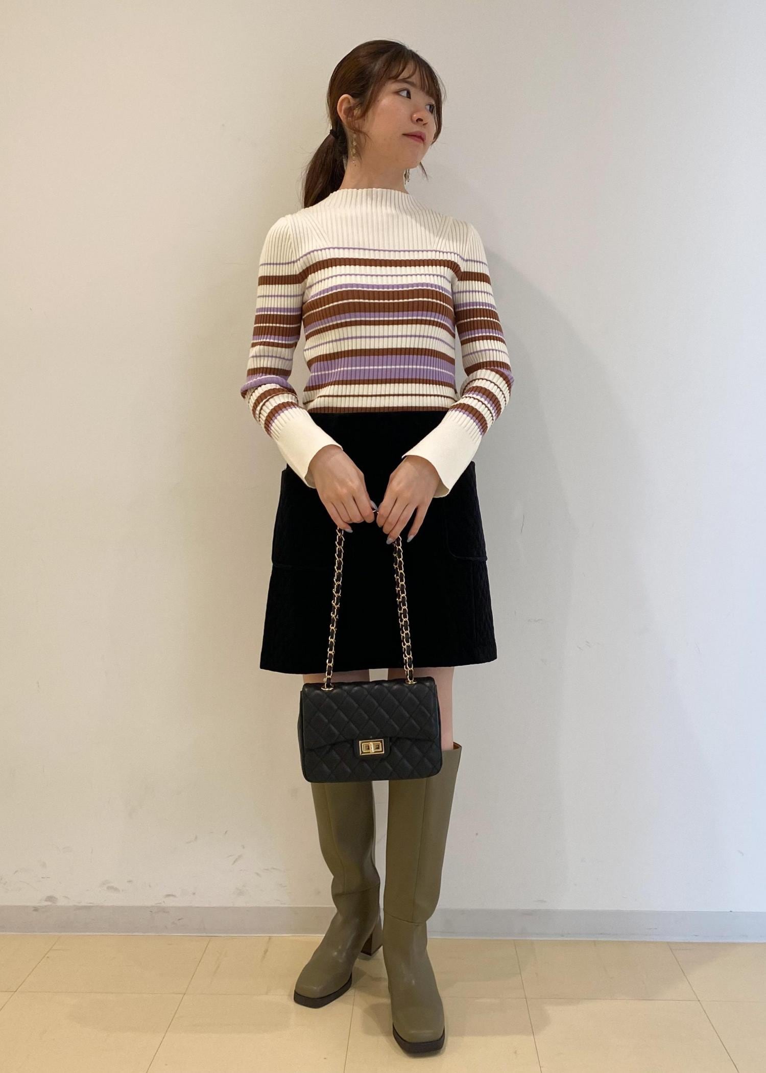 トップスのリブニットは体のラインを拾いすぎず、パープルとブラウンのボーダーが華やかな印象です♪