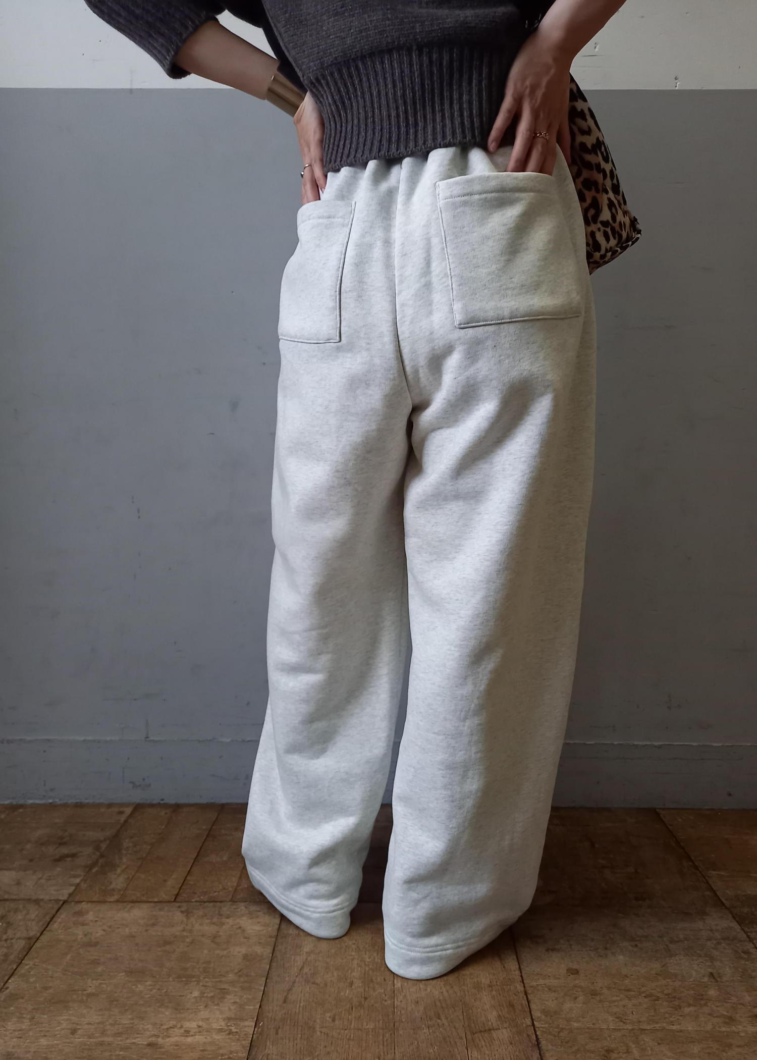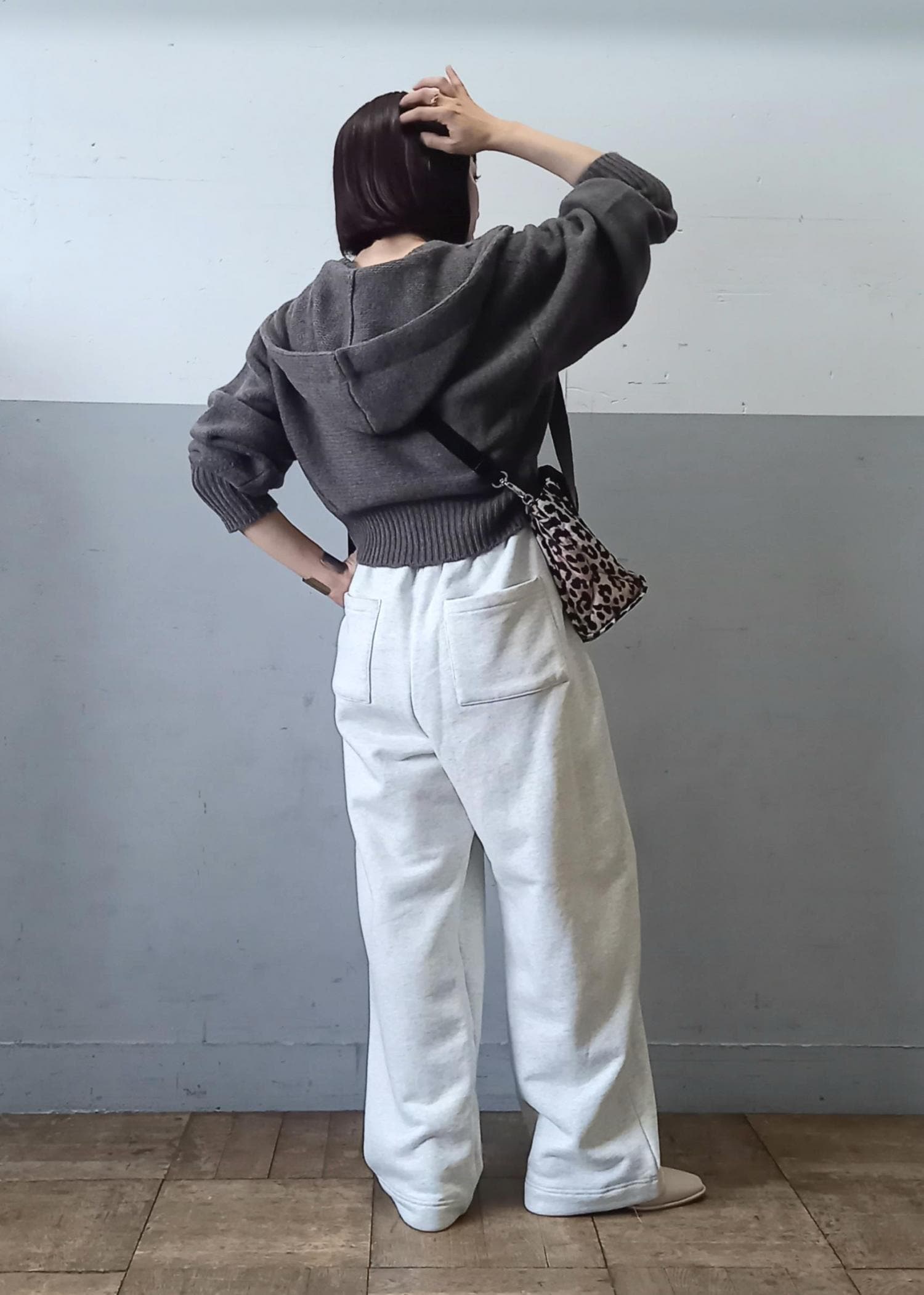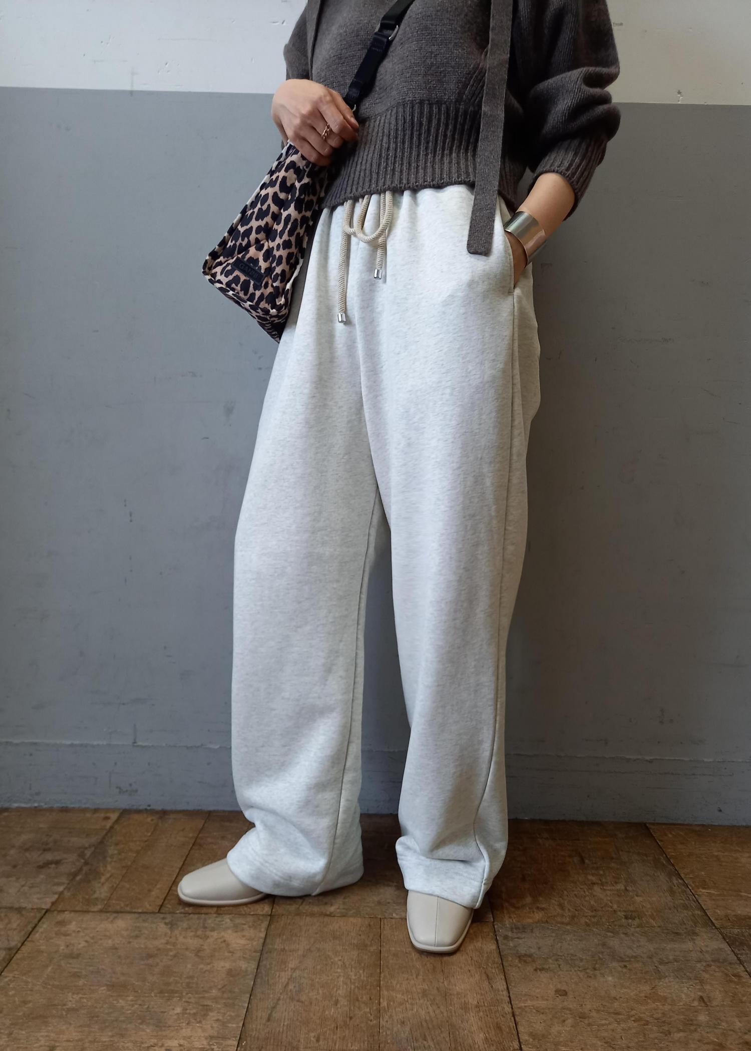 スウェットでは珍しいワイドシルエットパンツで格好よく。