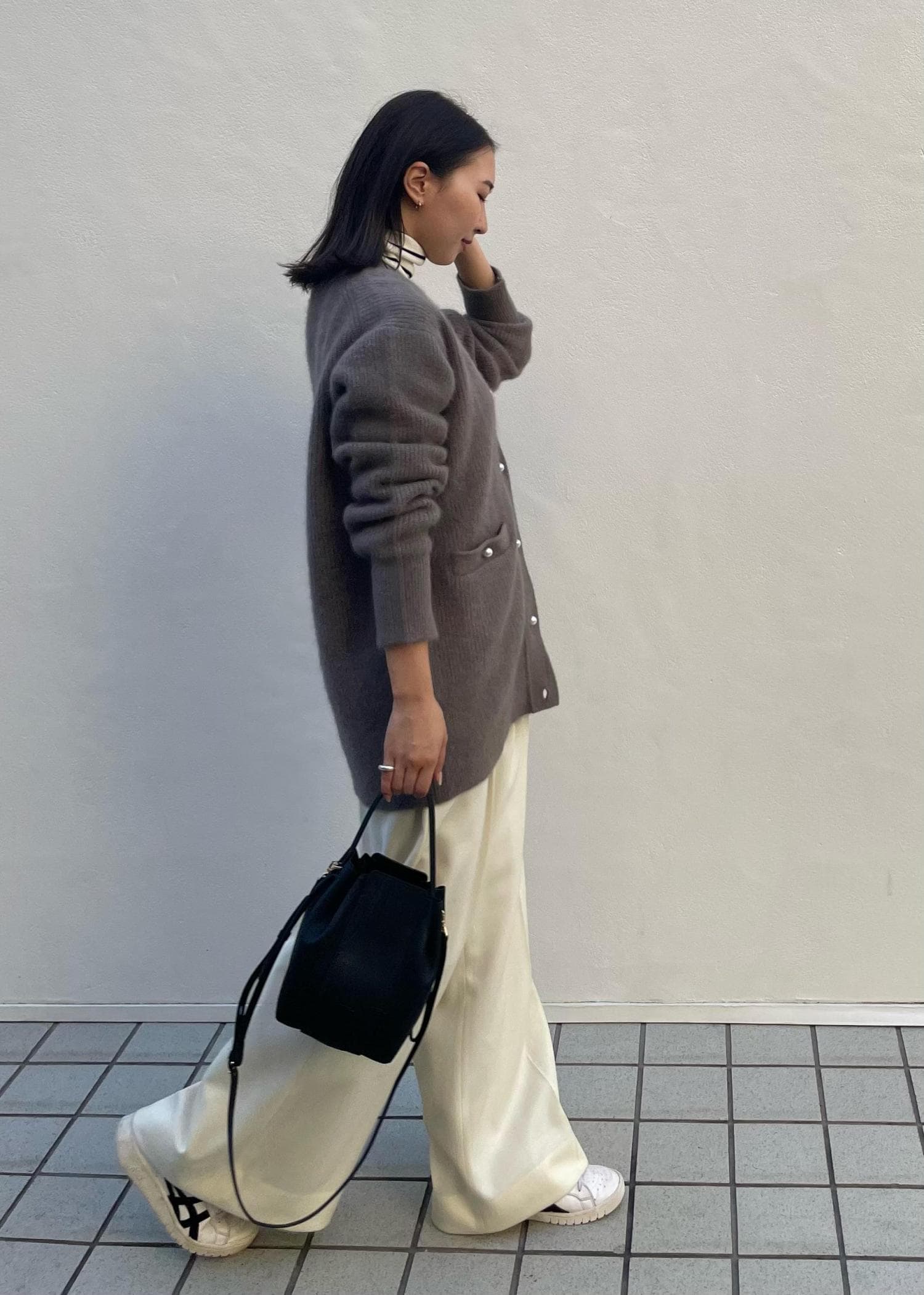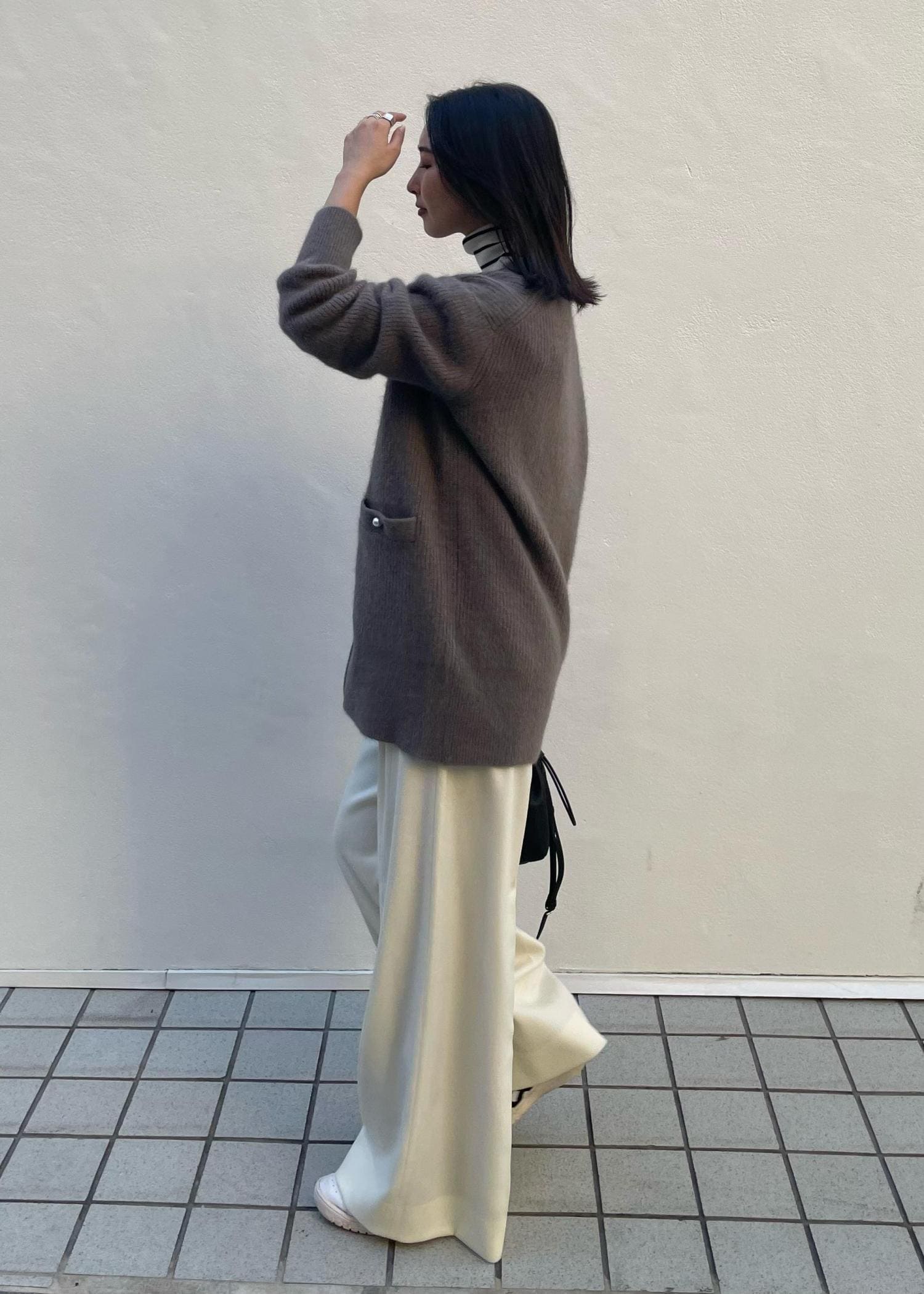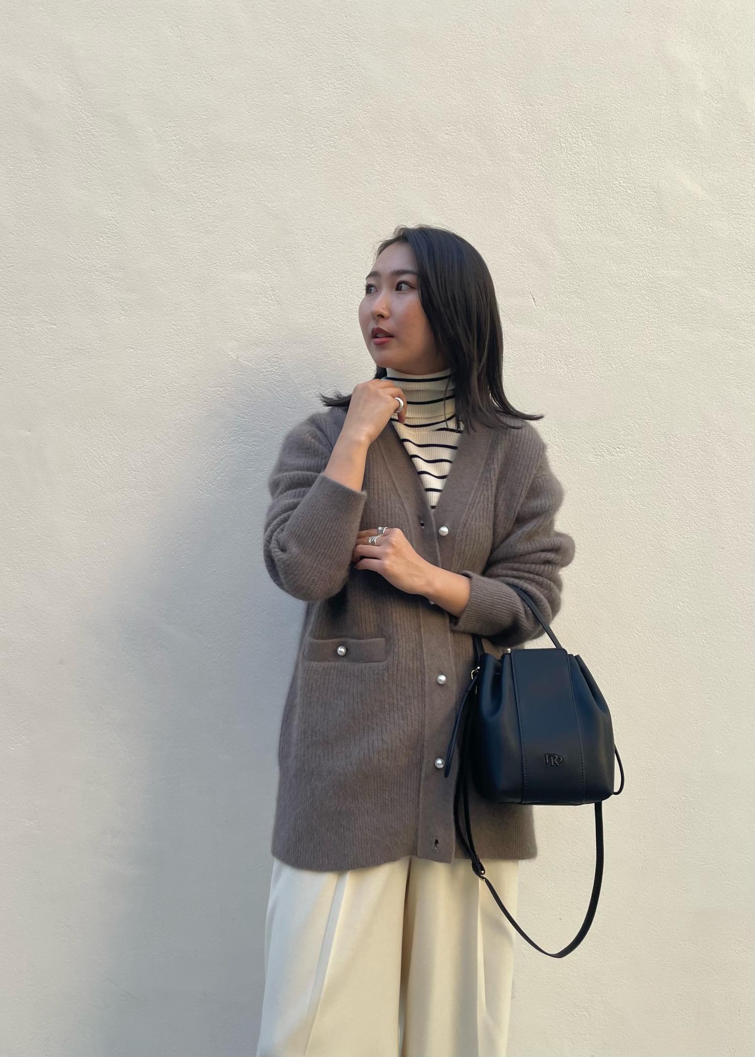 コートを着るまでじゃないなぁ‥、という日におすすめなニットカーディガンスタイル。