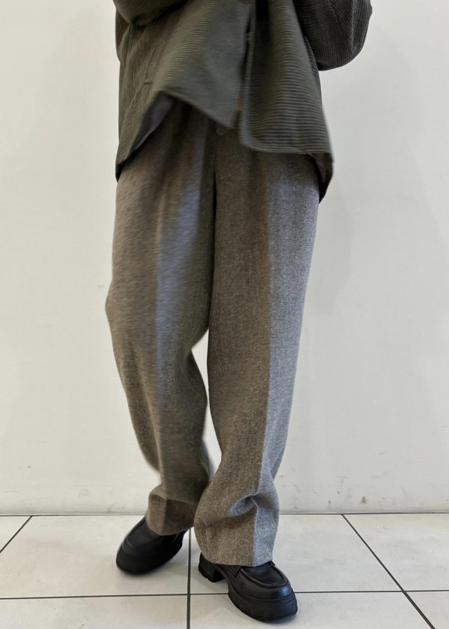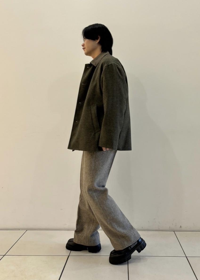 ウールツイードの様な素材感ですが、実はあえてポリエステルで作ってます。