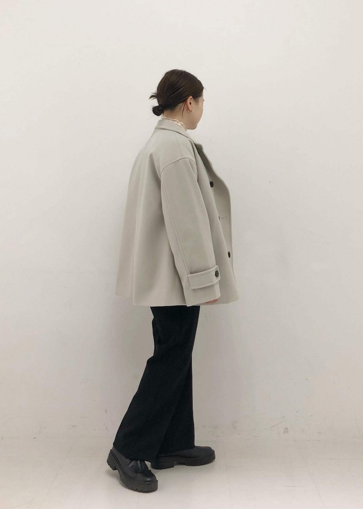 カッコ良くも、キレイめにも仕上げてくれるスタンドカラーコートを合わせたスタイリングです。