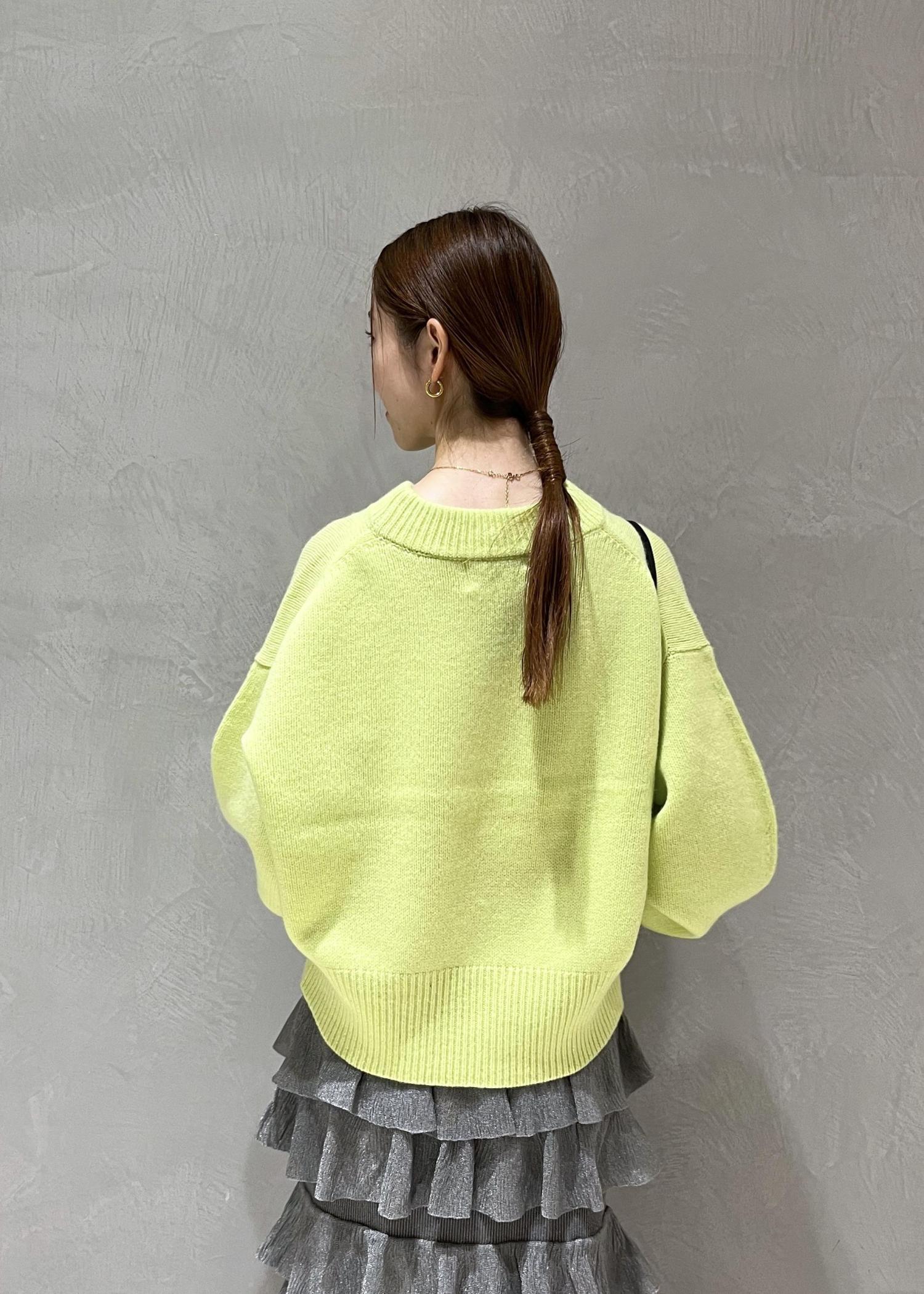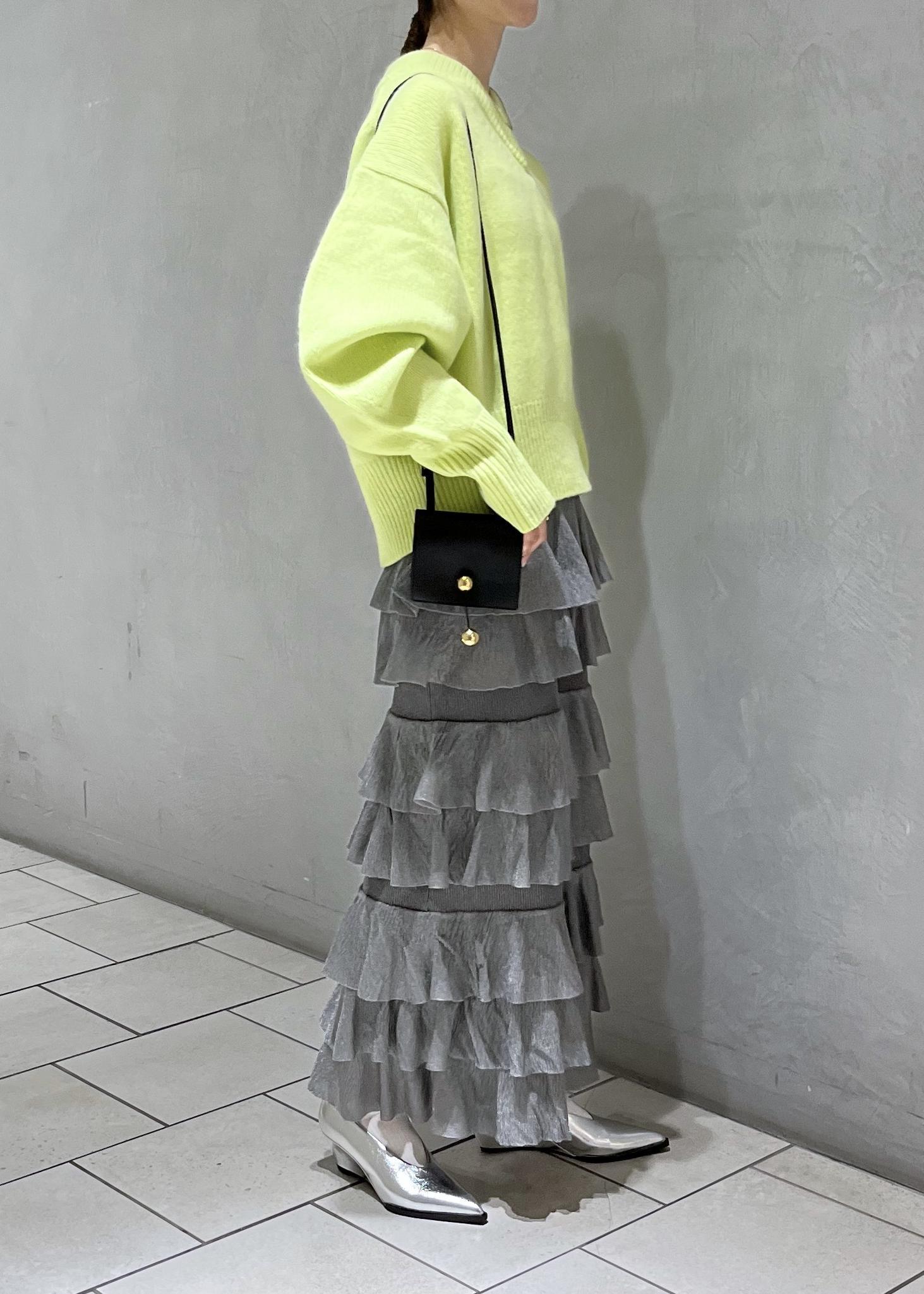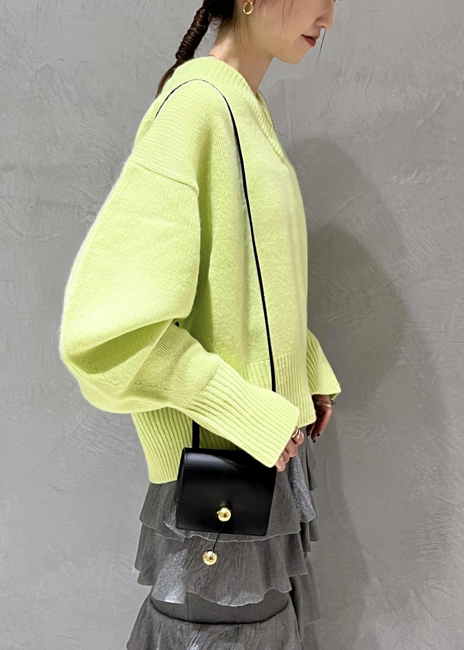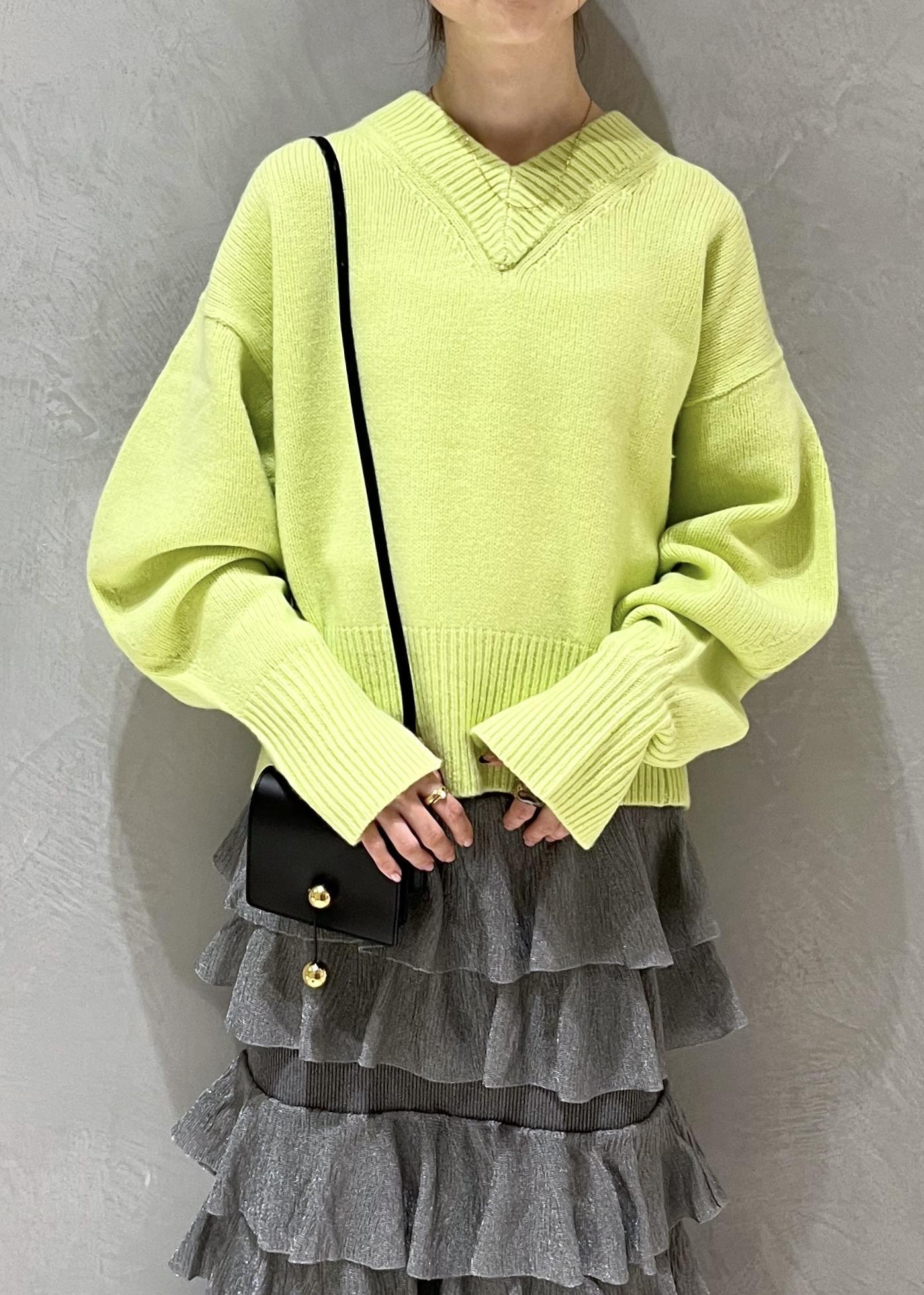 鮮やかなグリーンとフリルスカートでフェミニンな雰囲気に。