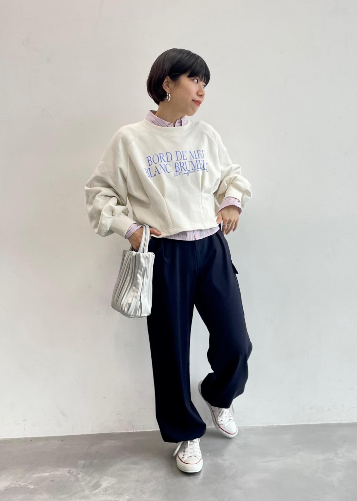 クロップド丈のスウェットに、クロップド丈のCALINE×ROPE' PICNICシャツを合わせたトレンドコーデ。