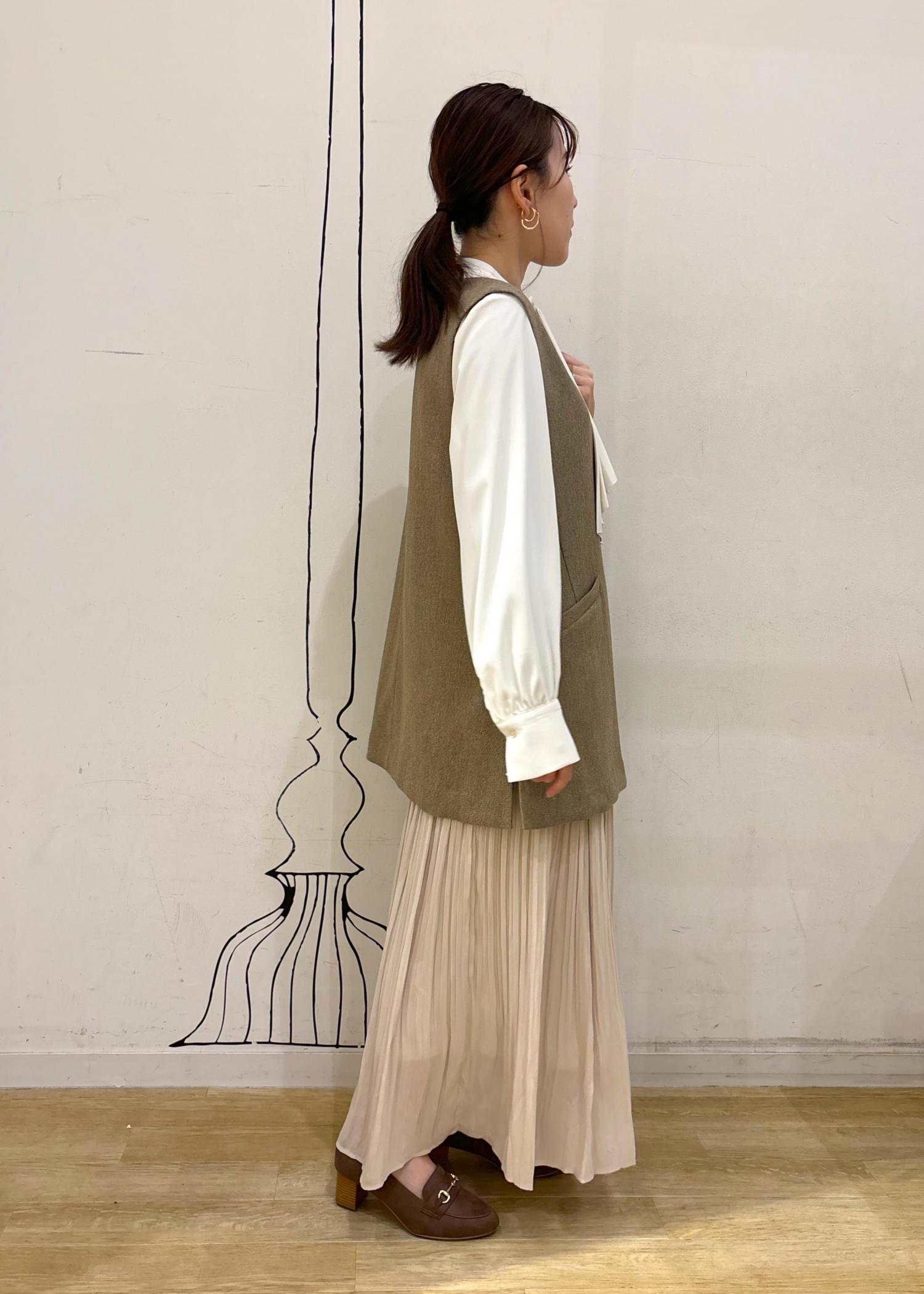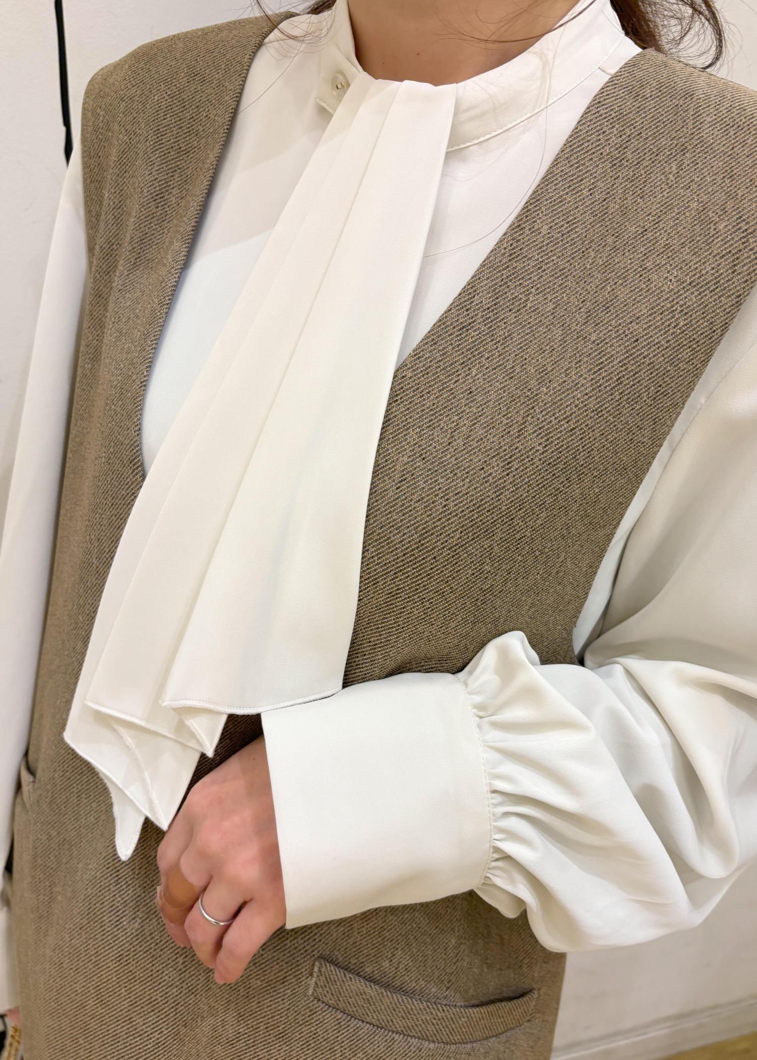 ボウタイブラウスはネックレスなど小物がなくても華やかさアップしますがボウタイを外してシンプルに着ることもできます。