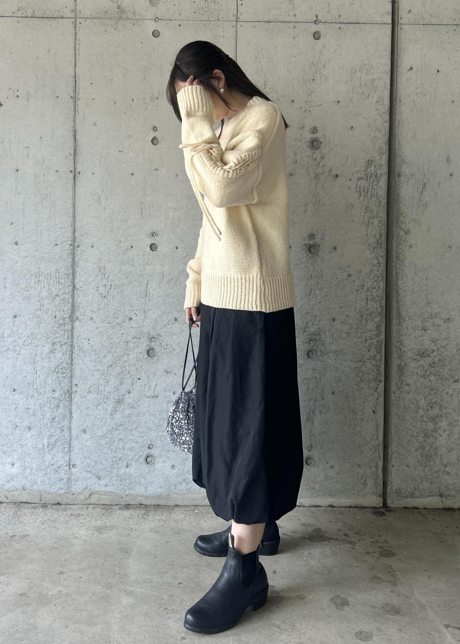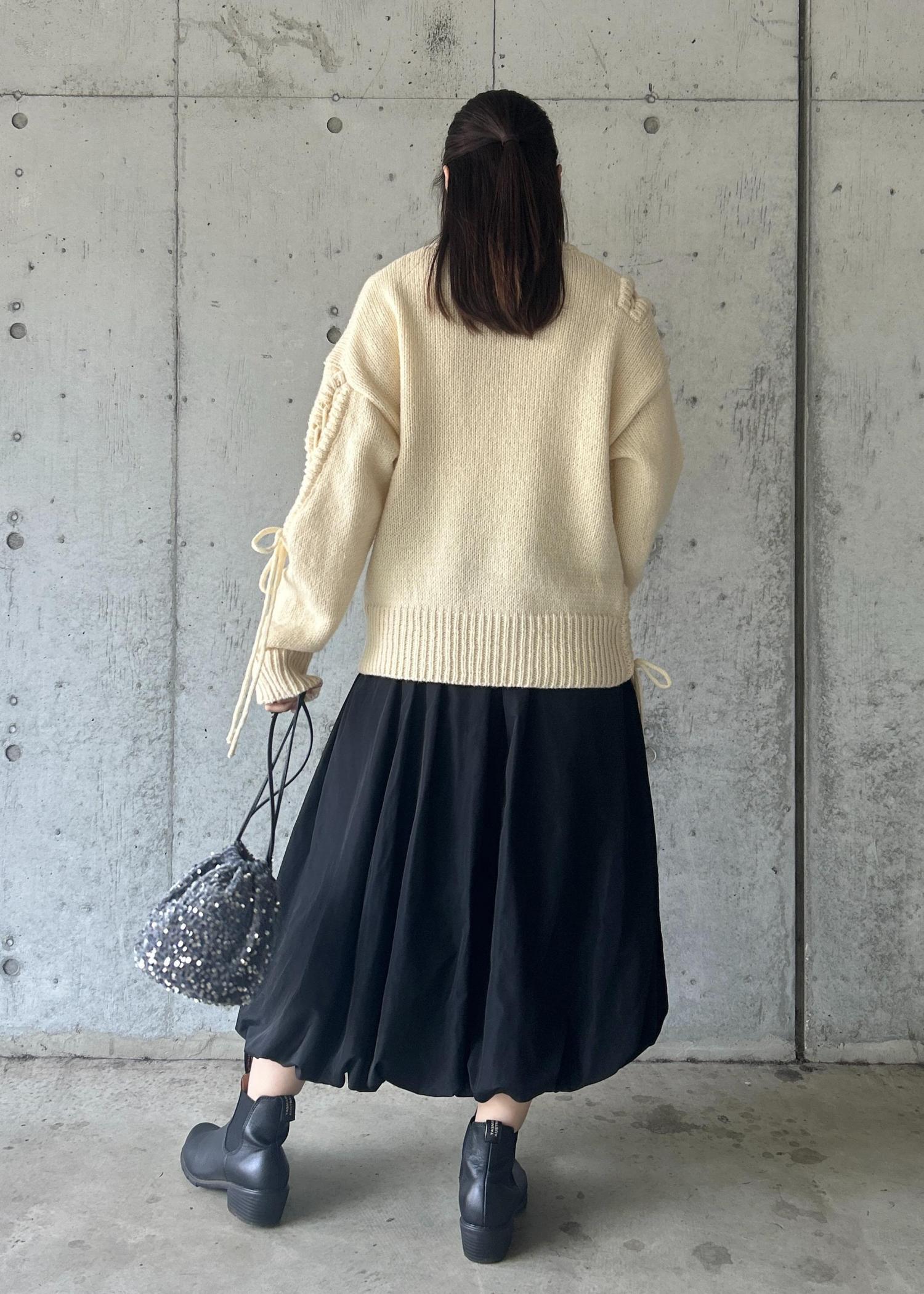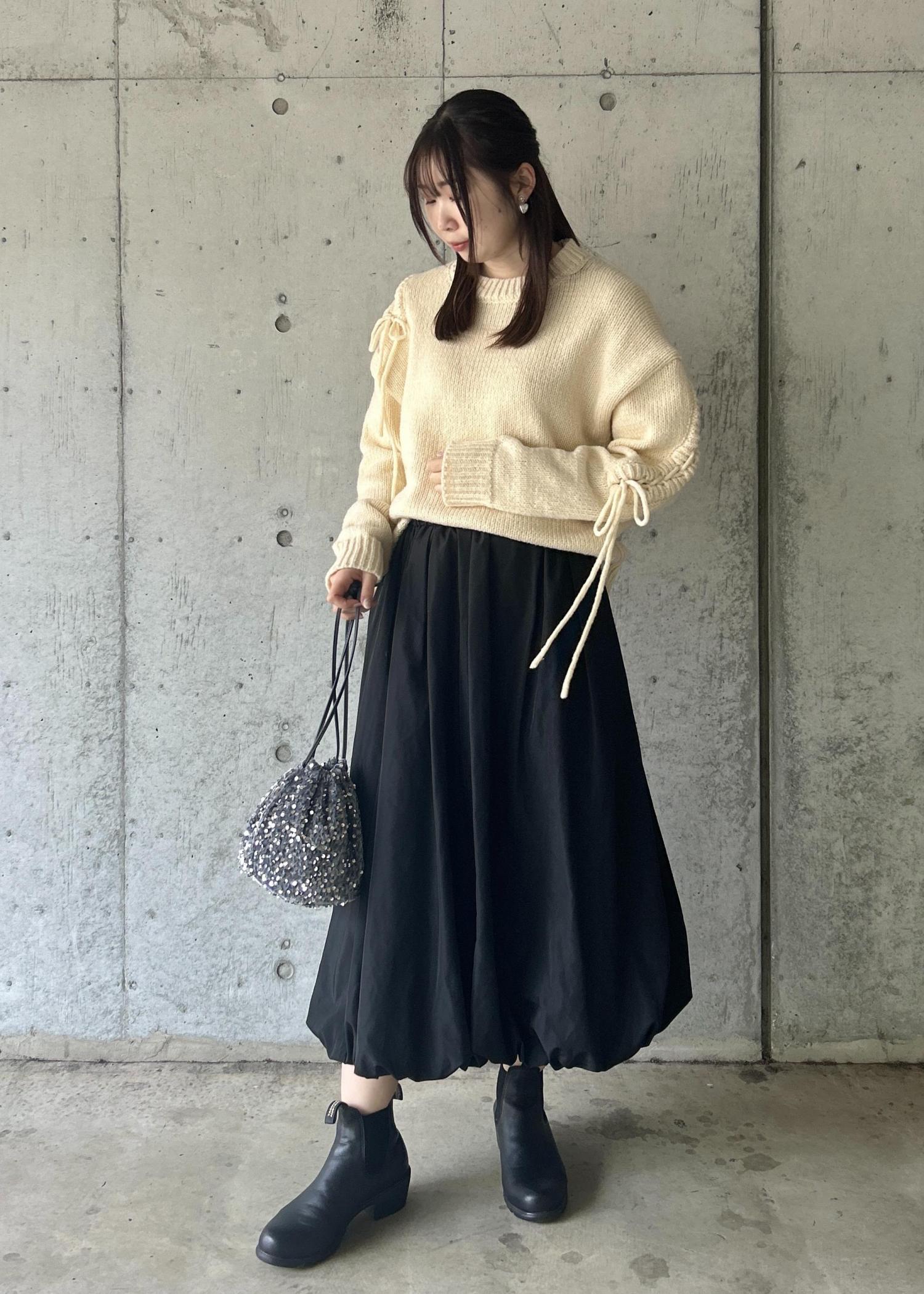白のニットと黒のバルーンスカートを合わせたコーデです♪