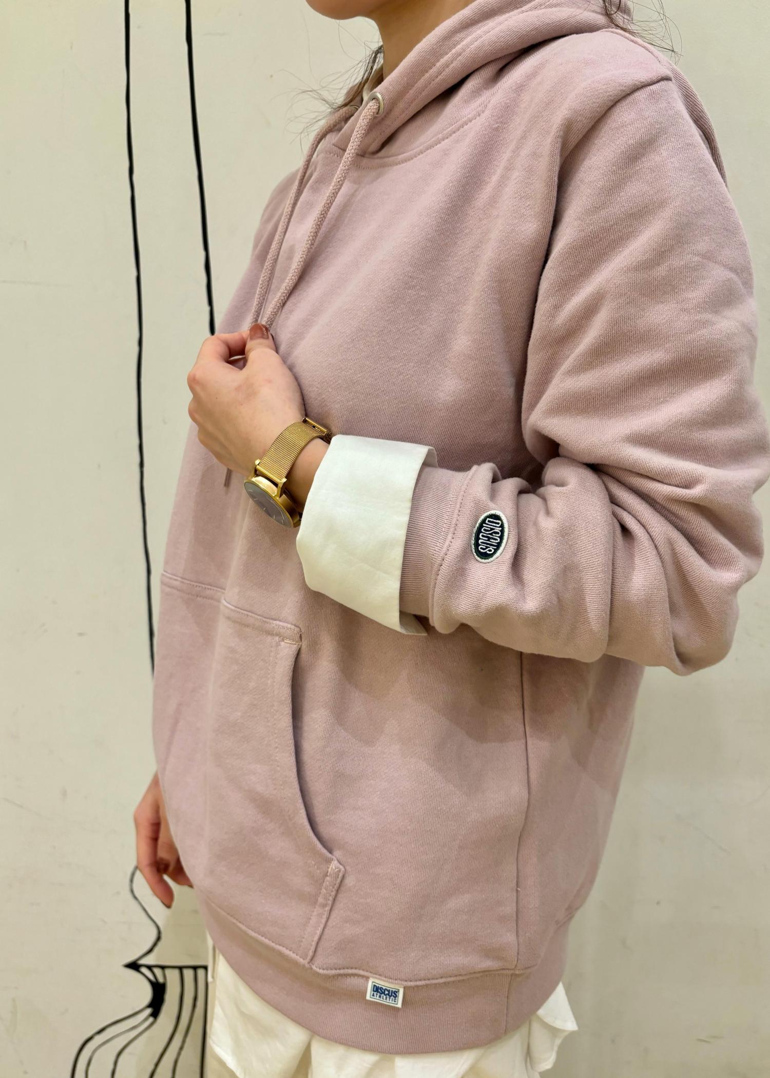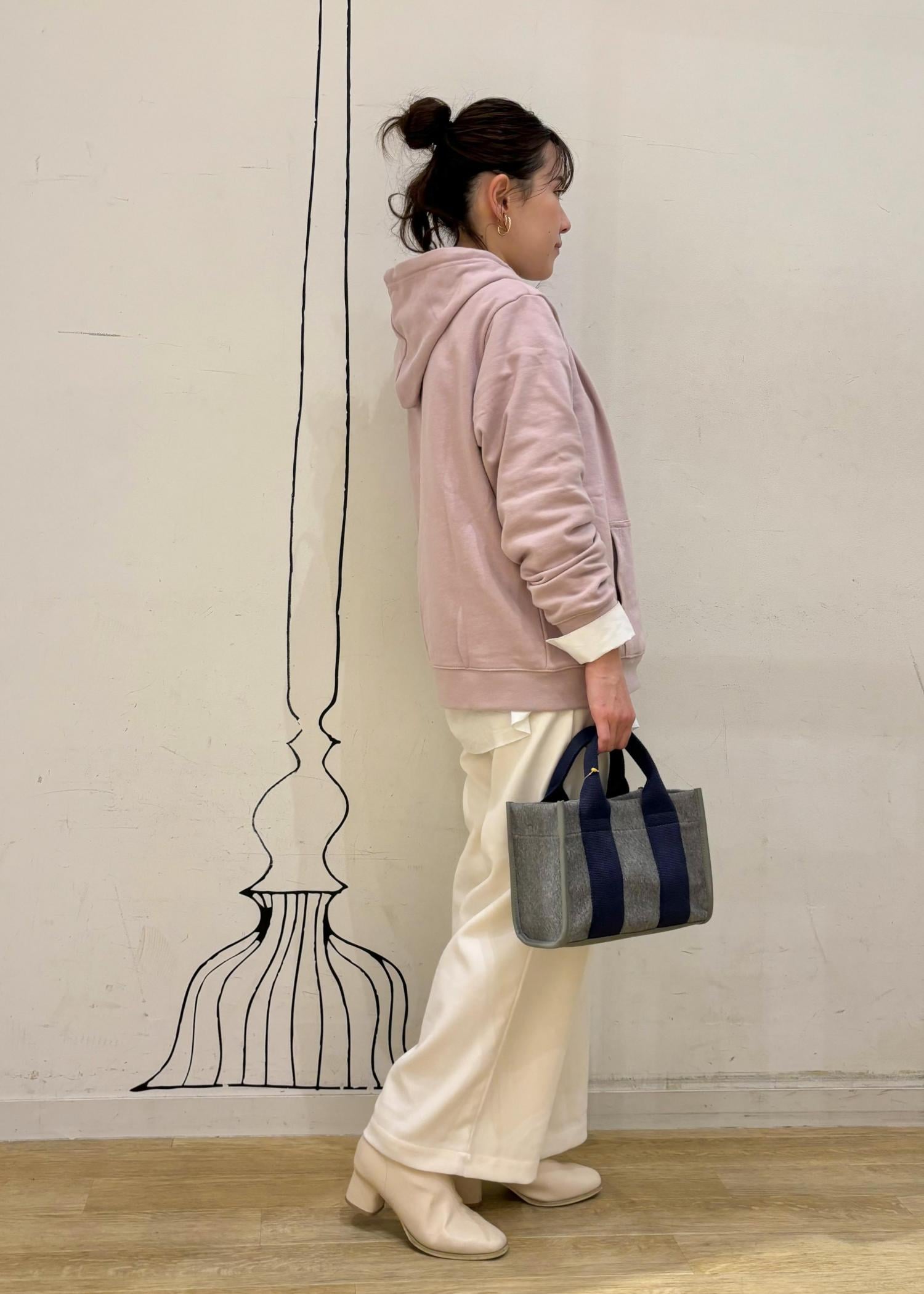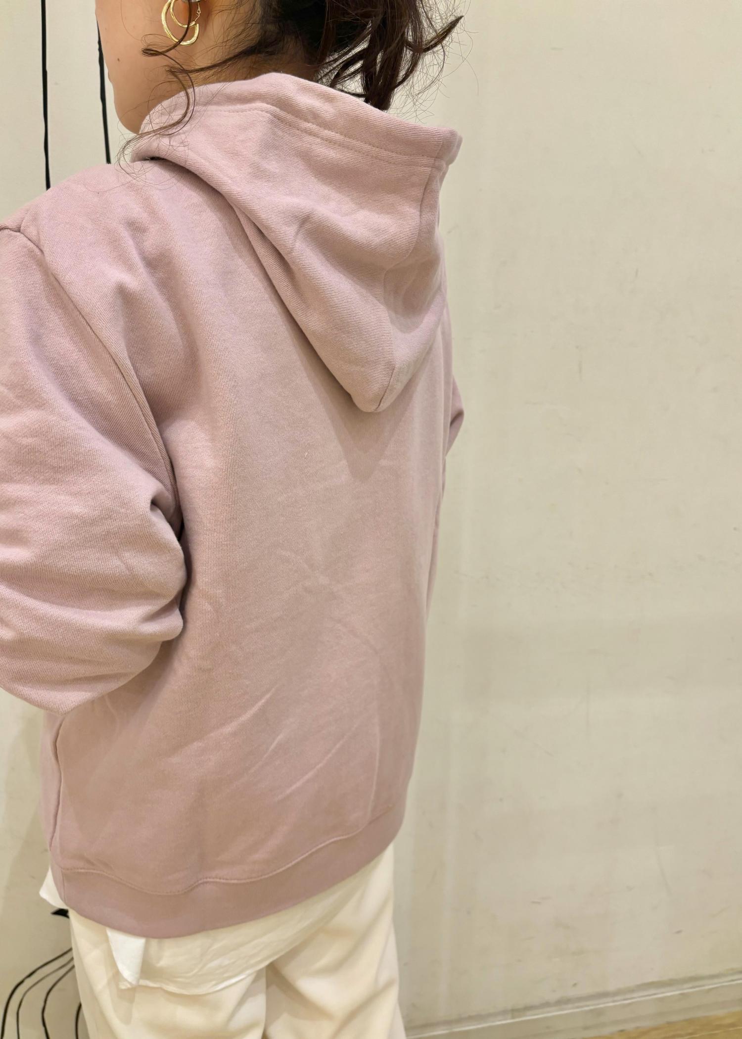 パーカーがラフになりすぎないようにピンク×白合わせでフェミニンな印象に。パーカーはタートルネックやシャツなどレイヤードスタイルがおすすめです。