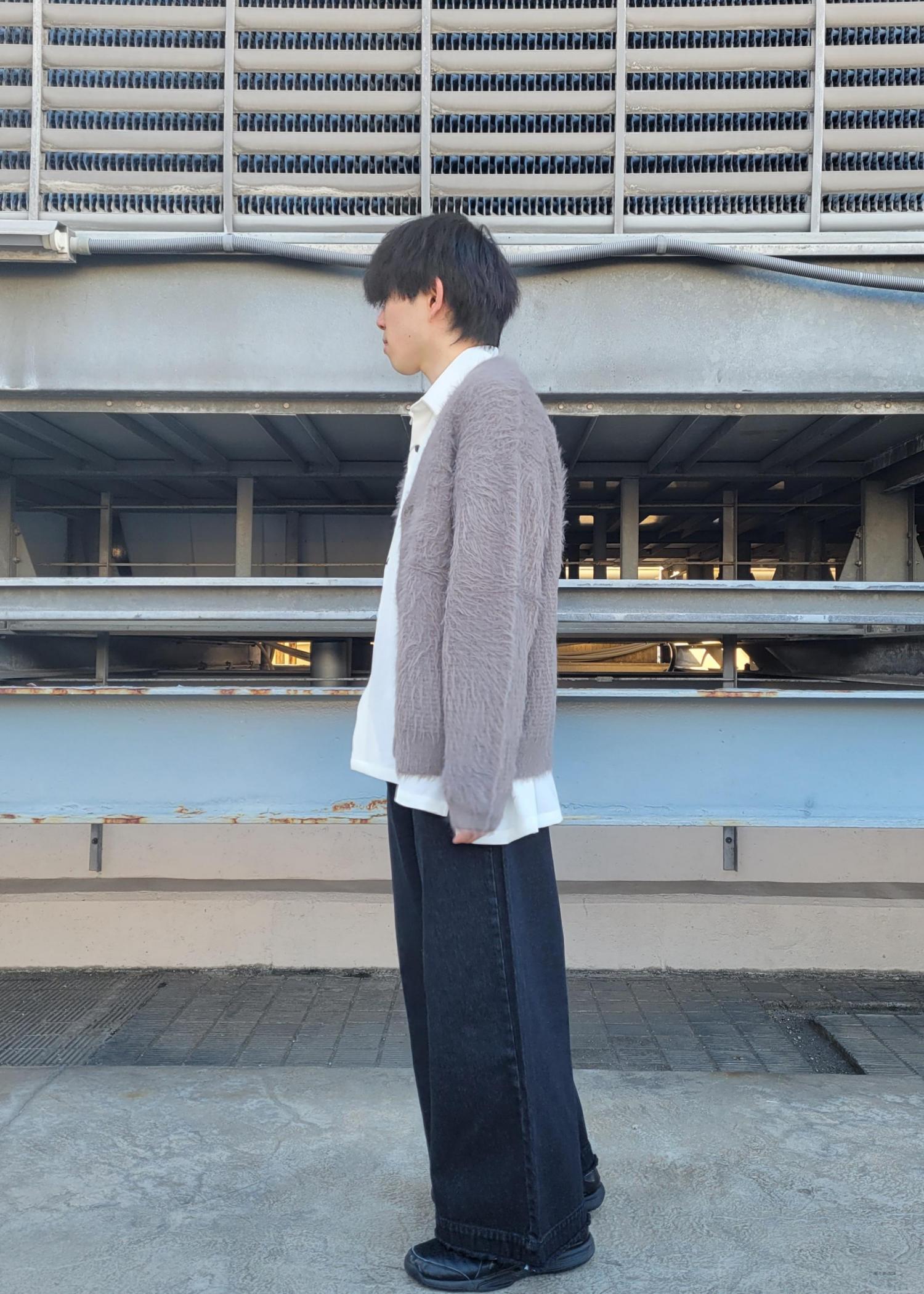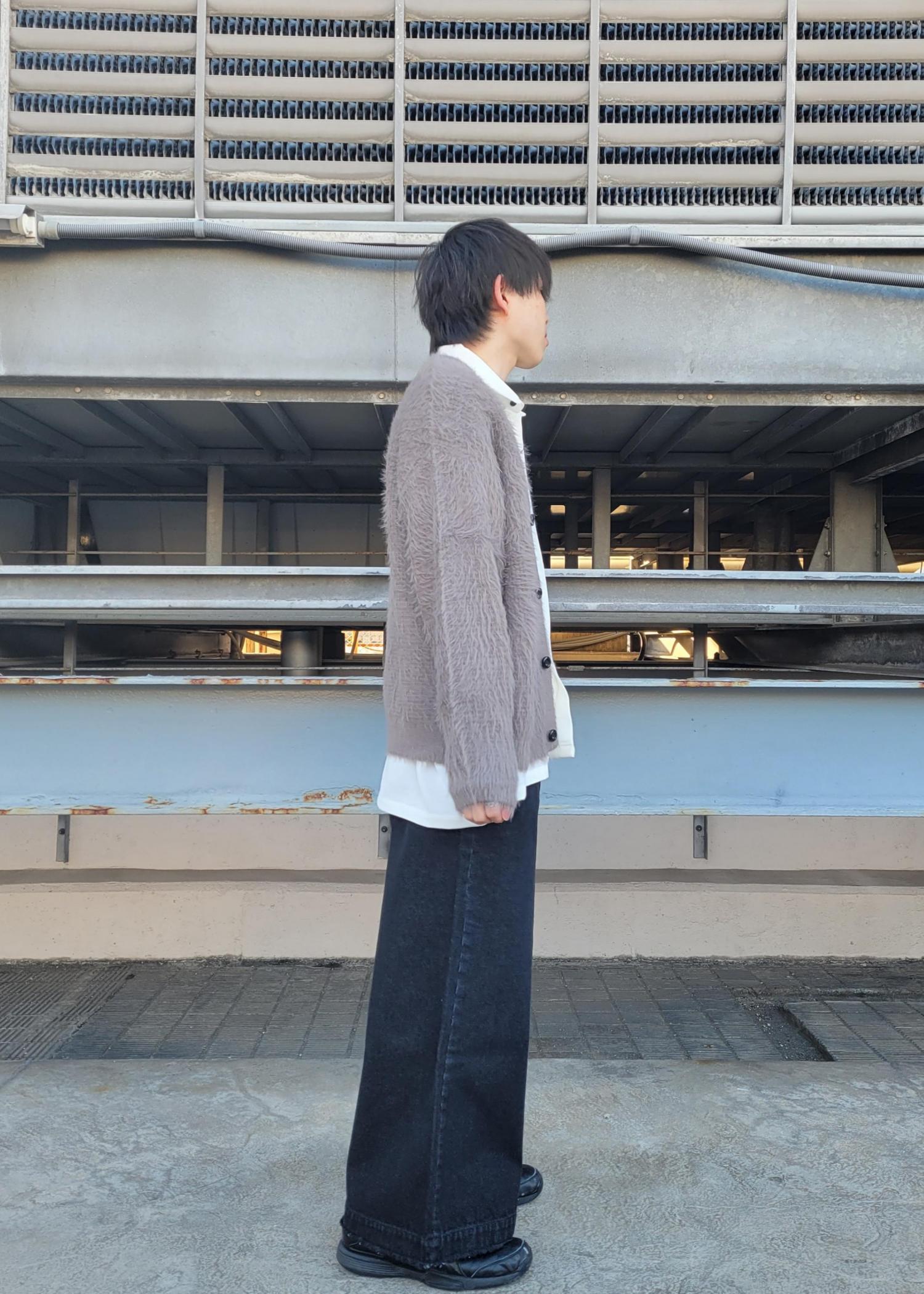 今回はこの冬大人気のふわふわ系アイテム『シャギーニットカーディガン』をメインにコーデを組んでみました!インナーには相性のいい白シャツを採用!全体的にカジュアル感を出すためにボトムスもデニムワイドフレアパンツに黒スニーカーで合わせています!