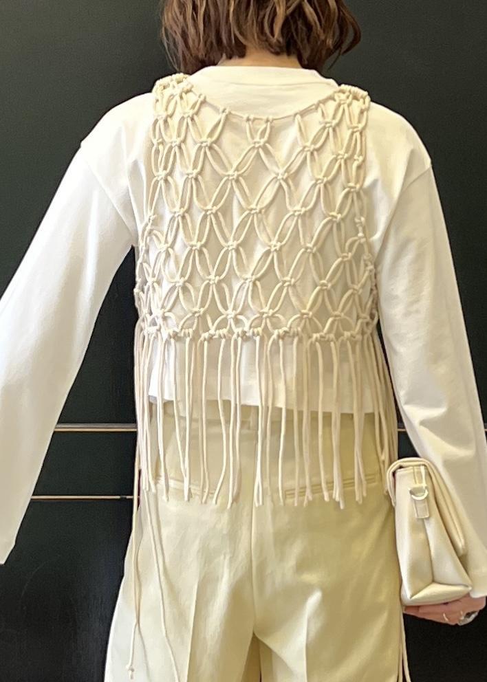 比較的コンパクトなサイズ感なので、ロープ編み&フリンジでも民族調にならないですよ。