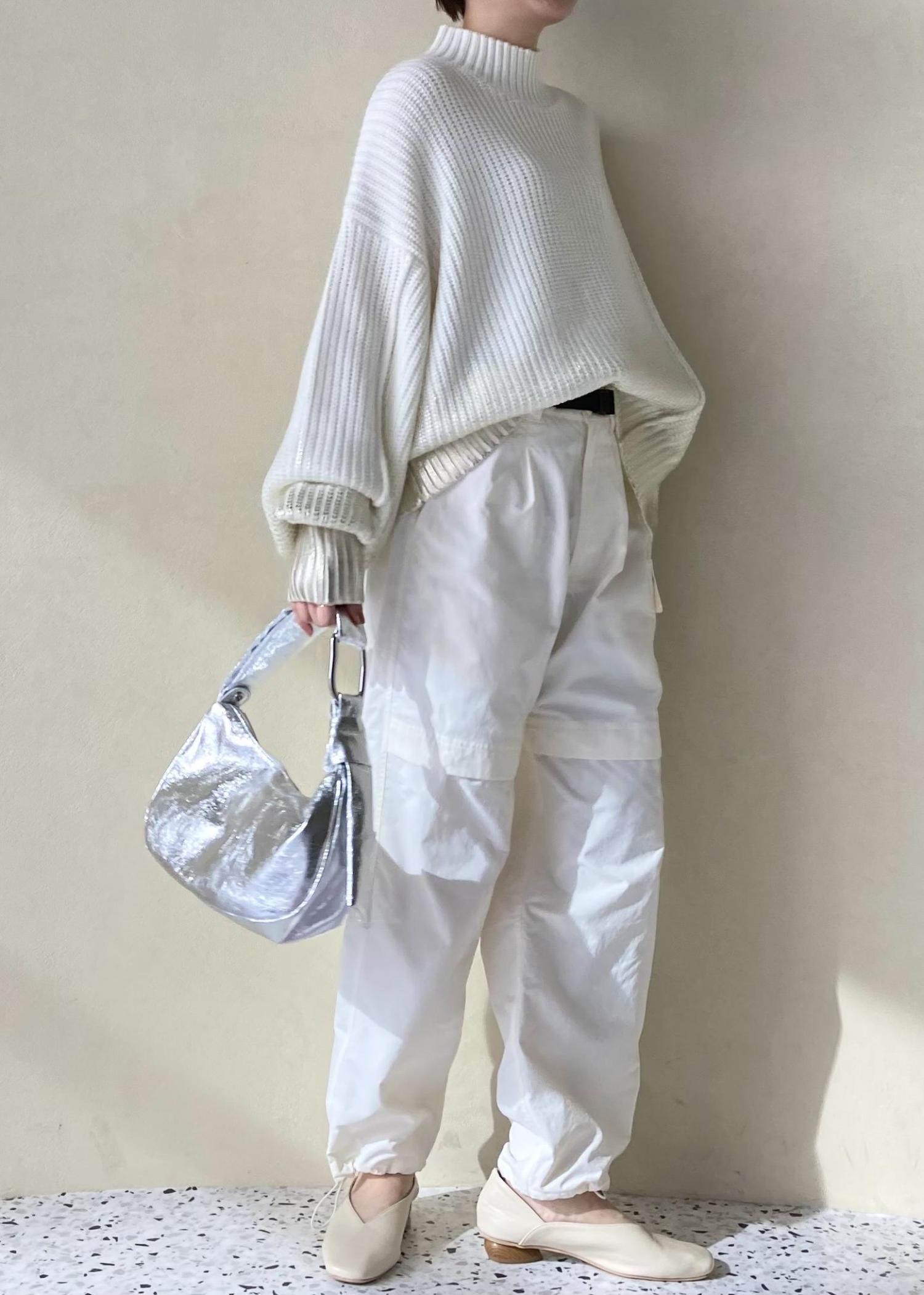 マットなカーゴパンツなので、シャツやヒールなどきれい目なアイテムとも相性が良いです◎