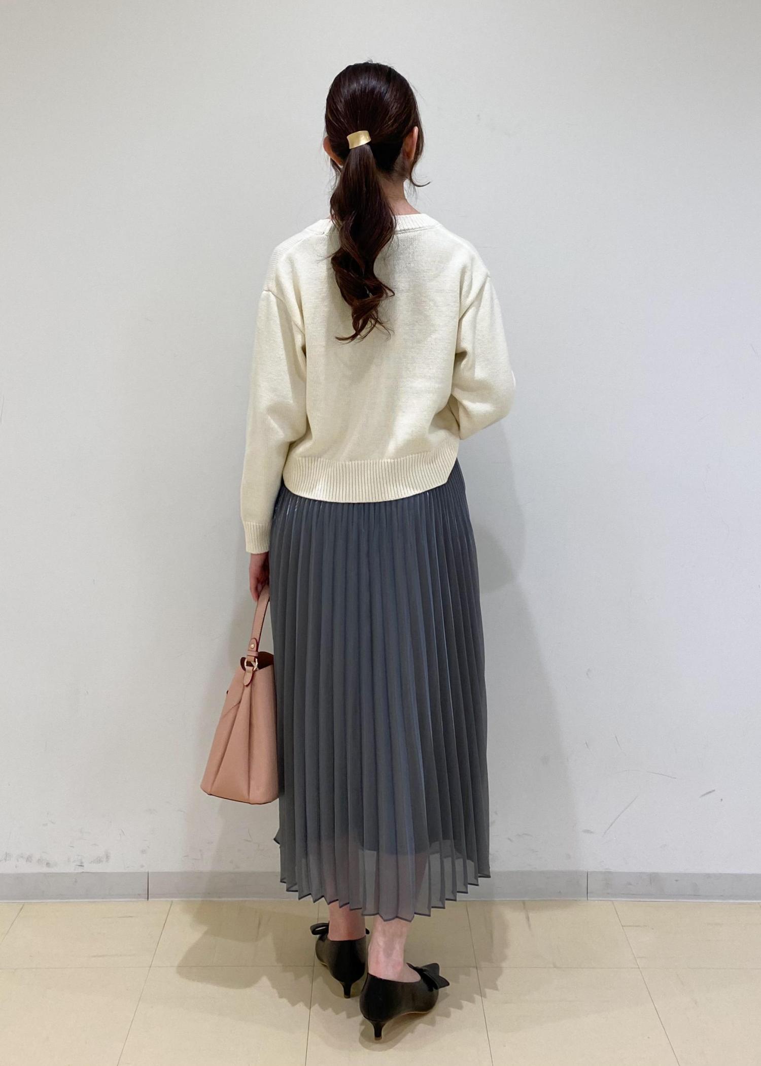 グレーの光沢感があるプリーツスカートを合わせて、落ち着いた雰囲気にしました◎