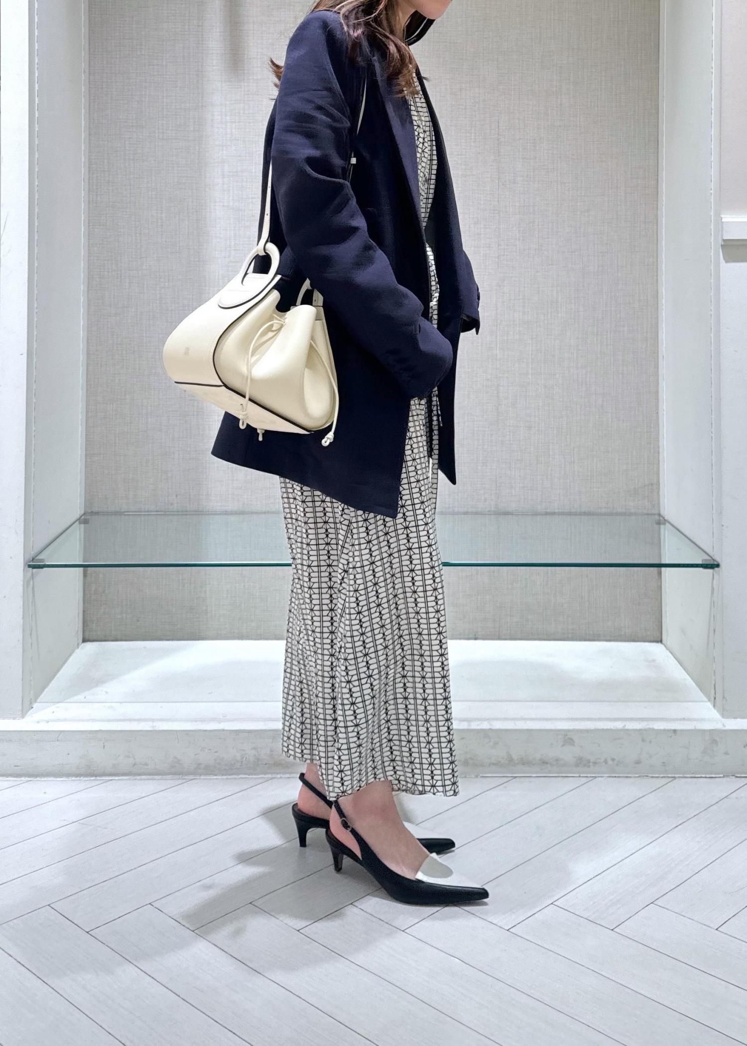 モノグラムが目を惹くワンピースに、ジャケットを合わせて、綺麗めカジュアルコーデにしてみました♩一枚で着映えするワンピースは上品でお出かけ日におすすめです◎
