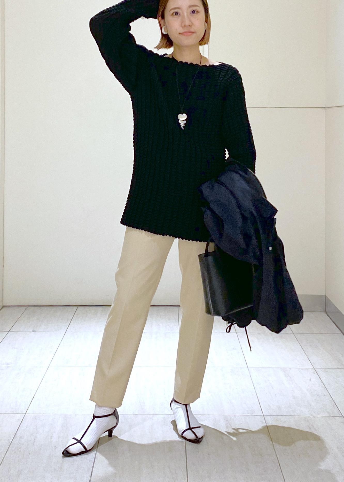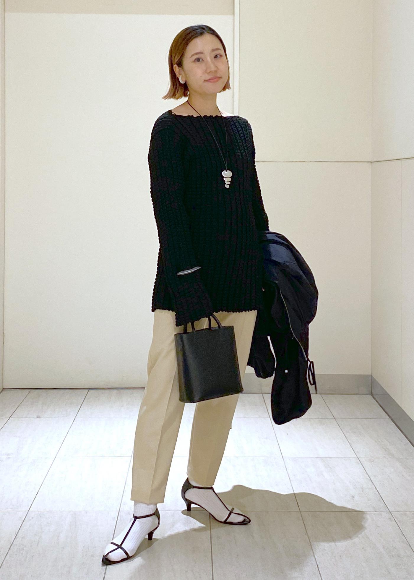 卵のような色味が可愛いベージュとブラックを合わせてスタイリングしました。