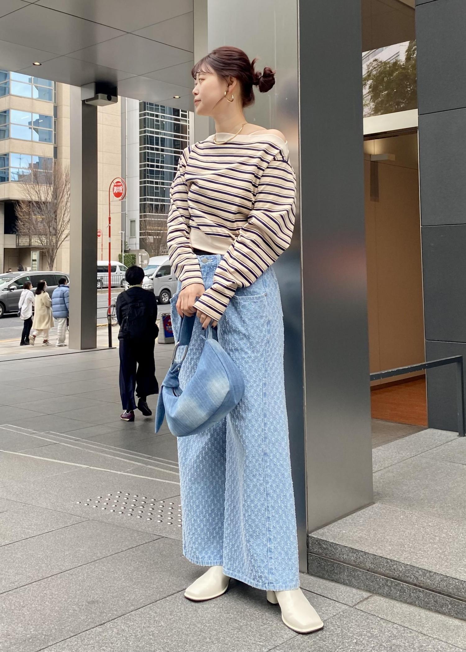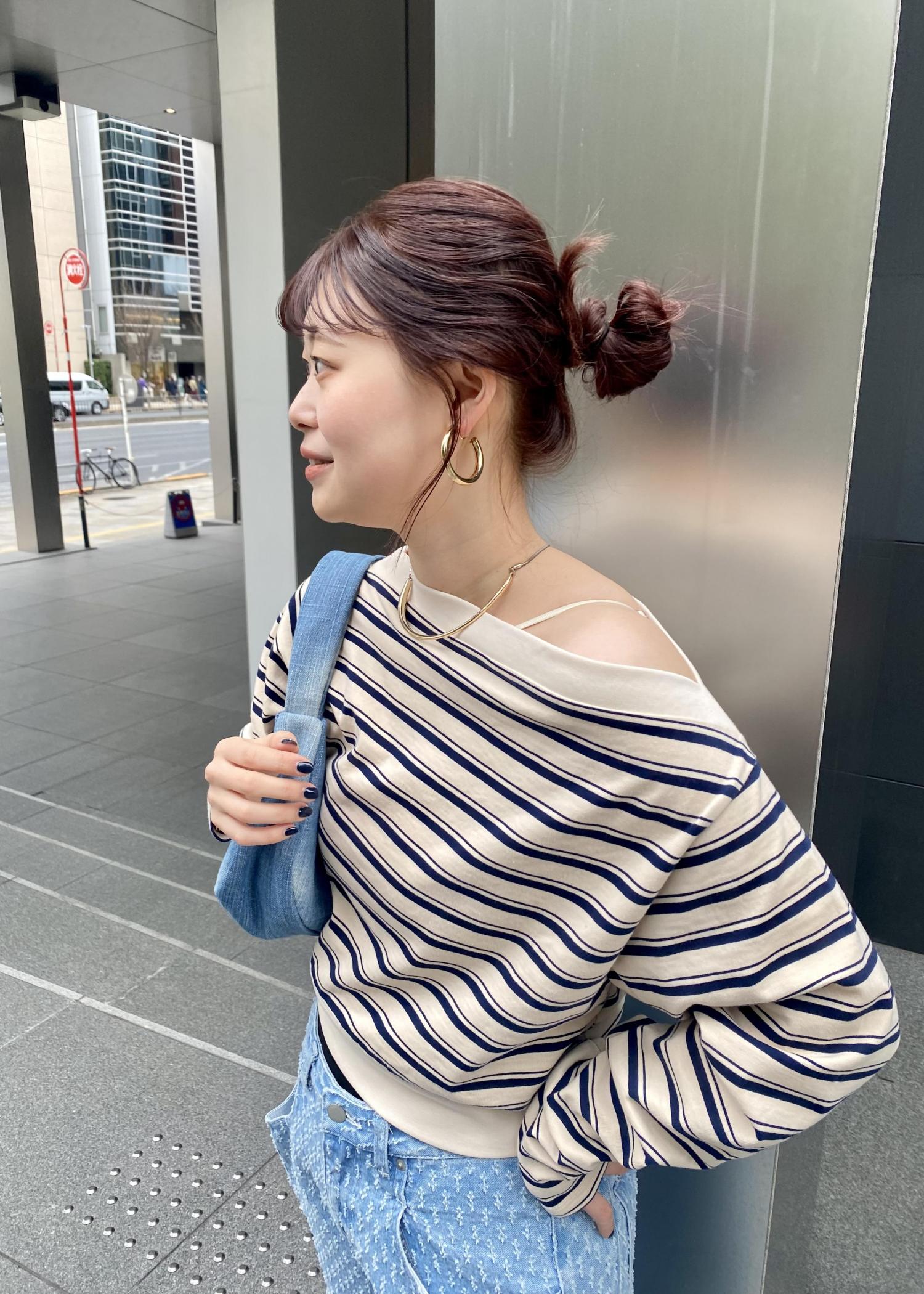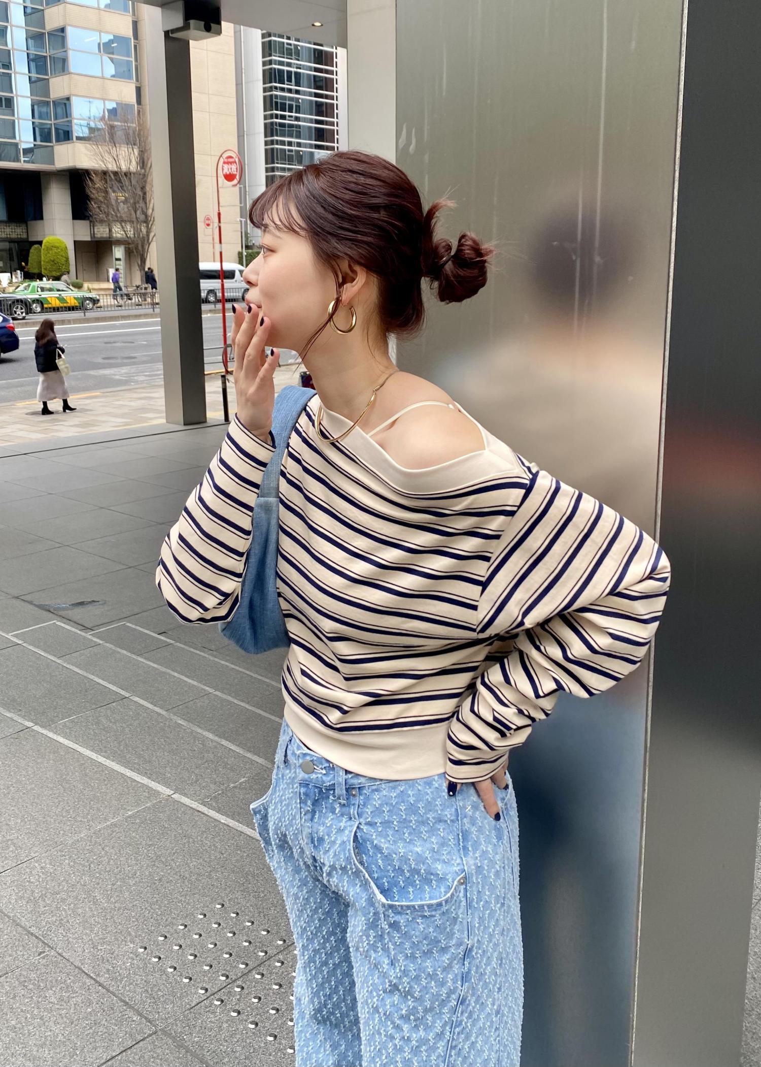 アウトレットVISマルチボーダーオフショルトップスキナリ系 / F¥2,196レビューゆったりめなサイズ感と、オフショルダーにして肩を落として抜け感をだしてもかわいいです♡