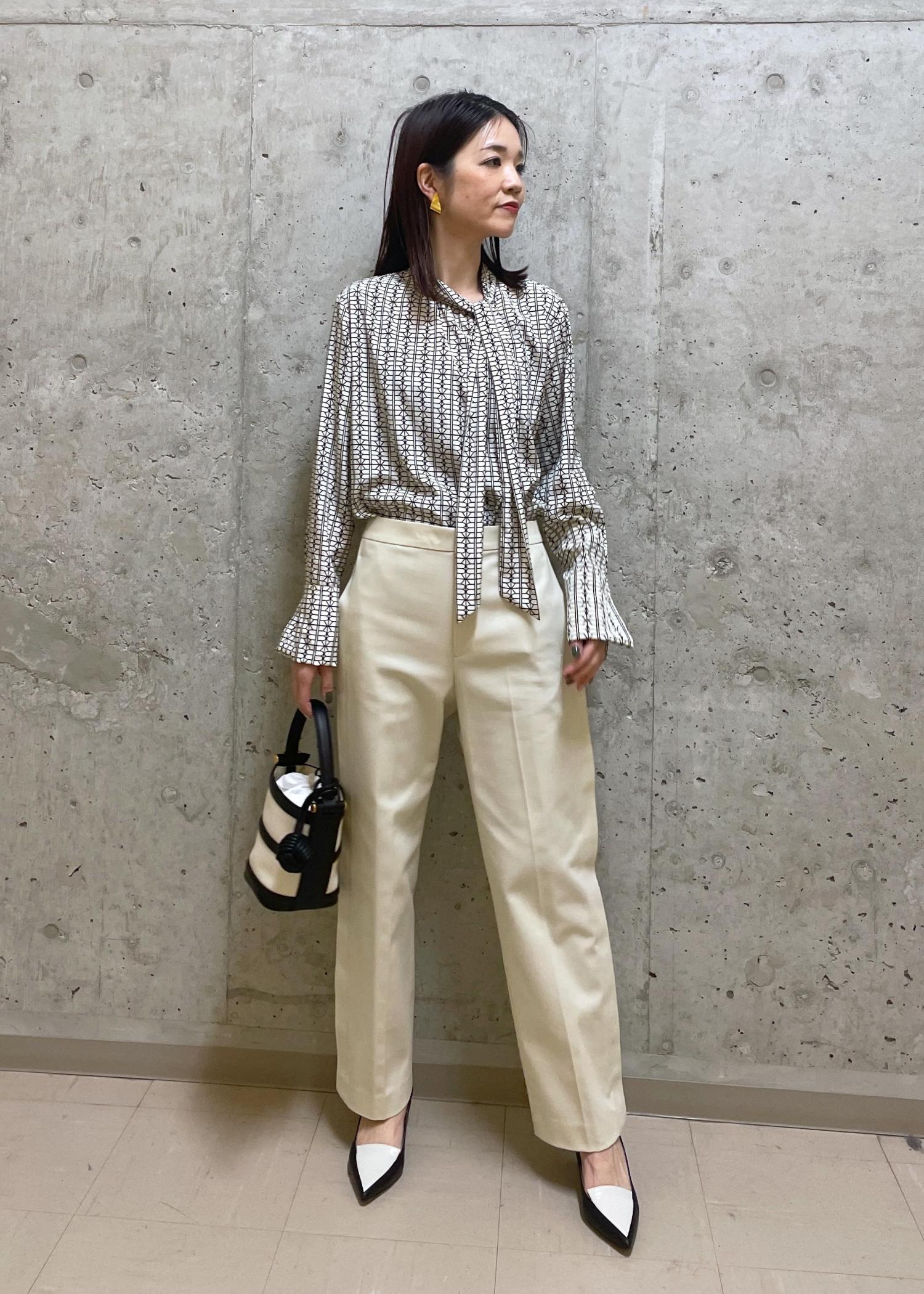 アウトレットROPÉ【雑誌掲載】モノグラムプリントブラウス/無地ボウタイブラウスキナリ系 / F¥10,560レビュー身幅はゆとりのあるサイズ感で、身体のラインを拾わないです。