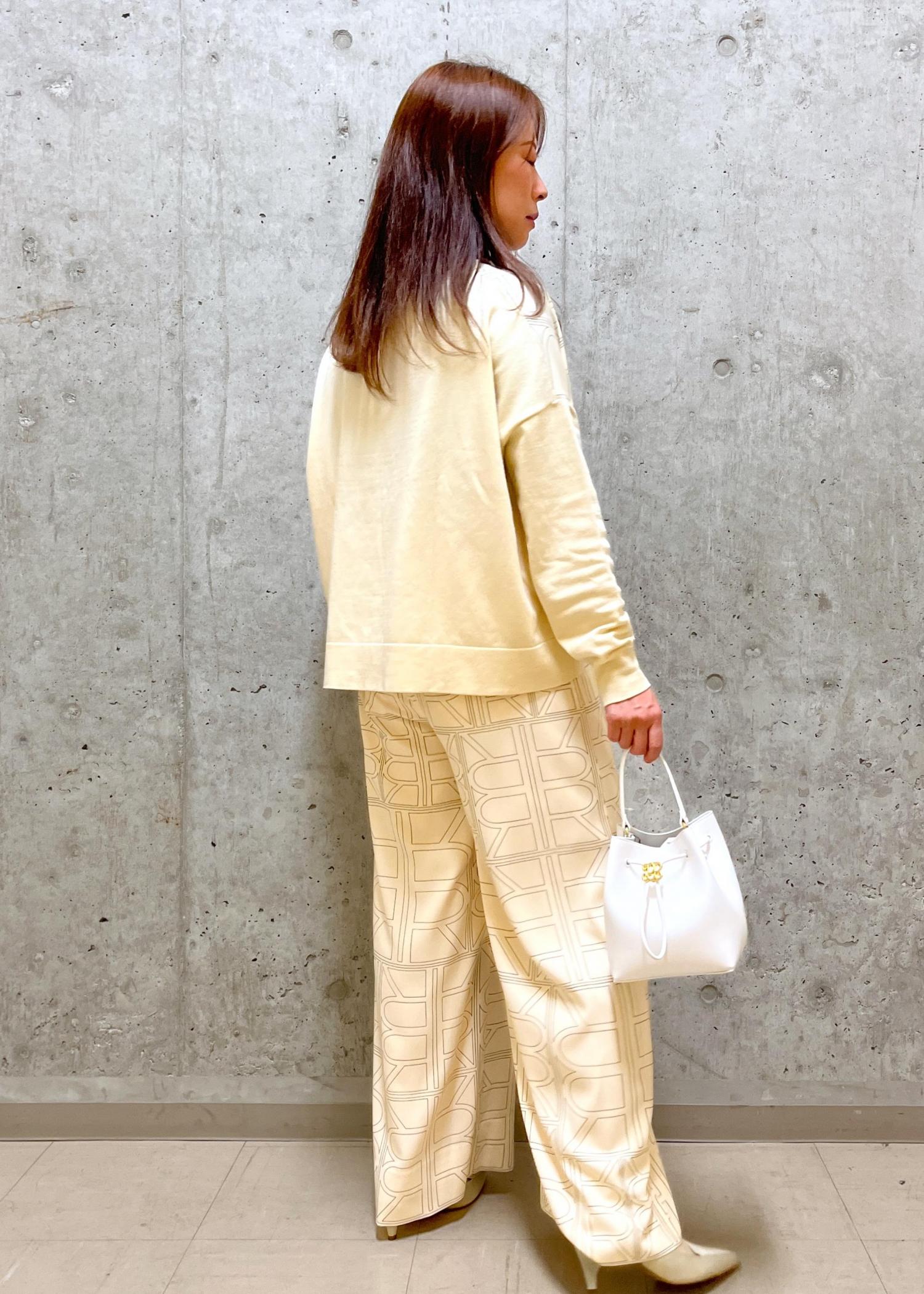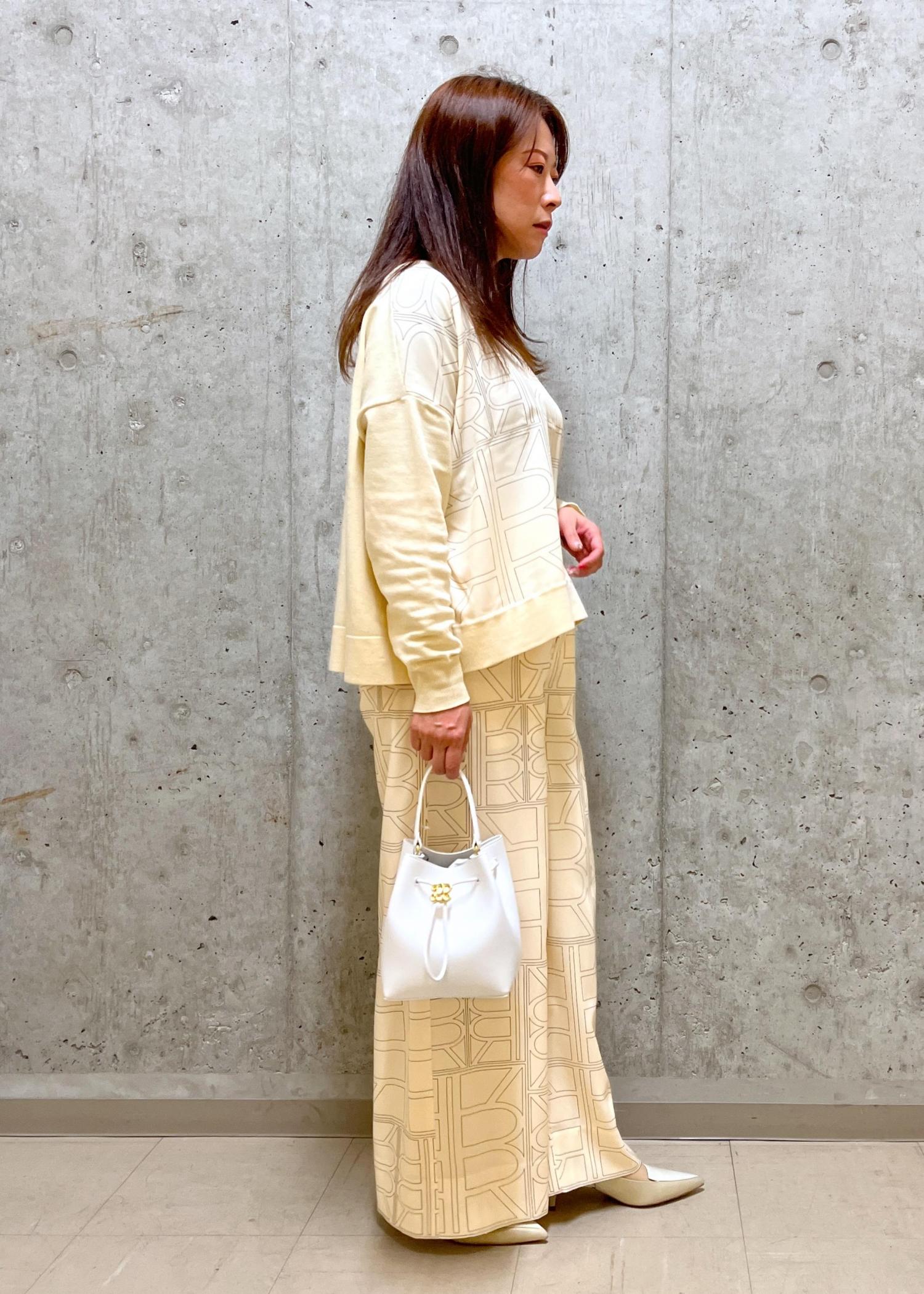 モノグラムプリントがオシャレでシンプルになりすぎないワントーンコーデです。