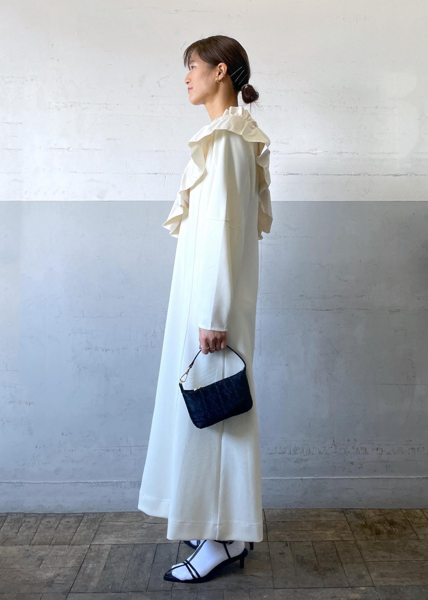 フリルのデザインが可愛いラッフルスカーフとシンプルなワンピースがセットになっているアイテムです。