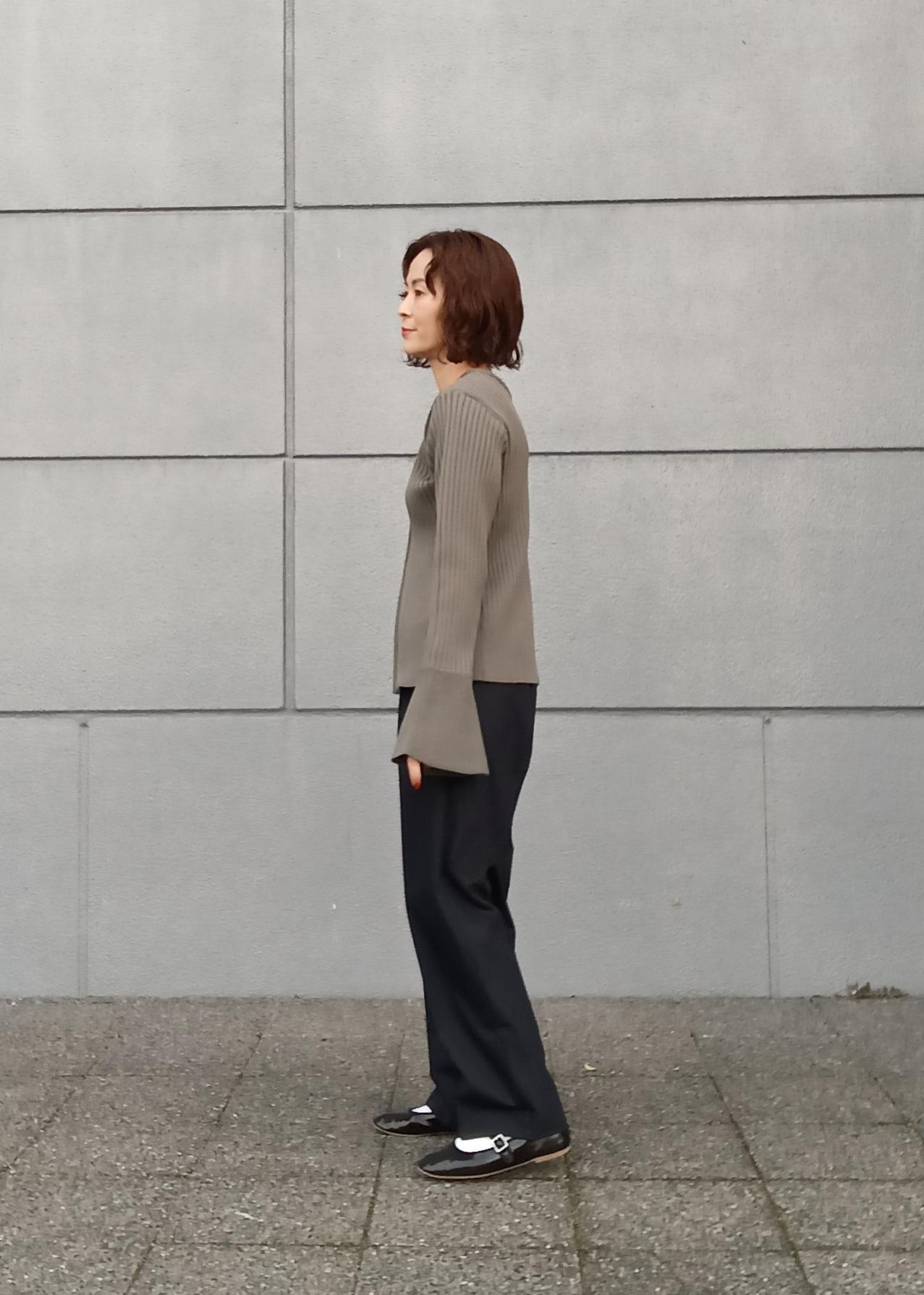 程よく細身なリブのZIPカーディガンを合わせてスタイルアップを意識したスタイリングです。