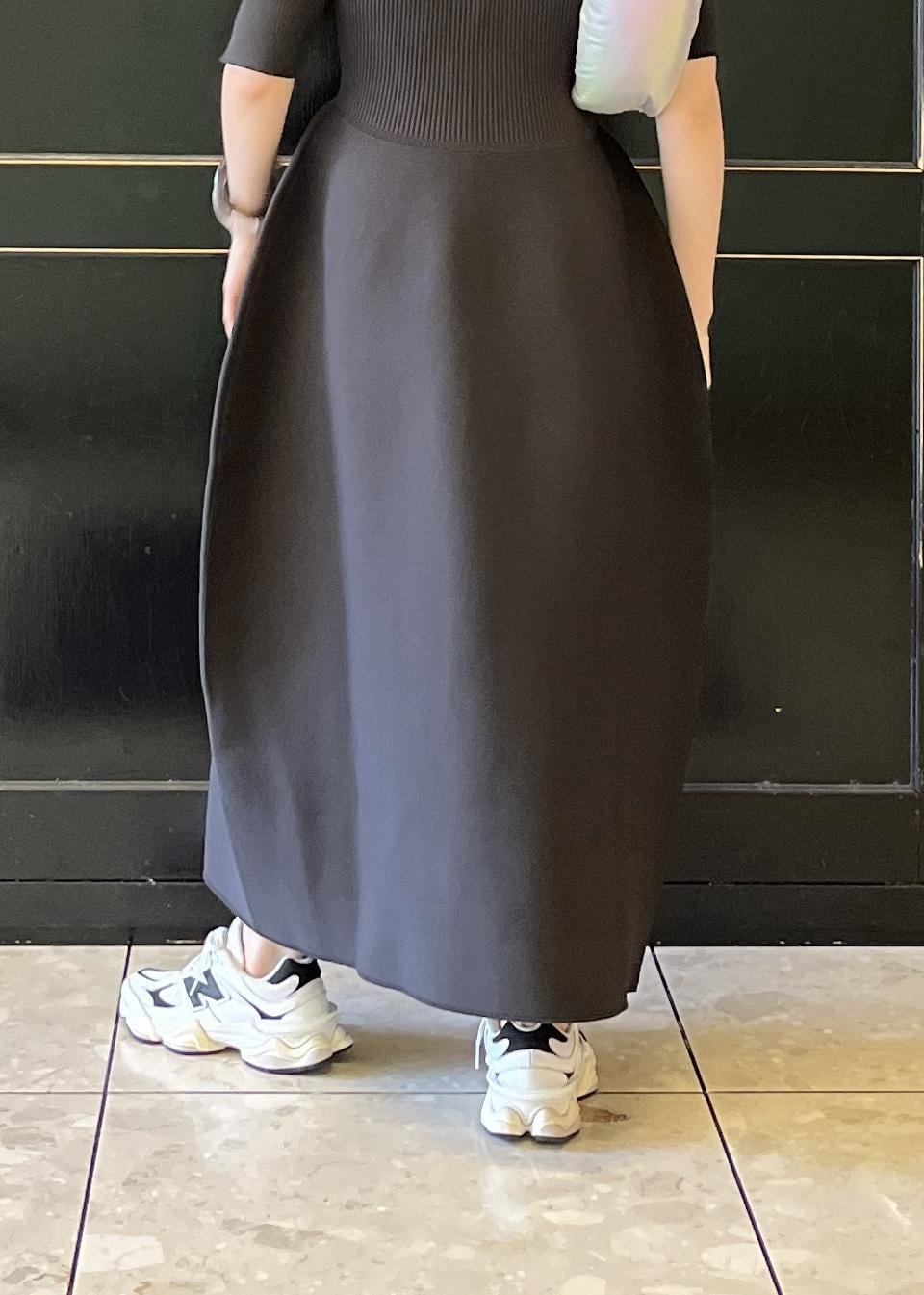 こちらのワンピース、上半身はピタッとしたシルエットですが、繋ぎ目がなく伸縮性が抜群なので着心地◎