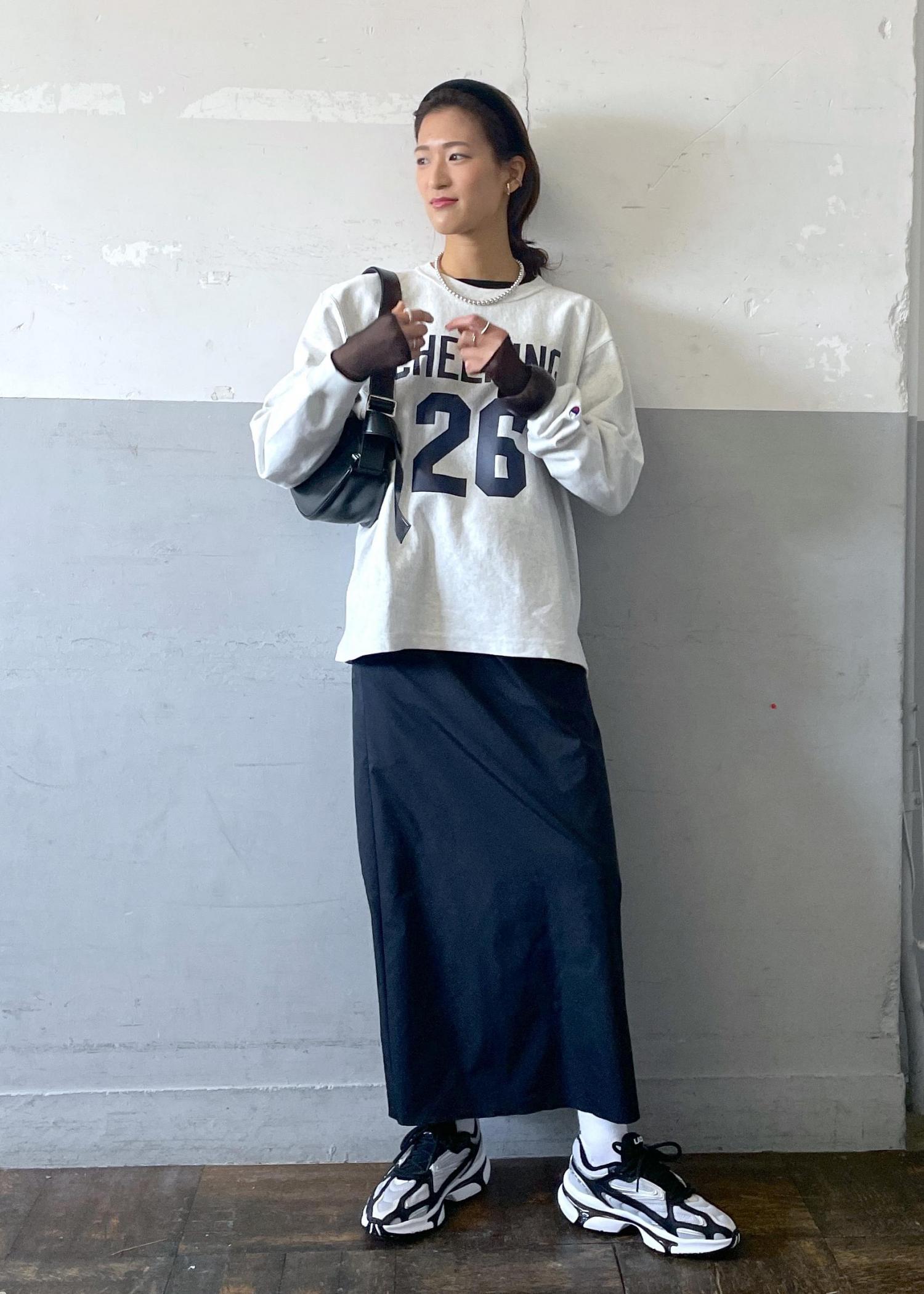 私はシアーアイテムとレイヤードし、ボトムはシンプルにタイトスカートとコーディネートしてみました。