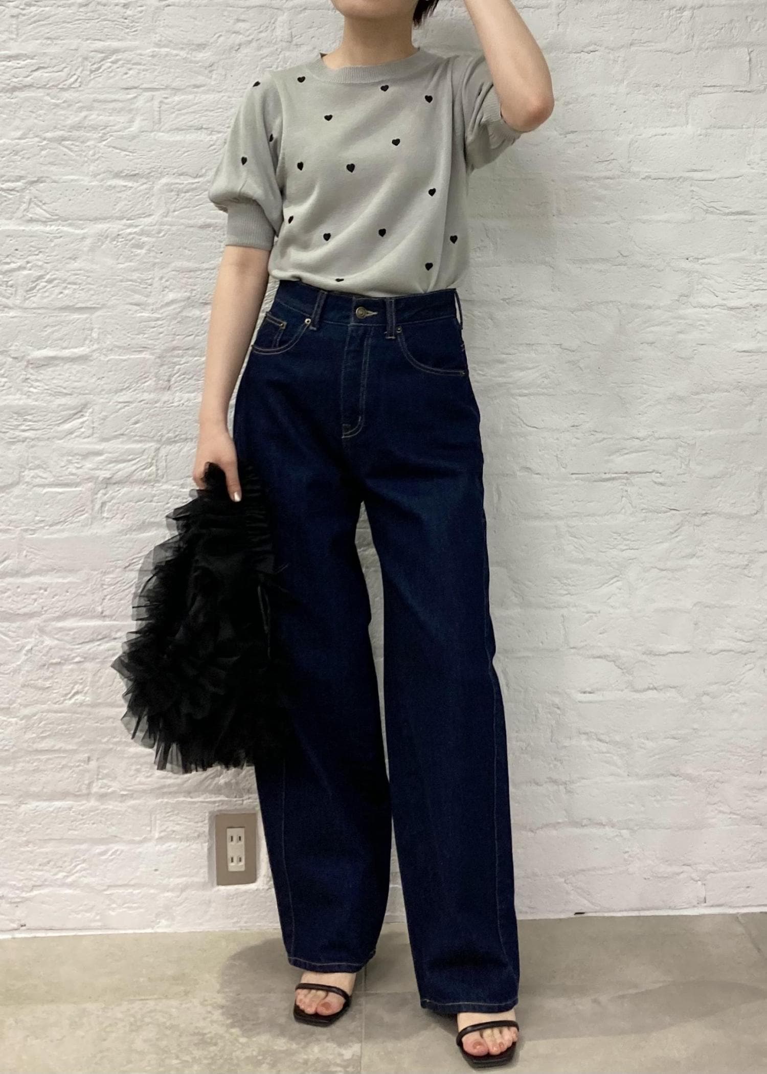 ×カジュアルなデニムのシンプルコーデに、トレンド感満載のチュールバッグをアクセントに。