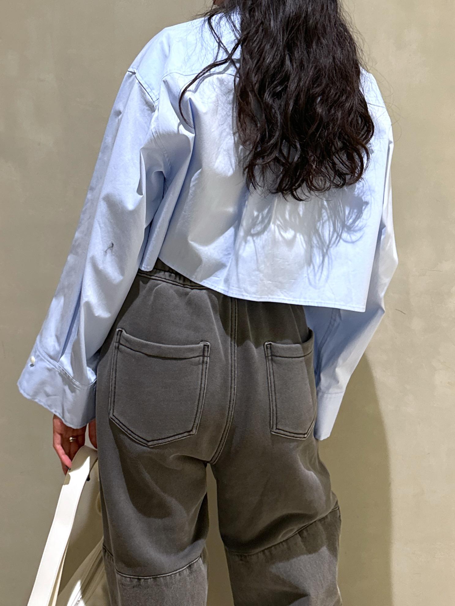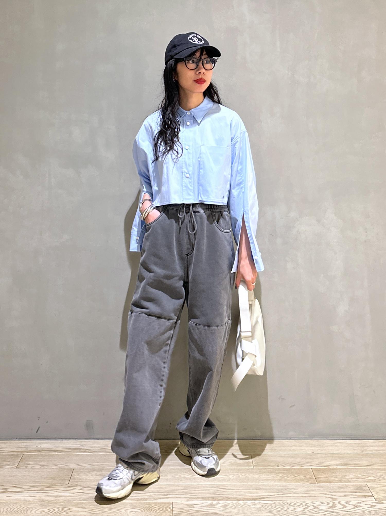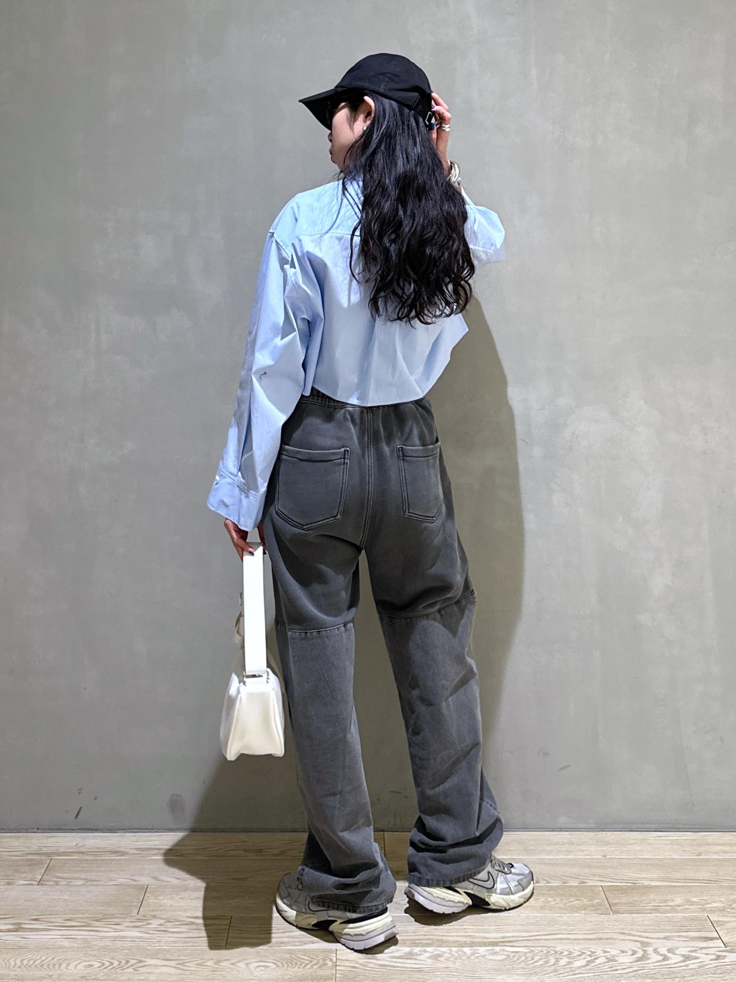 パンツはスエットとデニムがドッキングされたとてもお洒落なパンツです!かなり長めなのでヒールやボリュームソールのシューズと合わせて裾にポテッとたまる感じでお召し頂くかロールアップしても素敵でした◎