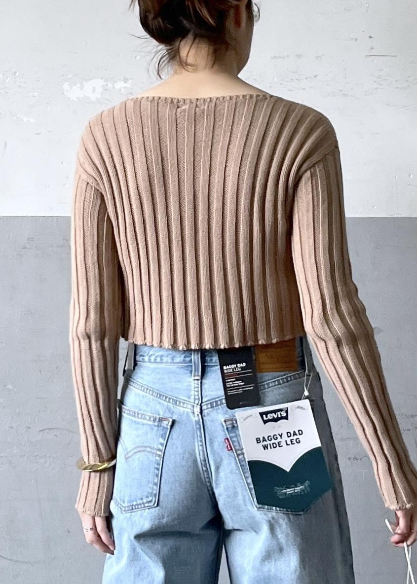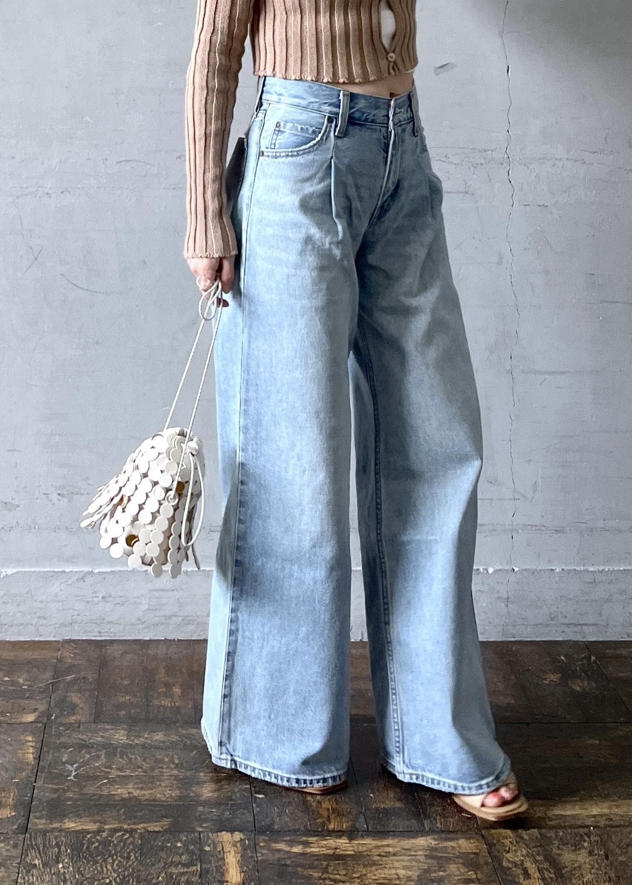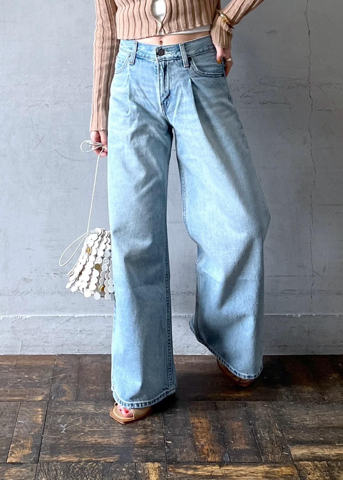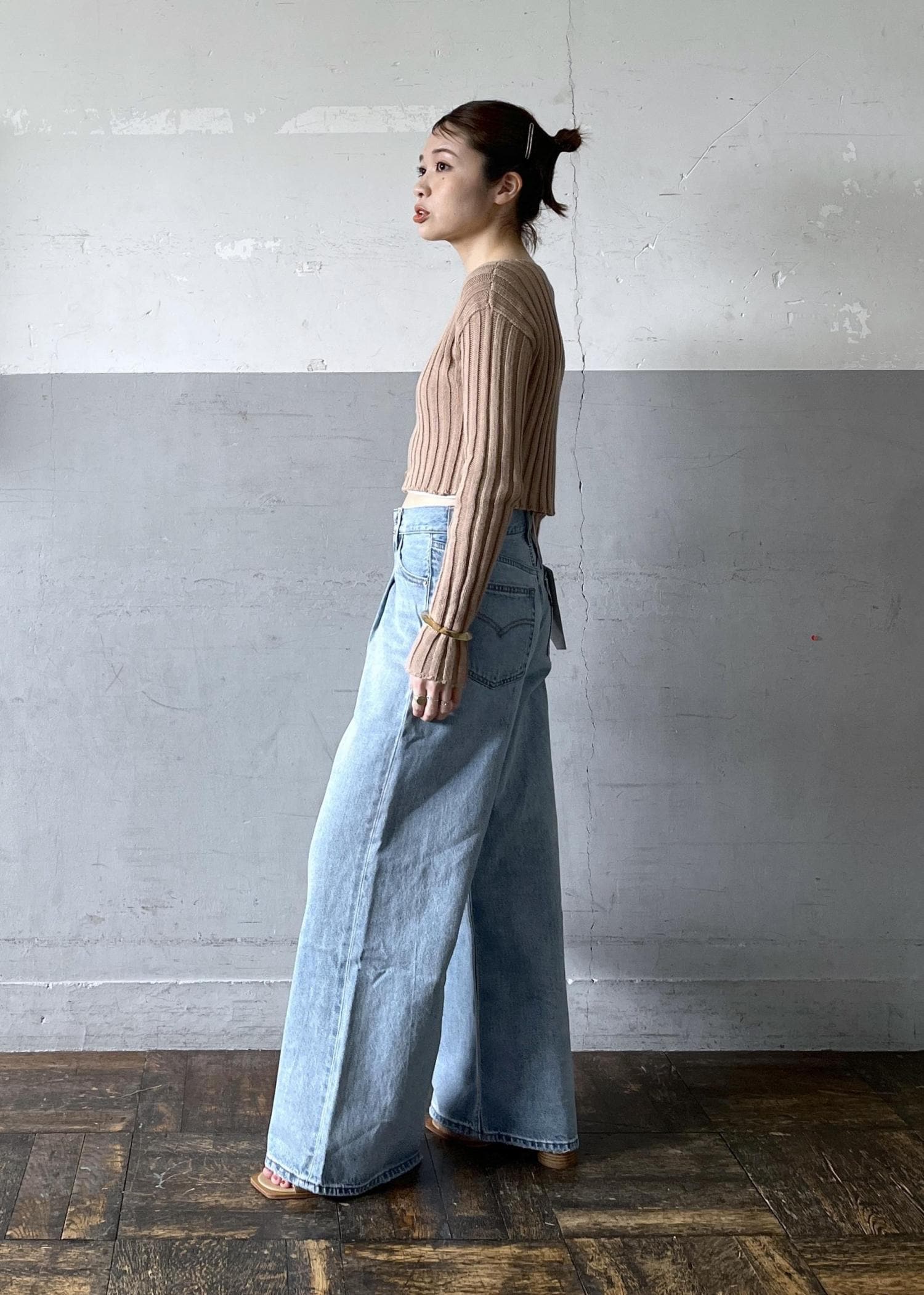 元々ローライズなのですが、トップスをクロップド丈で合わせたのでお臍少し下まで上げて着用しました。