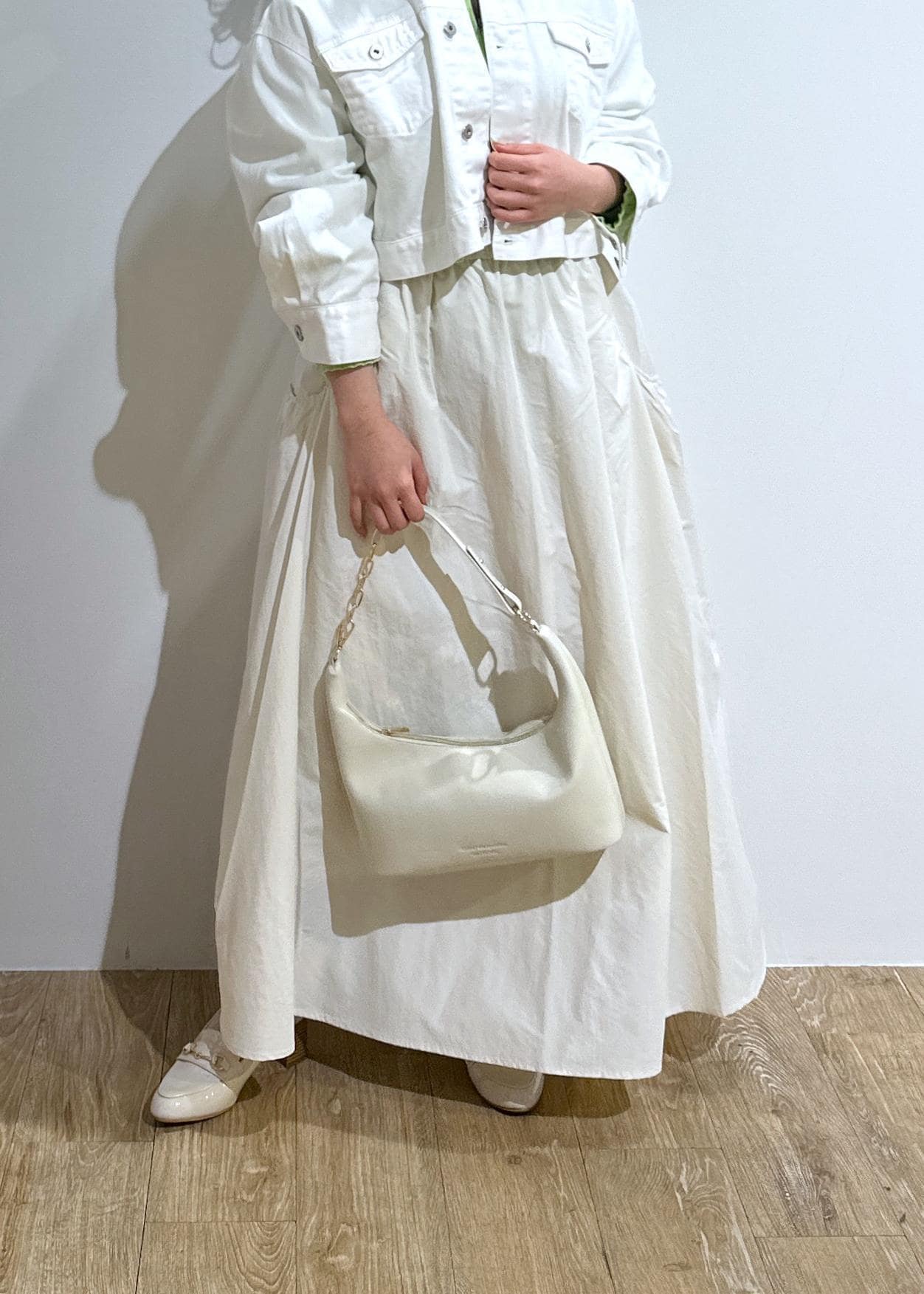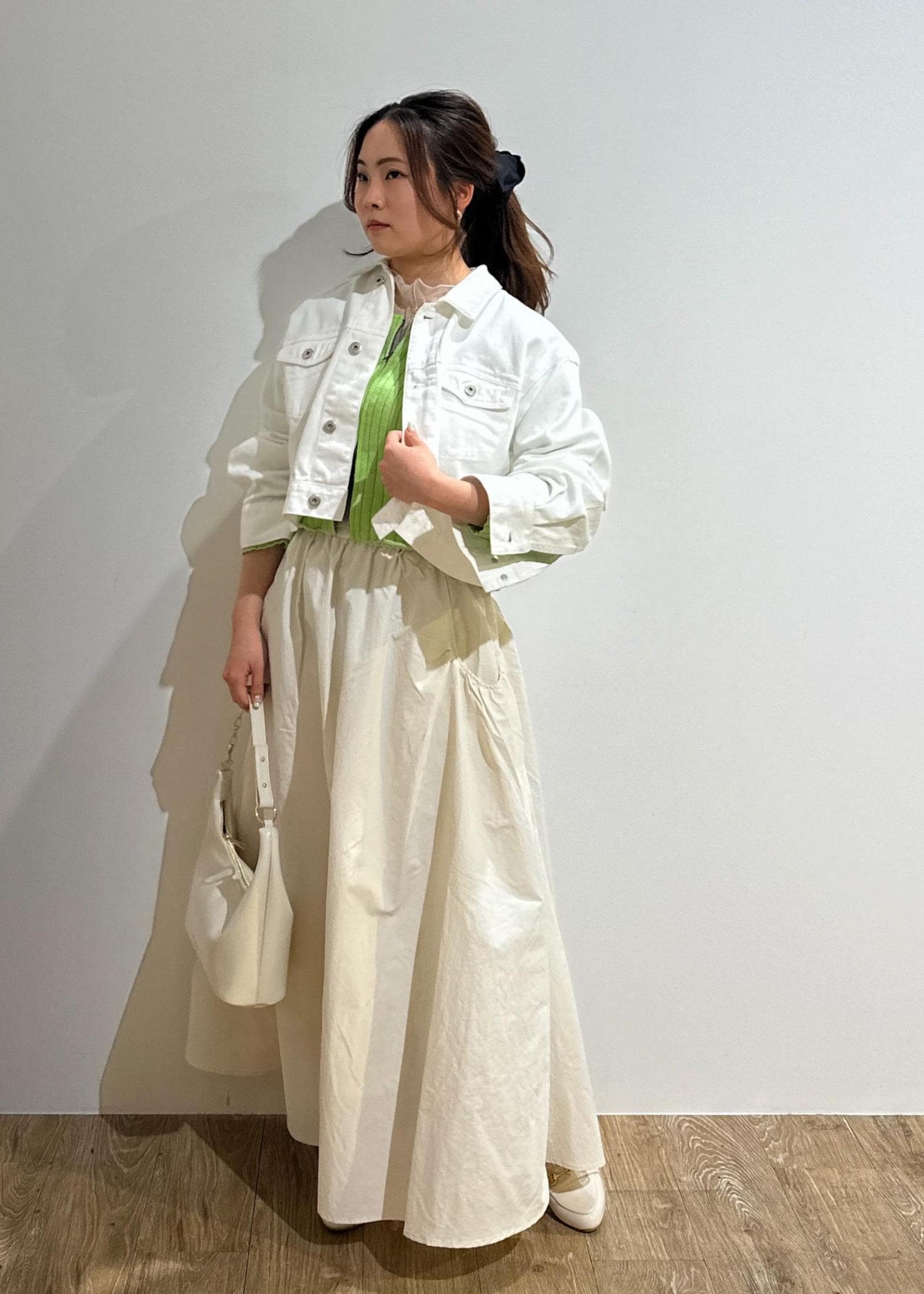 ホワイトデニムのジャケットに、トレンド感のあるナイロンスカートを合わせました。