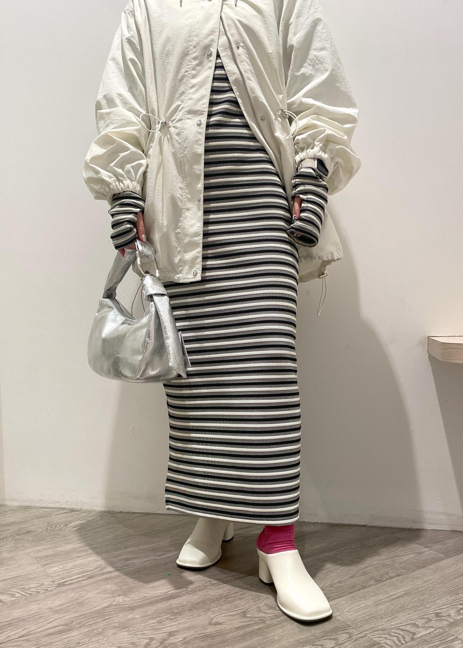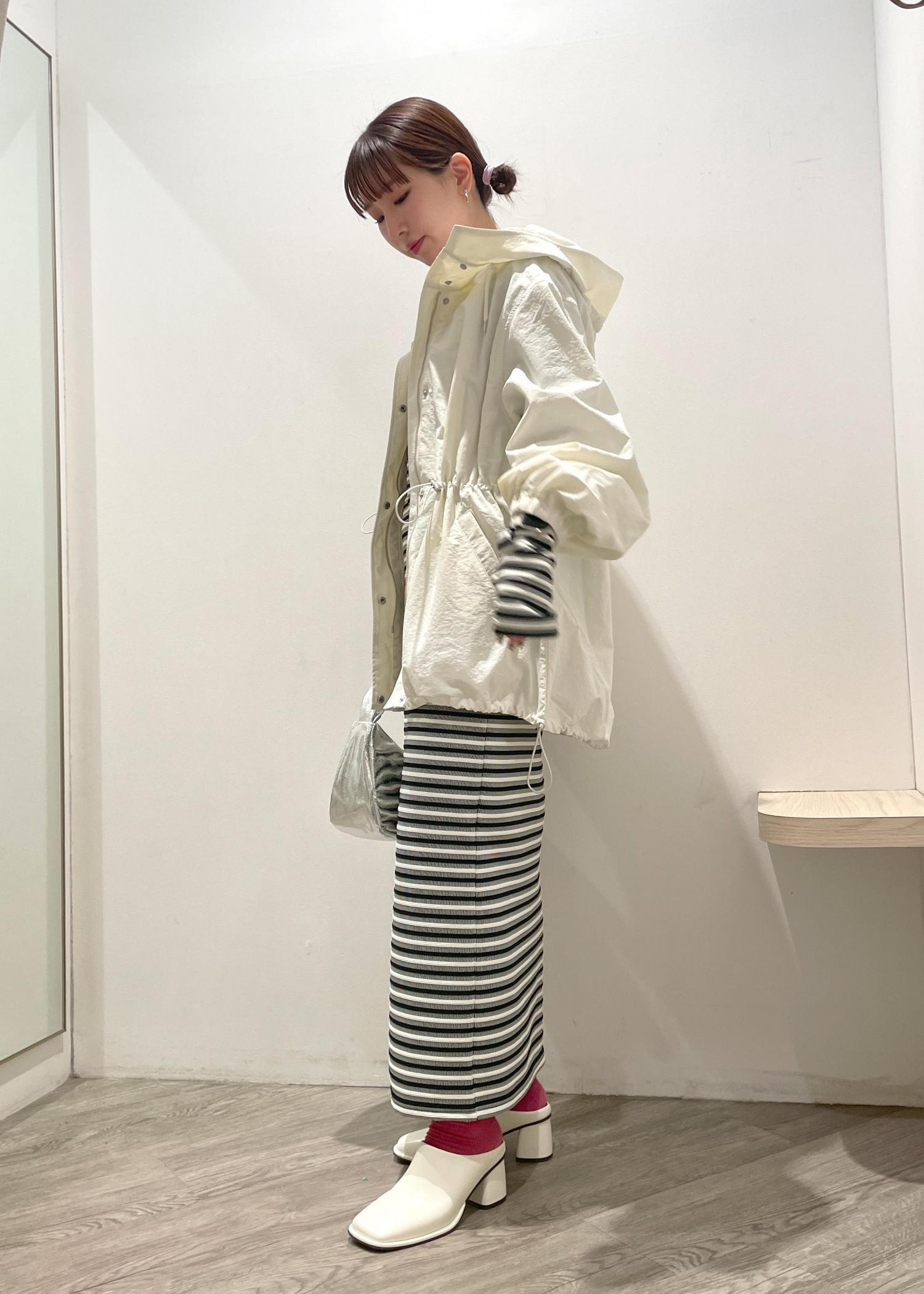 カジュアルになりすぎないようにワンピースやスカートと合わせるのもおすすめです!