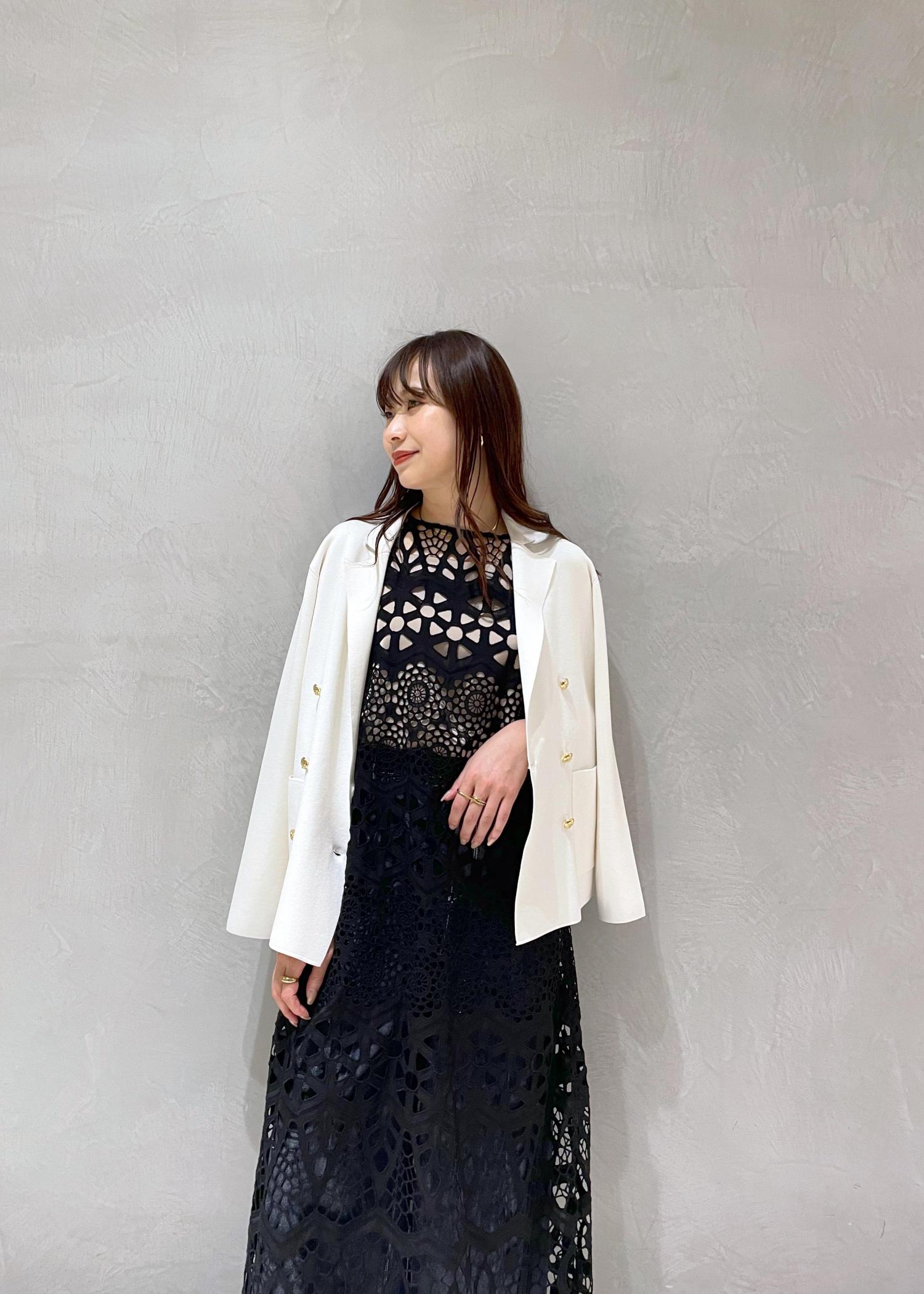 レースワンピにデニムを合わせただけだと少しカジュアル過ぎてしまうのでジャケットを肩掛けに。夏場は冷房対策にも!
