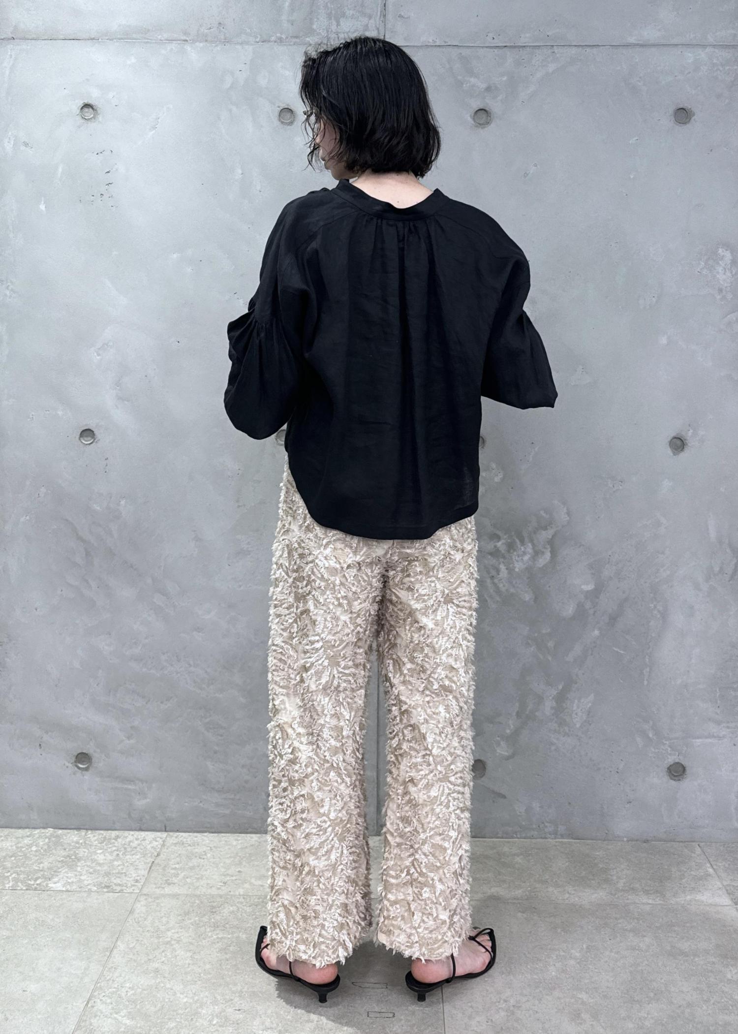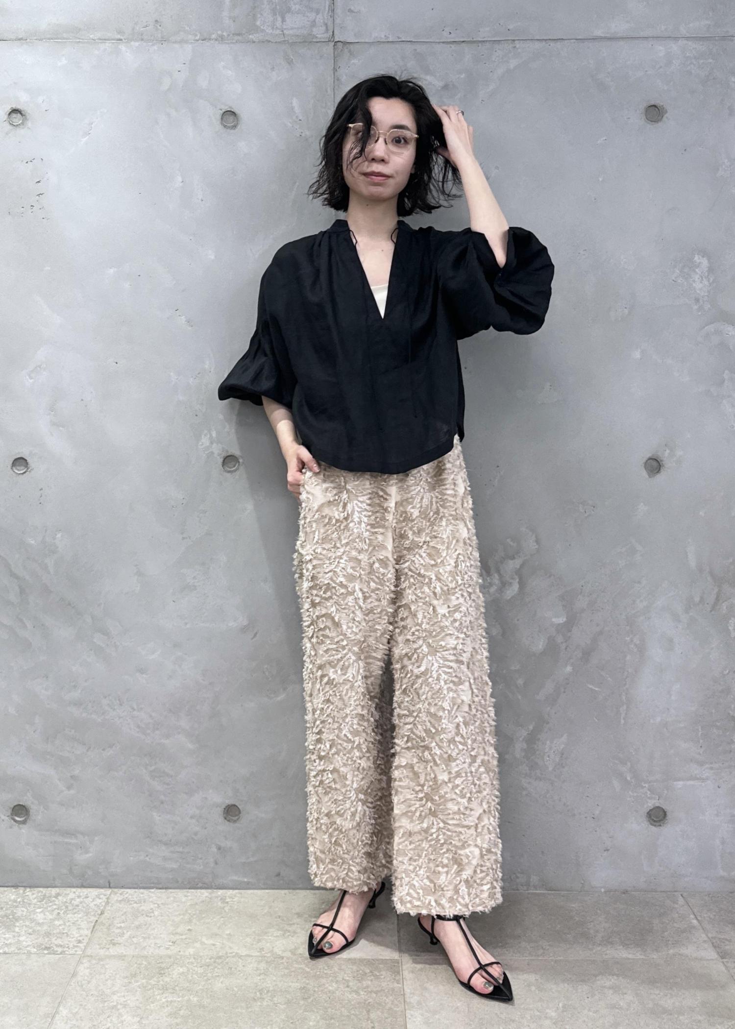 ふわっとした羽のような糸、光に反射する光沢のある糸様な素材を贅沢に使用し、トレンドのジャガードのなかでもかなり高級感のある見た目。華やかなセレモニーシーンでの着用もおすすめです。