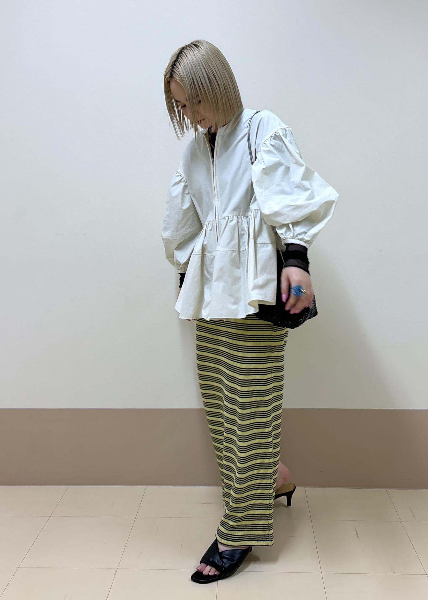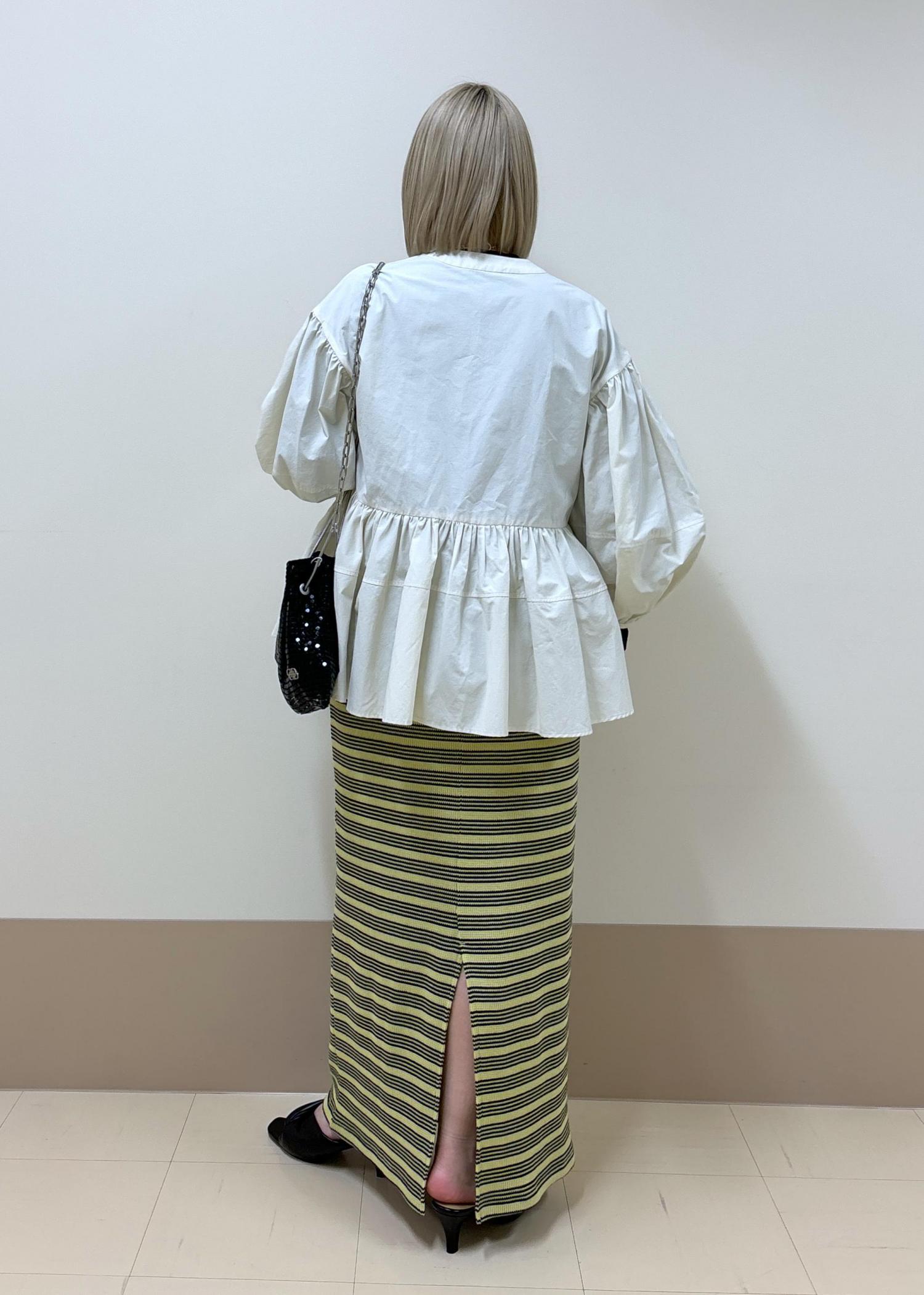 ペプラムのシルエットとお袖のパフスリーブが女性らしさを出し、コーデを一気に華やかにしてくれます。