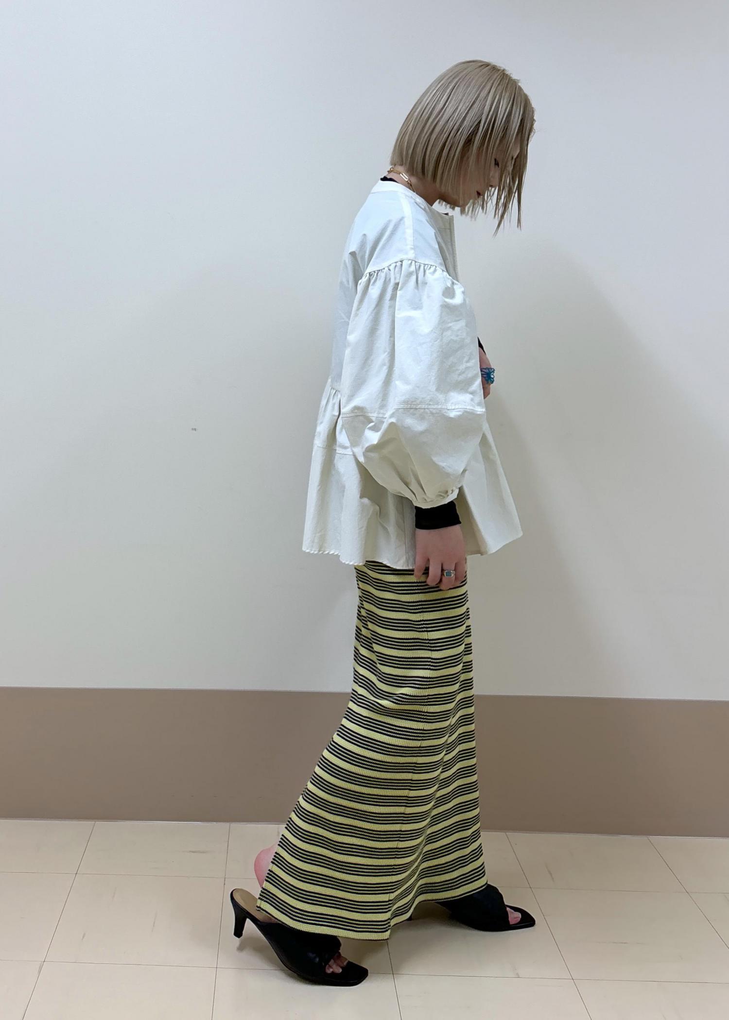 首周りや腰より上部分は、すっきりとしたデザインなのでボトムスも流行りのワイドデニムパンツでカジュアルに合わせたり、スッキリとしたタイトめなワンピースとも相性が良く、いろいろな雰囲気で着て頂けると思います。