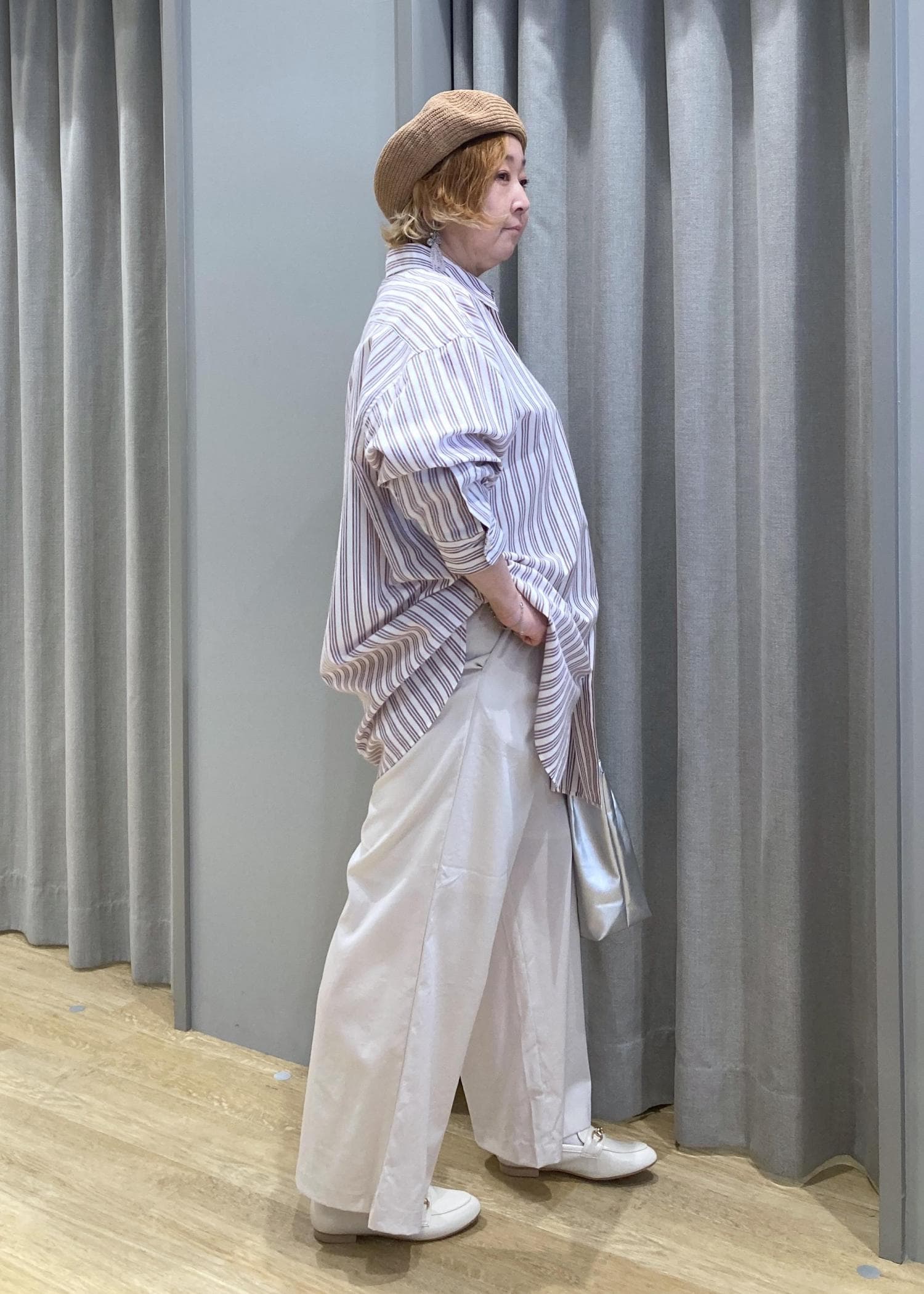 体系をすっぽり隠してくれる、オーバーサイズのシャツです。