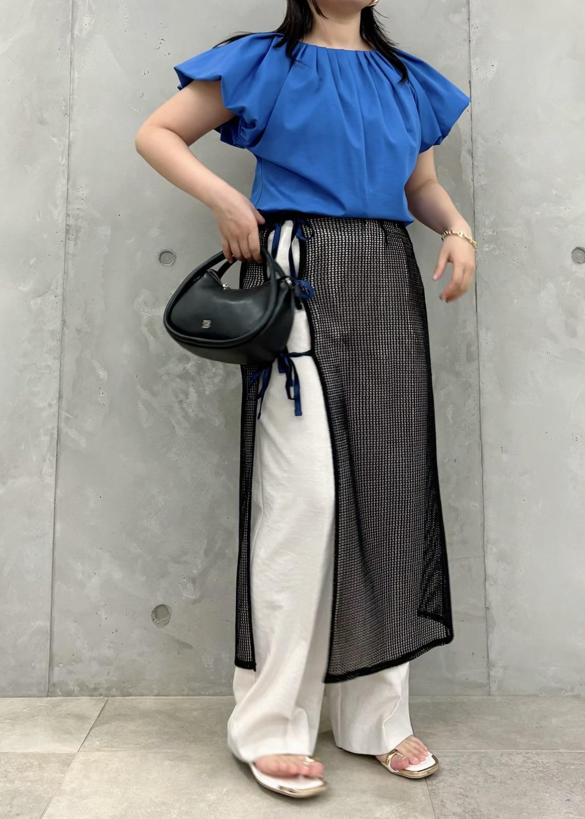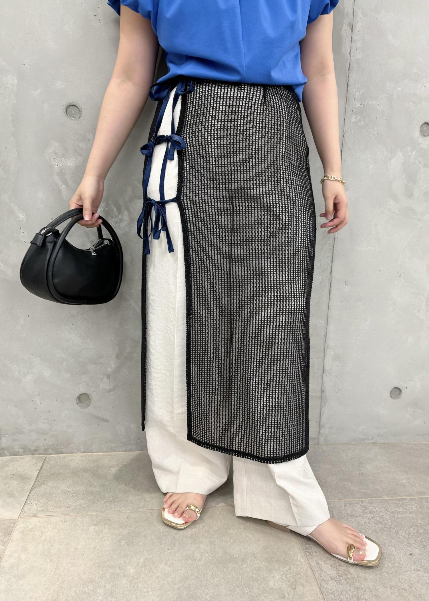 シンプルなワイドパンツにメッシュのラップスカートを重ねてみました!