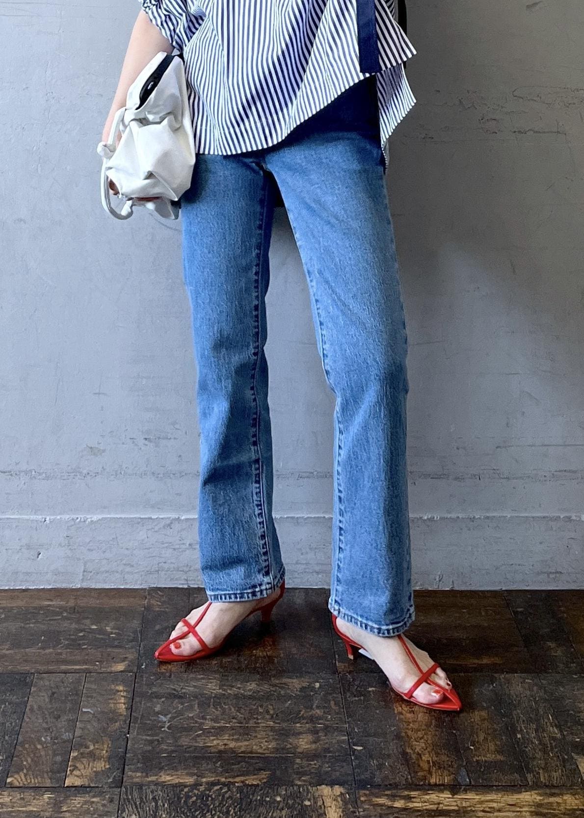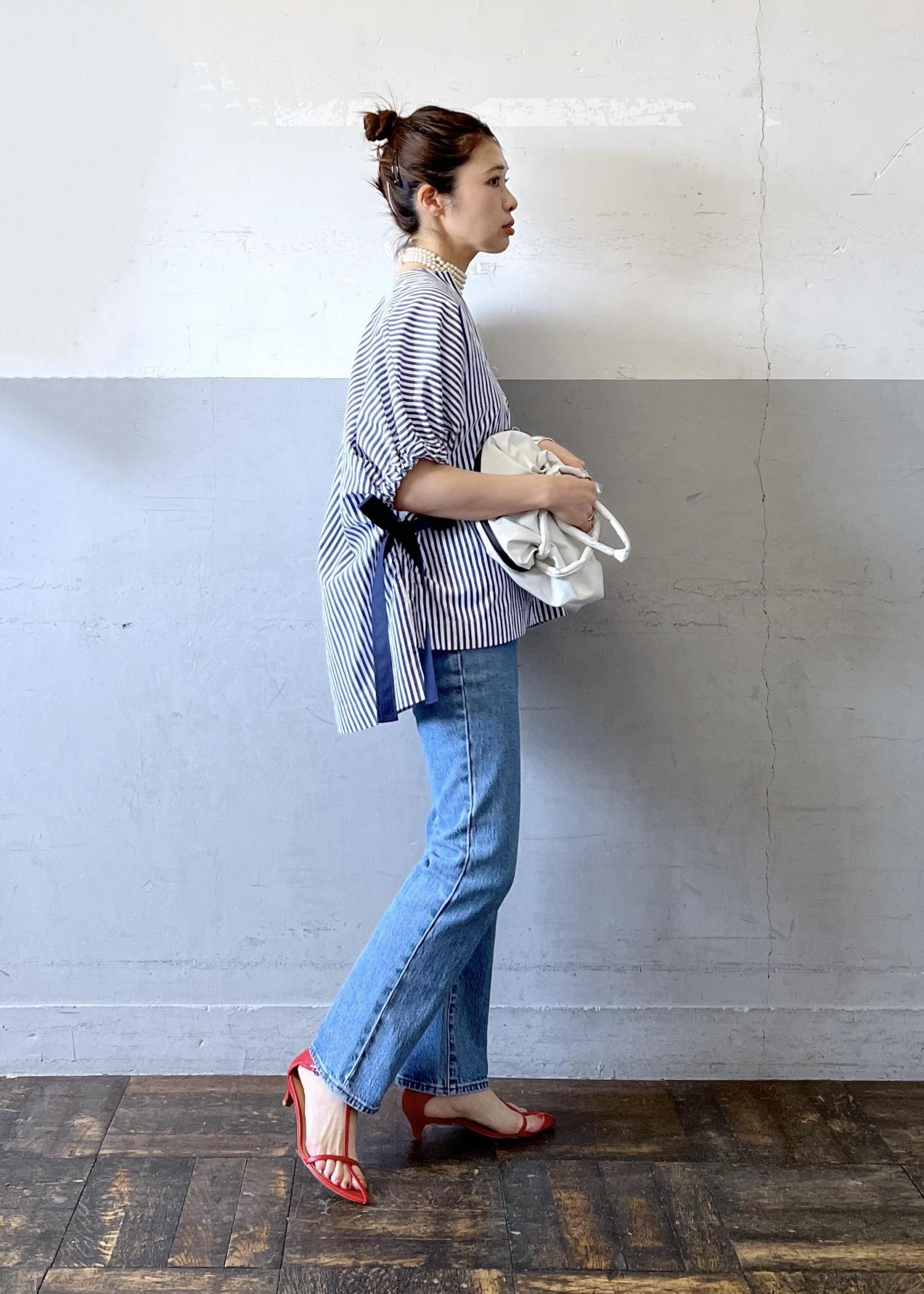 ちょっとマリンっぽさのある爽やかスタイリングや!と思ったので足元は赤をチョイス。